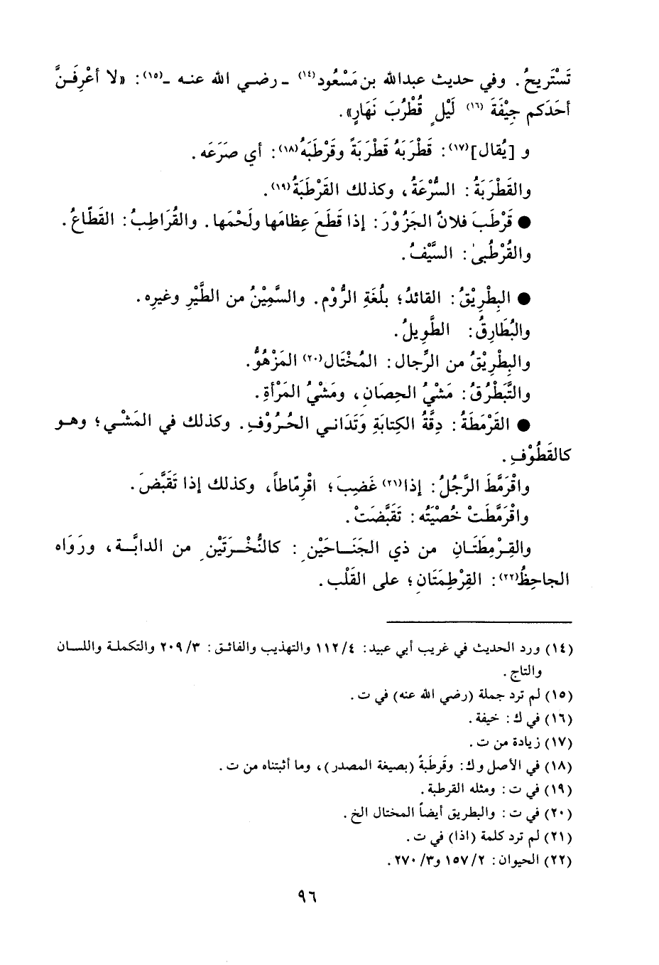 تَسْتَريحُ . وفي حديث عبد الله بن مَسْعُود - رضي الله عنه - ' لا أعْرِفَنَّ أحَدَكم جِيْفَةَ لَيْلٍ قُطْرُبَ نَهَارٍ ' . ويُقال : قَطْرَبَة قَطْرَبَةً وقَرْطَبَهُ : أي صَرَعَه . والقَطْرَبَةُ : السُّرْعَةُ ، وكذلك القَرْطَبَةُ . قَرْطَبَ فلانٌ الجَزُوْرَ إذا قَطَعَ عِظامَها ولَحْمَها . والقُرَاطِبُ القَطّاعُ . والقُرْطُبى : السَّيْفُ . البِطْرِيْقُ القائدُ بلُغَةِ الرُّوْم . والسَّمِيْنُ من الطَّيْرِ وغيرِه . والبُطَارِقُ : الطَّوِيلُ . والبِطْرِيْقُ من الرِّجال : المُخْتَال المَزْهُوُّ . والتَبَطْرُقُ : مَشْيُ الحِصَانِ ، ومَشْيُ المَرْأةِ . القَرْمَطَةُ دِقَةُ الكِتابَةِ وَتَدَاني الحُرُوْفِ . وكذلك في المَشْي وهو كالقَطُوْفِ . واقْرَمَّطَ الرَّجُلُ : إذا غَضِبَ ، اقْرِمّاطاً ، وكذلك إذا تَقَبَّضَ . واقْرَمَّطَتْ خُصْيَتُه : تَقَبَّضَتْ . والقِرْمِطَتَانِ من ذي الجَنَاحَيْن : كالنُّخْرَتَيْن من الدابَّة ، ورَوَاه الجاحِظُ : القِرْطِمَتَانِ ، على القَلْب .