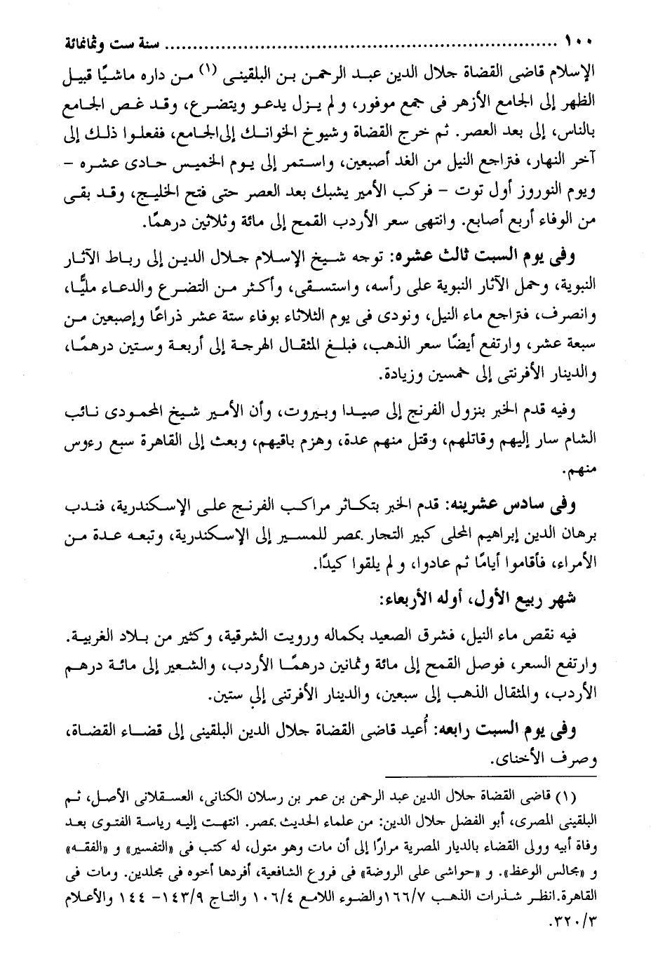 الْإِسْلَام قَاضِي الْقُضَاة جلال الدّين عبد الرَّحْمَن بن البُلْقِينِيّ من دَاره مَاشِيا قبيل الظّهْر إِلَى الْجَامِع الْأَزْهَر فِي جمع موفور وَلم يزل يَدْعُو ويتضرع وَقد غص الْجَامِع بِالنَّاسِ إِلَى بعد الْعَصْر. ثمَّ خرج الْقُضَاة وشيوخ الخوانك إِلَى الْجَامِع فَفَعَلُوا ذَلِك إِلَى آخر النَّهَار فتراجع النّيل من الْغَد إِصْبَعَيْنِ وَاسْتمرّ إِلَى يَوْم الْخَمِيس حادي عاشره - وَيَوْم النوروز أول توت - فَركب الْأَمِير يشبك بعد الْعَصْر حَتَّى فتح الخليج وَقد بَقِي من الْوَفَاء أَربع أَصَابِع. وانتهي سعر الأردب الْقَمْح إِلَى مائَة وَثَلَاثِينَ درهما. وَفِي يَوْم السبت ثَالِث عشره: توجه شيخ الْإِسْلَام جلال الدّين إِلَى رِبَاط الْآثَار النَّبَوِيَّة وَحمل الْآثَار النَّبَوِيَّة على رَأسه واستسقى وَأكْثر من التضرع وَالدُّعَاء مَلِيًّا وَانْصَرف فتراجع مَاء النّيل وَنُودِيَ فِي يَوْم الثُّلَاثَاء بوفاء سِتَّة عشر ذِرَاعا وإصبعين من سَبْعَة عشر وارتفع أَيْضا سعر الذَّهَب فَبلغ المثقال الهرجة إِلَى أَرْبَعَة وَسِتِّينَ درهما وَالدِّينَار الأفرنتي إِلَى خمسين وَزِيَادَة. وَفِيه قدم الْخَبَر بنزول الفرنج إِلَى صيدا وبيروت وَأَن الْأَمِير شيخ المحمودي نَائِب الشَّام سَار إِلَيْهِم وَقَاتلهمْ وَقتل مِنْهُم عدَّة وَهزمَ باقيهم وَبعث إِلَى الْقَاهِرَة سبع رُءُوس مِنْهُم. وَفِي سادس عشرينه: قدم الْخَبَر بتكاثر مراكب الفرنج على الْإسْكَنْدَريَّة فندب برهَان الدّين إِبْرَاهِيم الْمحلي كَبِير التُّجَّار بِمصْر للمسير إِلَى الْإسْكَنْدَريَّة وَتَبعهُ عدَّة من الْأُمَرَاء فأقاموا أَيَّامًا ثمَّ عَادوا وَلم يلْقوا كيداً. شهر ربيع الأول أَوله الْأَرْبَعَاء. فِيهِ نقص مَاء النّيل فشرق الصَّعِيد بِكَمَالِهِ وَرويت الشرقية وَكثير من بِلَاد الغربية وارتفع السّعر فوصل الْقَمْح إِلَى مائَة وَثَمَانِينَ درهما الأردب وَالشعِير إِلَى مائَة دِرْهَم الأردب والمثقال الذَّهَب إِلَى سبعين وَالدِّينَار الأفرتني إِلَى سِتِّينَ. وَفِي يَوْم السبت رابعه: أُعِيد قَاضِي الْقُضَاة جلال الدّين البُلْقِينِيّ إِلَى قَضَاء الْقُضَاة وَصرف الأخناي.