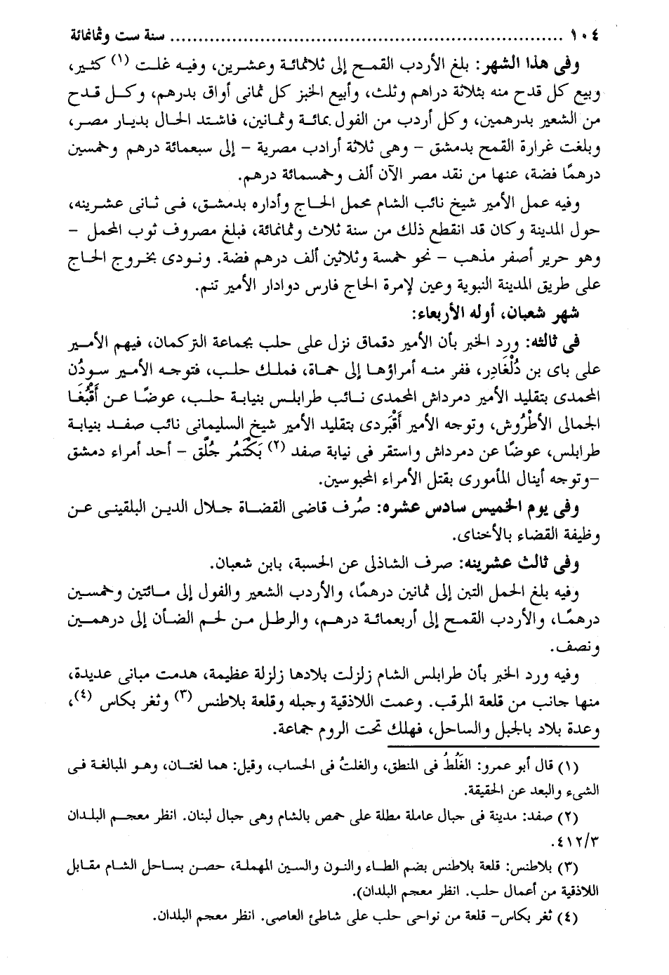 وَفِي هَذَا الشَّهْر: بلغ الأردب الْقَمْح إِلَى ثَلَاثمِائَة وَعشْرين وَفِيه علت كثير وَبيع كل قدح مِنْهُ بِثَلَاثَة دَرَاهِم وَثلث وأبيع الْخبز كل ثَمَانِي أَوَاقٍ بدرهم وكل قدح من الشّعير بِدِرْهَمَيْنِ وكل أردب من الفول بِمِائَة وَثَمَانِينَ فَاشْتَدَّ الْحَال بديار مصر وَبَلغت غرارة الْقَمْح بِدِمَشْق - وَهِي ثَلَاثَة أرادب مصرية - إِلَى سَبْعمِائة دِرْهَم وَخمسين درهما فضَّة عَنْهَا من نقد مصر الْآن ألف وَخَمْسمِائة دِرْهَم. وَفِيه عمل الْأَمِير شيخ نَائِب الشَّام محمل الْحَاج وأداره بِدِمَشْق فِي ثَانِي عشرينه حول الْمَدِينَة وَكَانَ قد انْقَطع ذَلِك من سنة ثَلَاث وَثَمَانمِائَة مبلغ مَصْرُوف ثوب الْمحمل - وَهُوَ حَرِير أصفر مَذْهَب - نَحْو خَمْسَة وَثَلَاثِينَ ألف دِرْهَم فضَّة. وَنُودِيَ بِخُرُوج الْحَاج على طَرِيق الْمَدِينَة النَّبَوِيَّة وَعين لإمرة الْحَاج فَارس دوادار الْأَمِير تنم. شهر شعْبَان أَوله الْأَرْبَعَاء: فِي ثالثه: ورد الْخَبَر بِأَن الْأَمِير دقماق نزل على حلب بِجَمَاعَة التركمان فيهم الْأَمِير على باي بن دلغادر ففر مِنْهُ أمراؤها إِلَى حماة فَملك حلب فَتوجه الْأَمِير سودن المحمدي بتقليد الْأَمِير دمرداش المحمدي نَائِب طرابلس بنيابة حلب عوضا عَن أقبغا الجمالي الأطروش وَتوجه الْأَمِير أقبردي بتقليد الْأَمِير شيخ السُّلَيْمَانِي نَائِب صفد بنيابة طرابلس عوضا عَن دمرداش وَاسْتقر فِي نِيَابَة صفد بكتمر جلق - أحد أُمَرَاء دمشق - وَتوجه أينال المأموري بقتل الْأُمَرَاء المحبوسين. وَفِي يَوْم الْخَمِيس سادس عشره: صرف قَاضِي الْقُضَاة جلال الدّين البُلْقِينِيّ عَن وَظِيفَة الْقَضَاء بالأخناي. وَفِي ثَالِث عشرينه: صرف الشاذلي عَن الْحِسْبَة بِابْن شعْبَان. وَفِيه بلغ الْحمل التِّبْن إِلَى ثَمَانِينَ درهما والأردب الشّعير والفول إِلَى مِائَتَيْنِ وَخمسين درهما والأردب الْقَمْح إِلَى أَرْبَعمِائَة دِرْهَم والرطل من لحم الضان إِلَى دِرْهَمَيْنِ وَنصف. وَفِيه ورد الْخَبَر بِأَن طرابلس الشَّام زلزلت بلادها زَلْزَلَة عَظِيمَة هدمت مباني عديدة مِنْهَا جَانب من قلعة المرقب. وعمت اللاذقية وجبلة وقلعة بلاطنس وثغر بكاس وعدة بِلَاد بِالْجَبَلِ والساحل، فَهَلَك تَحت الرّوم جمَاعَة.