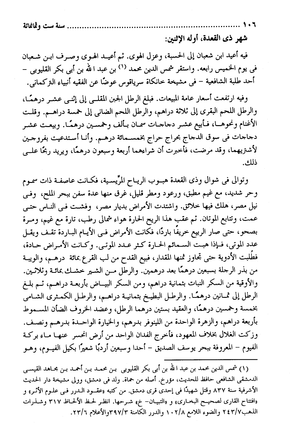 شهر ذِي الْقعدَة أَوله الِاثْنَيْنِ. فِيهِ أُعِيد ابْن شعْبَان إِلَى الْحِسْبَة وعزل الْهوى ثمَّ أُعِيد الْهوى وَصرف ابْن شعْبَان فِي يَوْم الْخَمِيس رابعه. وَاسْتقر شمس الدّين مُحَمَّد بن عبد الله بن أبي بكر القليوبي - أحد طلبة الشَّافِعِيَّة - فِي مشيخة خانكاة سرياقوس عوضا عَن الْفَقِيه أَنْبيَاء التركماني. وَفِيه ارْتَفَعت أسعار عَامَّة المبيعات. فَبلغ الرطل الْجُبْن المقلي إِلَى اثْنَي عشر درهما والرطل اللَّحْم البقري إِلَى ثَلَاثَة دَرَاهِم والرطل اللَّحْم الضاني إِلَى خَمْسَة دَرَاهِم. وَقلت الأغنام وَنَحْوهَا فأبيع عشر دجاجات سمان بِأَلف وَخمسين درهما. وبيعت عشر دجاجات فِي سوق الدَّجَاج بحراج حراج بِخَمْسِمِائَة دِرْهَم. وَأَنا أستدعيت بفروجين لأشتريهما وَقد مَرضت فَأخْبرت أَن شراءهما أَرْبَعَة وَسَبْعُونَ درهما وَيُرِيد ربحا على ذَلِك. وتوالى فِي شَوَّال وَذي الْقعدَة هبوب الرِّيَاح المريسية فَكَانَت عَاصِفَة ذَات سموم وحر شَدِيد مَعَ غيم مطبق ورعود ومطر قَلِيل غرق مِنْهَا عدَّة سفن ببحر الْملح وَفِي نيل مصر هلك فِيهَا خلائق. واشتدت الْأَمْرَاض بديار مصر وفشت فِي النَّاس حَتَّى عَمت وتتابع الموتان. ثمَّ عقب هَذَا الرّيح الحارة هَوَاء شمَالي رطب تَارَة مَعَ غيم وَمرَّة بصحو حَتَّى صَار الرّبيع خَرِيفًا بَارِدًا فَكَانَت الْأَمْرَاض فِي الْأَيَّام الْبَارِدَة تقف ويقل عدد الْمَوْتَى فَإِذا هبت السمائم الحارة كثر عدد الْمَوْتَى. وَكَانَت الْأَمْرَاض حادة فطلبت الْأَدْوِيَة حَتَّى تجَاوز ثمنهَا الْمِقْدَار فَبيع الْقدح من لب القرع بِمِائَة دِرْهَم والويبة من بذر الرجلة بسبعين درهما بعد دِرْهَمَيْنِ. والرطل من الشير خشك بِمِائَة وَثَلَاثِينَ. وَالْأُوقِية من السكر النَّبَات بِثمَانِيَة دَرَاهِم وَمن السكر الْبيَاض بأَرْبعَة دَرَاهِم ثمَّ بلغ الرطل إِلَى ثَمَانِينَ درهما. والرطل الْبِطِّيخ بِثمَانِيَة دَرَاهِم والرطل الكمثري الشَّامي بِخَمْسَة وَخمسين درهما والعقيد بستين درهما الرطل وعضد الخروف الضَّأْن المسموط بأَرْبعَة دَرَاهِم والزهرة الْوَاحِدَة من اللينوفر بدرهم والخيارة الْوَاحِدَة بدرهم وَنصف. وزكت الغلال بِخِلَاف الْمَعْهُود فَأخْرج الفدان الْوَاحِد من أَرض انحسر عَنْهَا مَاء بركَة الفيوم - الْمَعْرُوفَة ببحر يُوسُف الصّديق - أحدا وَسبعين أردباً شَعِيرًا بكيل الفيوم وَهُوَ