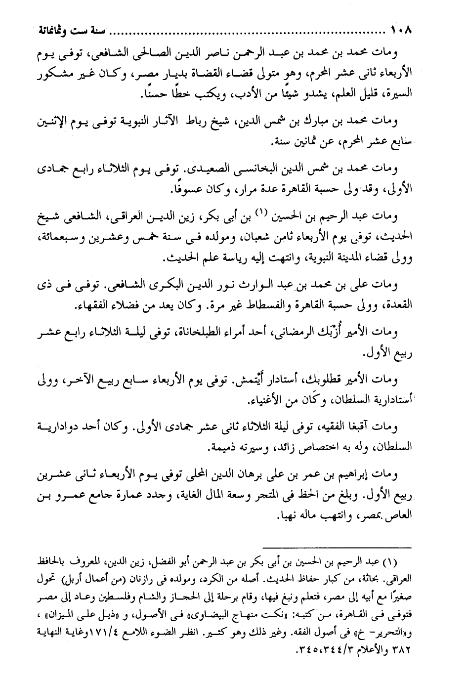 وَمَات مُحَمَّد بن مُحَمَّد بن عبد الرَّحْمَن نَاصِر الدّين الصَّالِحِي الشَّافِعِي توفّي يَوْم الْأَرْبَعَاء ثَانِي عشر الْمحرم وَهُوَ مُتَوَلِّي قَضَاء الْقُضَاة بديار مصر وَكَانَ غير مشكور السِّيرَة قَلِيل الْعلم يشدو وَمَات مُحَمَّد بن مبارك بن شمس الدّين شيخ رِبَاط الْآثَار النَّبَوِيَّة توفّي يَوْم الِاثْنَيْنِ سَابِع عشر الْمحرم عَن ثَمَانِينَ سنة. وَمَات مُحَمَّد بن شمس الدّين البخانسي الصعيدي. توفّي يَوْم الثُّلَاثَاء رَابِع جُمَادَى الأولى وَقد ولي حسبَة الْقَاهِرَة عدَّة مرار وَكَانَ عسوفاً. وَمَات عبد الرَّحِيم بن الْحُسَيْن بن أبي بكر زين الدّين الْعِرَاقِيّ الشَّافِعِي شيخ الحَدِيث توفّي يَوْم الْأَرْبَعَاء ثامن شعْبَان ومولده فِي سنة خمس وَعشْرين وَسَبْعمائة وَولي قَضَاء الْمَدِينَة النَّبَوِيَّة وانتهت إِلَيْهِ رياسة علم الحَدِيث. وَمَات عَليّ بن مُحَمَّد بن عبد الْوَارِث نور الدّين الْبكْرِيّ الشَّافِعِي. توفّي فِي ذِي الْقعدَة وَولي حسبَة الْقَاهِرَة والفسطاط غير مرّة. وَكَانَ يعد من فضلاء الْفُقَهَاء. وَمَات الْأَمِير أزبك الرمضاني أحد أُمَرَاء الطبلخاناة توفّي لَيْلَة الثُّلَاثَاء رَابِع عشر ربيع الأول. وَمَات الْأَمِير قطلوبك أستادار أيتمش. توفّي يَوْم الْأَرْبَعَاء سَابِع ربيع الآخر وَولي أستادارية السُّلْطَان وَكَانَ من الْأَغْنِيَاء. وَمَات أقبغا الْفَقِيه توفّي لَيْلَة الثُّلَاثَاء ثَانِي عشر جُمَادَى الأولى. وَكَانَ أحد دوادارية السُّلْطَان وَله بِهِ اخْتِصَاص زَائِد وَسيرَته ذميمة. وَمَات إِبْرَاهِيم بن عمر بن عَليّ برهَان الدّين الْمحلي توفّي يَوْم الْأَرْبَعَاء ثَانِي عشْرين ربيع الأول. وَبلغ من الْحَظ فِي المتجر وسعة المَال الْغَايَة وجدد عمَارَة جَامع عَمْرو بن الْعَاصِ بِمصْر وانتهب مَاله نهباً.