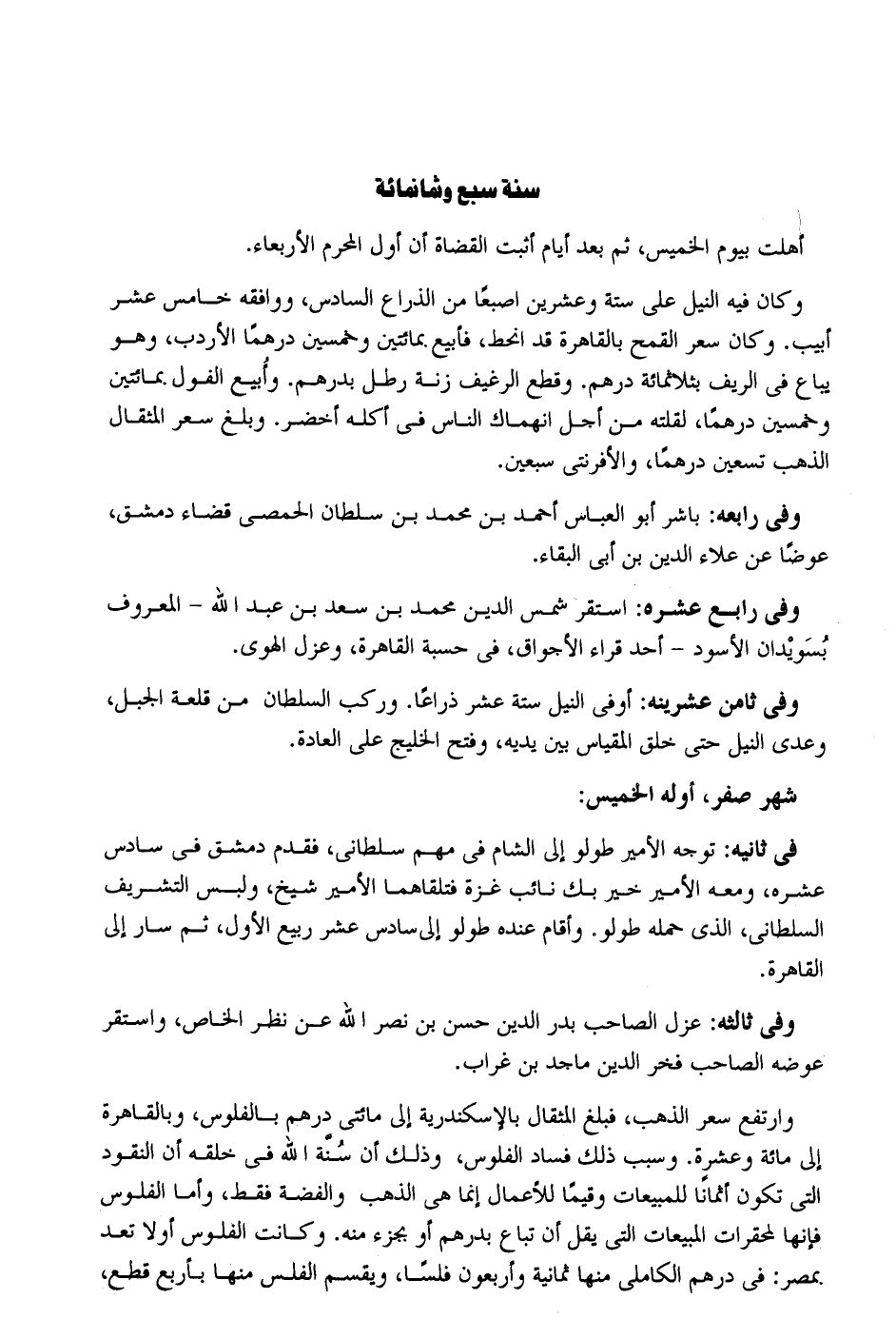 سنة سبع وَثَمَانمِائَة أهلت بِيَوْم الْخَمِيس ثمَّ بعد أَيَّام أثبت الْقُضَاة أَن أول الْمحرم الْأَرْبَعَاء. وَكَانَ فِيهِ النّيل على سِتَّة وَعشْرين إصبعاً من الذِّرَاع السَّادِس وَوَافَقَهُ خَامِس عشر أبيب. وَكَانَ سعر الْقَمْح بِالْقَاهِرَةِ قد انحط فأبيع بمائتين وَخمسين درهما الأردب وَهُوَ يُبَاع فِي الرِّيف بثلاثمائة دِرْهَم. وَقطع الرَّغِيف زنة رَطْل بدرهم. وأبيع الفول بمائتين وَخمسين درهما لقلته من أجل انهماك النَّاس فِي أكله أَخْضَر. وبلع سعر المثقال الذَّهَب تسعين درهما والأفرنتي سبعين. وَفِي رابعه: بَاشر أَبُو الْعَبَّاس أَحْمد بن مُحَمَّد بن سُلْطَان الْحِمصِي قَضَاء دمشق عوضا عَن عَلَاء الدّين بن أبي الْبَقَاء. وَفِي رَابِع عشره: اسْتَقر شمس الدّين مُحَمَّد بن سعد بن عبد الله - الْمَعْرُوف بسويدان الْأسود - أحد قراء الأجواق فِي حسبَة الْقَاهِرَة وعزل الْهوى. وَفِي ثامن عشرينه: أوفي النّيل سِتَّة عشر ذِرَاعا. وَركب السُّلْطَان من قلعة الْجَبَل وعدى النّيل حَتَّى خلق المقياس بَين يَدَيْهِ وَفتح الخليج على الْعَادة. شهر صفر أَوله الْخَمِيس: فِي ثَانِيه: توجه الْأَمِير طولو إِلَى الشَّام فِي مُهِمّ سلطاني فَقدم دمشق فِي سادس عشره وَمَعَهُ الْأَمِير خير بك نَائِب غَزَّة فتلقاهما الْأَمِير شيخ وَلبس التشريف السلطاني الَّذِي حمله طولو. وَأقَام عِنْده طولو إِلَى سادس عشر ربيع الأول ثمَّ سَار إِلَى الْقَاهِرَة. وَفِي ثالثه: عزل الصاحب بدر الدّين حسن بن نصر الله عَن نظر الْخَاص وَاسْتقر عوضه الصاحب فَخر الدّين ماجد بن غراب. وارتفع سعر الذَّهَب فَبلغ المثقال بالإسكندرية إِلَى مِائَتي دِرْهَم بالفلوس وبالقاهرة إِلَى مائَة وَعشرَة. وَسبب ذَلِك فَسَاد الْفُلُوس وَذَلِكَ أَن سنة الله فِي خلقه أَن النُّقُود الَّتِي تكون أثماناً للمبيعات وقيماً للأعمال إِنَّمَا هِيَ الذَّهَب وَالْفِضَّة فَقَط وَأما الْفُلُوس فَإِنَّهَا لمحقرات المبيعات الَّتِي يقل أَن تبَاع بدرهم أَو بِجُزْء مِنْهُ. وَكَانَت الْفُلُوس أَولا تعد بِمصْر: فِي دِرْهَم الكاملي مِنْهَا ثَمَانِيَة وَأَرْبَعُونَ فلسًا وَيقسم الْفلس مِنْهَا بِأَرْبَع قطع