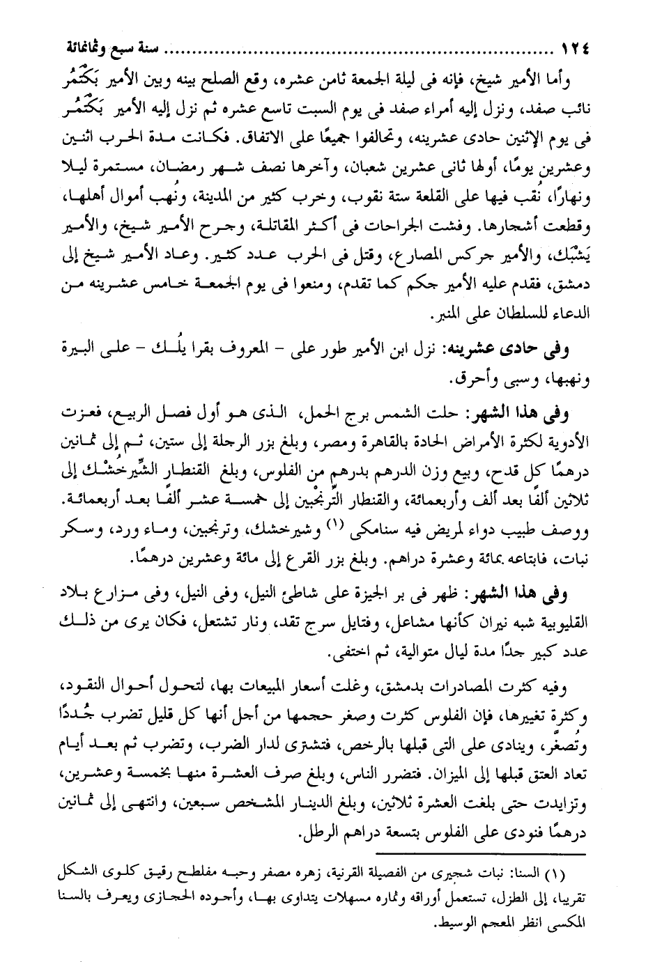 وَأما الْأَمِير الشَّيْخ فَإِنَّهُ فِي لَيْلَة الْجُمُعَة ثامن عشره وَقع الصُّلْح بَينه وَبَين الْأَمِير بكتمر نَائِب صفد وَنزل إِلَيْهِ أُمَرَاء صفد فِي يَوْم السبت تَاسِع عشره ثمَّ نزل إِلَيْهِ الْأَمِير بكتمر فِي يَوْم الِاثْنَيْنِ حادي عشرينه وتحالفوا جَمِيعًا على الِاتِّفَاق. فَكَانَت مُدَّة الْحَرْب اثْنَيْنِ وَعشْرين يَوْمًا أَولهَا ثَانِي عشْرين شعْبَان وَآخِرهَا نصف شهر رَمَضَان مستمرة لَيْلًا وَنَهَارًا نقب فِيهَا على القلعة سِتَّة نقوب وَخرب كثير من الْمَدِينَة وَنهب أَمْوَال أَهلهَا وَقطعت أشجارها. وفشت الْجِرَاحَات فِي أَكثر الْمُقَاتلَة وجرح الْأَمِير شيخ والأمير يشبك والأمير جركس المصارع وَقتل فِي الْحَرْب عدد كثير. وَعَاد الْأَمِير شيخ إِلَى دمشق فَقدم عَلَيْهِ الْأَمِير جكم كَمَا تقدم وَمنعُوا فِي يَوْم الْجُمُعَة خَامِس عشرينه من الدُّعَاء للسُّلْطَان على الْمُنِير. وَفِي حادي عشرينه: نزل ابْن الْأَمِير طور عَليّ - الْمَعْرُوف بقرًا يلك - عَليّ البيرة ونهبها وسبى وأحرق. وَفِي هَذَا الشَّهْر: حلت الشَّمْس برج الْحمل الَّذِي هُوَ أول فصل الرّبيع فعزت الْأَدْوِيَة لِكَثْرَة الْأَمْرَاض الحادة بِالْقَاهِرَةِ ومصر وبلع بزر الرجلة إِلَى سِتِّينَ ثمَّ إِلَى ثَمَانِينَ درهما كل قدح وَبيع وزن الدِّرْهَم بدرهم من الْفُلُوس وَبلغ القنطار الشيرخشك إِلَى ثَلَاثِينَ ألفا بعد ألف وَأَرْبَعمِائَة وَالْقِنْطَار الترنجبين إِلَى خَمْسَة عشر ألفا بعد أَرْبَعمِائَة. وَوصف طَبِيب دَوَاء لمريض فِيهِ سنامكي وشيرخشك وترنجبين وَمَاء ورد وسكر نَبَات فابتاعه بِمِائَة وَعشرَة دَرَاهِم. وَبلغ بزر القرع إِلَى مائَة وَعشْرين درهما. وَفِي هَذَا الشَّهْر: ظهر فِي بر الجيزة على شاطئ النّيل وَفِي النّيل وَفِي مزارع بِلَاد القليوبية شبه نيران كَأَنَّهَا مشاعل وفتايل سرج تقد ونار تشتعل فَكَانَ يرى من ذَلِك عدد كَبِير جدا مُدَّة لَيَال مُتَوَالِيَة ثمَّ اختفى. وَفِيه كثرت المصادرات بِدِمَشْق وغلت أسعار المبيعات بهَا لتحول أَحْوَال النُّقُود وَكَثْرَة تغييرها فَإِن الْفُلُوس كثرت وَصغر حجمها من أجل أَنَّهَا كل قَلِيل تضرب جدداً وتصغر وينادى على الَّتِي قبلهَا بالرخص فتشترى لدار الضَّرْب وتضرب ثمَّ بعد أَيَّام تُعَاد الْعتْق قبلهَا إِلَى الْمِيزَان. فتضرر النَّاس وَبلغ صرف الْعشْرَة مِنْهَا بِخَمْسَة وَعشْرين وتزايدت حَتَّى بلغت الْعشْرَة ثَلَاثِينَ وَبلغ الدِّينَار المشخص سبعين وانْتهى إِلَى ثَمَانِينَ درهما فَنُوديَ على الْفُلُوس بِتِسْعَة دَرَاهِم الرطل.