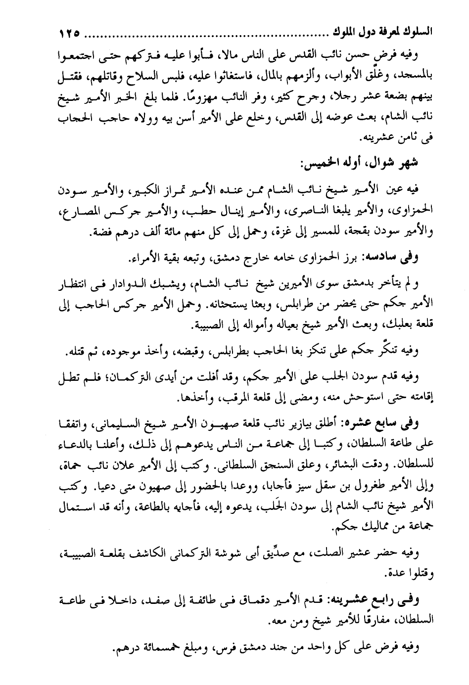 وَفِيه حسن نَائِب الْقُدس على النَّاس مَالا فَأَبَوا عَلَيْهِ فتركهم حَتَّى اجْتَمعُوا بِالْمَسْجِدِ وغلق الْأَبْوَاب وألزمهم بِالْمَالِ فاستغاثوا عَلَيْهِ فَلبس السِّلَاح وَقَاتلهمْ فَقتل بَينهم بضعَة عشر رجلا وجرح كثير وفر النَّائِب مهزوماً. فَلَمَّا بلغ الْخَبَر الْأَمِير شيخ نَائِب الشَّام بعث عوضه إِلَى الْقُدس وخلع على الْأَمِير أسن بيه وولاه حَاجِب الْحجاب فِي ثامن عشرينه. شهر شَوَّال أَوله الْخَمِيس: فِيهِ عين الْأَمِير شيخ نَائِب الشَّام مِمَّن عِنْده الْأَمِير تمراز الْكَبِير والأمير سودن الحمزاوي والأمير يلبغا الناصري والأمير إينال حطب والأمير جركس المصارع والأمير سودن بقجة للمسير إِلَى غَزَّة وَحمل إِلَى كل مِنْهُم مائَة ألف دِرْهَم فضَّة. وَفِي سادسه: برز الحمزاوي خامه خَارج دمشق وَتَبعهُ بَقِيَّة الْأُمَرَاء. وَلم يتَأَخَّر بِدِمَشْق سوى الأميرين شيخ نَائِب الشَّام ويشبك الدوادار فِي انْتِظَار الْأَمِير جكم حَتَّى يحضر من طرابلس وبعثا يستحثانه وَحمل الْأَمِير جركس الْحَاجِب إِلَى قلعة بعلبك وَبعث الْأَمِير شيخ بعياله وأمواله إِلَى الصبيبة. وَفِيه تنكر جكم على تنكز بغا الْحَاجِب بطرابلس وَقَبضه وَأخذ موجوده ثمَّ قَتله. وَفِيه قدم سودن الجلب على الْأَمِير جكم وَقد أفلت من أَيدي التركمان فَلم تطل إِقَامَته حَتَّى استوحش مِنْهُ وَمضى إِلَى قلعة المرقب وَأَخذهَا. وَفِي سَابِع عشره: أطلق بيازير نَائِب قلعة صهيون الْأَمِير شيخ السُّلَيْمَانِي واتفقا على طَاعَة السُّلْطَان وكتبا إِلَى جمَاعَة من النَّاس يَدعُوهُم إِلَى ذَلِك وأعلنا بِالدُّعَاءِ للسُّلْطَان. ودقت البشائر وعلق السنجق السلطاني. وَكتب إِلَى الْأَمِير عَلان نَائِب حماة وَإِلَى الْأَمِير طغرول بن سقل سيز فأجابا ووعدا بالحضور إِلَى صهيون مَتى دعيا. وَكتب الْأَمِير شيخ نَائِب الشَّام إِلَى سودن الجلب يَدعُوهُ إِلَيْهِ فَأَجَابَهُ بِالطَّاعَةِ وَأَنه قد استمال جمَاعَة من مماليك جكم. وَفِيه حضر عشير الصَّلْت مَعَ صديق أبي شوشة التركماني الكاشف بقلعة الصبيبة وَقتلُوا عدَّة. وَفِي رَابِع عشرينه: قدم الْأَمِير دقماق فِي طَائِفَة إِلَى صفد دَاخِلا فِي طَاعَة السُّلْطَان مفارقاً للأمير شيخ وَمن مَعَه. وَفِيه فرض على كل وَاحِد من جند دمشق فرس ومبلغ خَمْسمِائَة دِرْهَم.