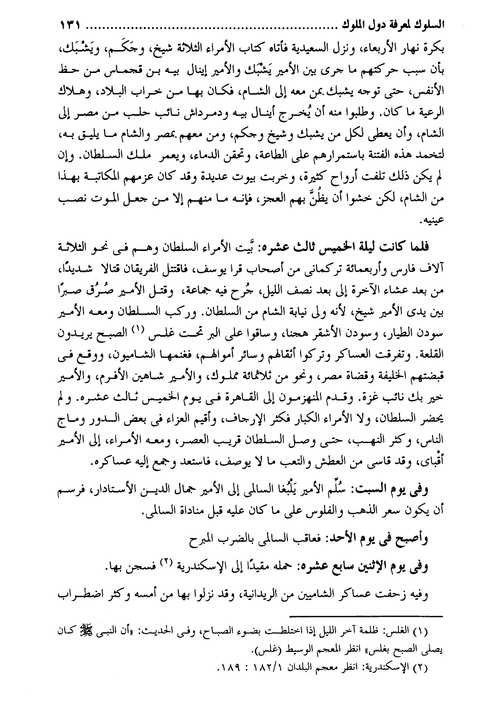 بكرَة نَهَار الْأَرْبَعَاء وَنزل السعيدية فَأَتَاهُ كتاب الْأُمَرَاء الثَّلَاثَة شيخ وجكم ويشبك بِأَن سَبَب حركتهم مَا جرى بَين الْأَمِير يشبك والأمير إينال بيه بن قجماس من حَظّ الْأَنْفس حَتَّى توجه يشبك بِمن مَعَه إِلَى الشَّام فَكَانَ بهَا من خراب الْبِلَاد وهلاك الرّعية مَا كَانَ. وطلبوا مِنْهُ أَن يخرج أينال بيه ودمرداش نَائِب حلب من مصر إِلَى الشَّام وَأَن يعْطى لكل من يشبك وَشَيخ وجكم وَمن مَعَهم بِمصْر وَالشَّام مَا يَلِيق بِهِ لتخمد هَذِه الْفِتْنَة باستمرارهم على الطَّاعَة وتحقن الدِّمَاء ويعمر ملك السُّلْطَان. وَإِن لم يكن ذَلِك تلفت أَرْوَاح كَثِيرَة وَخَربَتْ بيُوت عديدة وَقد كَانَ عزمهم الْمُكَاتبَة بِهَذَا من الشَّام لَكِن خَشوا أَن يظنّ بهم الْعَجز فَإِنَّهُ مَا مِنْهُم إِلَّا من جعل الْمَوْت نصب عَيْنَيْهِ. فَلَمَّا كَانَت لَيْلَة الْخَمِيس ثَالِث عشره: بَيت الْأُمَرَاء السُّلْطَان وهم فِي نَحْو الثَّلَاثَة آلَاف فَارس وَأَرْبَعمِائَة تركماني من أَصْحَاب قرا يُوسُف فاقتتل الْفَرِيقَانِ قتالاً شَدِيدا من بعد عشَاء الْآخِرَة إِلَى بعد نصف اللَّيْل جرح فِيهِ جمَاعَة وَقتل الْأَمِير صرق صبرا بَين يَدي الْأَمِير شيخ لِأَنَّهُ ولي نِيَابَة الشَّام من السُّلْطَان. وَركب السُّلْطَان وَمَعَهُ الْأَمِير سودن الطيار وسودن الْأَشْقَر هجنا وَسَاقُوا على الْبر تَحت غلس الصُّبْح يُرِيدُونَ القلعة. وَتَفَرَّقَتْ العساكر وَتركُوا أثقالهم وَسَائِر أَمْوَالهم فغنمها الشاميون وَوَقع فِي قبضتهم الْخَلِيفَة وقضاة مصر وَنَحْو من ثَلَاثمِائَة مَمْلُوك والأمير شاهين الأفرم والأمير خير بك نَائِب عزة. وَقدم المنهزمون إِلَى الْقَاهِرَة فِي يَوْم الْخَمِيس ثَالِث عشره. وَلم يحضر السُّلْطَان وَلَا الْأُمَرَاء الْكِبَار فَكثر الإرجاف وأقيم العزاء فِي بعض الدّور وماج النَّاس وَكثر النهب حَتَّى وصل السُّلْطَان قريب الْعَصْر وَمَعَهُ الْأُمَرَاء إِلَى الْأَمِير أقباي وَقد قاسى من الْعَطش والتعب مَا لَا يُوصف فاستعد وَجمع إِلَيْهِ عساكره. وَفِي يَوْم السبت: سلم الْأَمِير يلبغا السالمي إِلَى الْأَمِير جمال الدّين الأستادار فرسم أَن يكون سعر الذَّهَب والفلوس على مَا كَانَ عَلَيْهِ قبل مناداة السالمي. وَأصْبح فِي يَوْم الْأَحَد: فعاقب السالمي بِالضَّرْبِ المبرح وَفِي يَوْم الِاثْنَيْنِ سَابِع عشره: حمله مُقَيّدا إِلَى الْإسْكَنْدَريَّة فسجن بهَا. وَفِيه زحفت عَسَاكِر الشاميين من الريدانية وَقد نزلُوا بهَا من أمسه وَكثر اضْطِرَاب