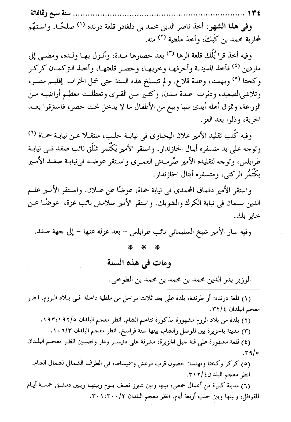 وَفِي هَذَا الشَّهْر: أَخذ نَاصِر الدّين مُحَمَّد بن دلغادر قلعة درنده صلحا. واستهم لمحاربة مُحَمَّد بن كبك وَأخذ ملطية مِنْهُ. وَفِيه أَخذ قرا يلك قلعة الرها بعد حصارها مُدَّة وَأنزل بهَا وَلَده وَمضى إِلَى ماردين فَأخذ الْمَدِينَة وأحرقها وخربها وَحصر قلعتها وَأخذ التركمان كركر وكختا وبهسنا وعدة قلاع. وَلم تنسلخ هَذِه السّنة حَتَّى كل الخراب إقليم مصر وتلاشى الصَّعِيد ودثرت عدَّة مدن وَكثير من الْقرى وتعطلت مُعظم أراضيه من الزِّرَاعَة وتمزق أَهله أَيدي سبا وَبيع من الْأَطْفَال مَا لَا يدْخل تَحت حصر فاسترقوا بعد الْحُرِّيَّة وذلوا بعد الْعِزّ. وَفِيه كتب تَقْلِيد الْأَمِير عَلان اليحياوي فِي نِيَابَة حلب منتقلاً عَن نِيَابَة حماة وَتوجه على يَد متسفره أينال الخازندار. وَاسْتقر الْأَمِير بكتمر شلق نَائِب صفد فِي نِيَابَة طرابلس وَتوجه لتقليده الْأَمِير صرماش الْعمريّ وَاسْتقر عوضه فِي نِيَابَة صفد الْأَمِير بكتمر الركني ومتسفره أينال الخازندار. وَاسْتقر الْأَمِير دقماق المحمدي فِي نِيَابَة حماة عوضا عَن عَلان. وَاسْتقر الْأَمِير علم الدّين سلمَان فِي نِيَابَة الكرك والشوبك. وَاسْتقر الْأَمِير سلامش نَائِب غَزَّة عوضا عَن خاير بك. وَفِيه سَار الْأَمِير شيخ السُّلَيْمَانِي نَائِب طرابلس - بعد عَزله عَنْهَا - إِلَى جِهَة صفد. وَمَات فِي هَذِه السّنة الْوَزير بدر الدّين مُحَمَّد بن مُحَمَّد بن مُحَمَّد بن الطوخي.