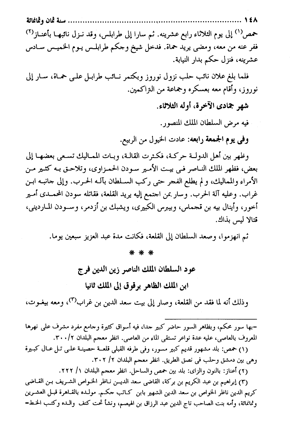 حمص إِلَى يَوْم الثُّلَاثَاء رَابِع عشرينه. ثمَّ سارا إِلَى طرابلس وَقد نزل نائبها بأعناز ففر عَنهُ من مَعَه وَمضى يُرِيد حماة. فَدخل شيخ وَحكم طرابلس يَوْم الْخَمِيس سادس عشرينه فَنزل حكم بدار النِّيَابَة. فَلَمَّا بلغ عَلان نَائِب حلب نزُول نوروز وبكتمر نَائِب طرابلس على حماة سَار إِلَى نوروز شهر جُمَادَى الْآخِرَة أَوله الثُّلَاثَاء. فِيهِ مرض السُّلْطَان الْملك الْمَنْصُور. وَفِي يَوْم الْجُمُعَة رابعه: عَادَتْ الْخُيُول من الرّبيع. وَظهر بَين أهل الدولة حَرَكَة فكثرت القالة وَبَات المماليك تسْعَى بَعْضهَا إِلَى بعض فَظهر الْملك النَّاصِر فِي بَيت الْأَمِير سودن الحمزاوي وتلاحق بِهِ كثير من الْأُمَرَاء والمماليك وَلم يطلع الْفجْر حَتَّى ركب السُّلْطَان بِآلَة الْحَرْب. وَإِلَى جَانِبه ابْن غراب. وَعَلِيهِ آلَة الْحَرْب. وَسَار بِمن اجْتمع إِلَيْهِ يُرِيد القلعة فقاتله سودن المحمدي أَمِير أخور وأينال بيه بن قجماس وبيبرس الكبيري ويشبك بن أزدمر وسودن المارديني قتالاً لَيْسَ بِذَاكَ. ثمَّ انْهَزمُوا وَصعد السُّلْطَان إِلَى القلعة فَكَانَت مُدَّة عبد الْعَزِيز سبعين يَوْمًا. عود السُّلْطَان زين الدّين فرج إِلَى الْملك عود السُّلْطَان الْملك النَّاصِر زين الدّين فرج ابْن الْملك الظَّاهِر برقوق إِلَى الْملك ثَانِيًا وَذَلِكَ أَنه لما فقد من القلعة وَصَارَ إِلَى بَيت سعد الدّين بن غراب وَمَعَهُ بيغوت