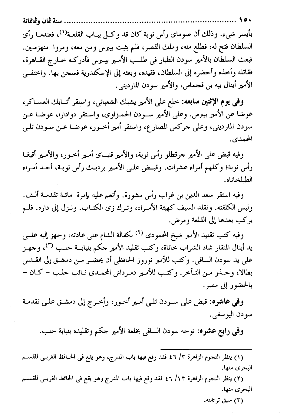 بأيسر شَيْء. وَذَلِكَ أَن صوماي رَأس نوبَة كَانَ قد وكل بِبَاب القلعة فعندما رأى السُّلْطَان فتح لَهُ فطلع مِنْهُ وَملك الْقصر فَلم يثبت بيبرس وَمن مَعَه ومروا منهزمين. فَبعث السُّلْطَان بالأمير سودن الطيار فِي طلب الْأَمِير بيبرس فأدركه خَارج الْقَاهِرَة فقاتله وَأَخذه وأحضره إِلَى السُّلْطَان فقيده وَبَعثه إِلَى الْإسْكَنْدَريَّة فسجن بهَا. واختفي الْأَمِير أينال بيه بن قجماس والأمير سودن المارديني. وَفِي يَوْم الِاثْنَيْنِ سابعه: خلع على الْأَمِير يشبك الشَّعْبَانِي وَاسْتقر أتابك العساكر عوضا عَن الْأَمِير بيبرس. وعَلى الْأَمِير سودن الحمزاوي وَاسْتقر دواداراً عوضا عَن سودن المارديني وعَلى جركس المصارع وَاسْتقر أَمِير أخور عوضا عَن سودن تلى المحمدي. وَفِيه قبض على الْأَمِير جرقطلو رَأس نوبَة والأمير قنباي أَمِير أخور والأمير أقبغا رَأس نوبَة وَكلهمْ أُمَرَاء عشرات. وَقبض على الْأَمِير بردبك رَأس نوبَة أحد أُمَرَاء الطبلخاناه. وَفِيه اسْتَقر سعد الدّين بن غراب رَأس مشورة. وأنعم عَلَيْهِ بإمرة مائَة تقدمة ألف. وَلبس الكلفته. وتقلد السَّيْف كَهَيئَةِ الْأُمَرَاء وَترك زِيّ الْكتاب. وَنزل إِلَى دَاره. فَلم يركب بعْدهَا إِلَى القلعة وَمرض. وَفِيه كتب تَقْلِيد الْأَمِير شيخ المحمودي بكفالة الشَّام على عَادَته وجهز إِلَيْهِ على يَد أينال المنقار شاد الشَّرَاب خاناة وَكتب تَقْلِيد الْأَمِير جكم بنيابة حلب وجهز على يَد سودن الساقي. وَكتب للأمير نوروز الحافظي أَن يحضر من دمشق إِلَى الْقُدس بطالاً وحذر من التَّأَخُّر. وَكتب للأمير دمرداش المحمدي نَائِب حلب - كَانَ - بالحضور إِلَى مصر. وَفِي عاشره: قبض على سودن تلى أَمِير أخور واخرج إِلَى دمشق على تقدمة سودن اليوسفي. وَفِي رَابِع عشره: توجه سودن الساقي بخلعة الْأَمِير جكم وتقليده بنيابة حلب.