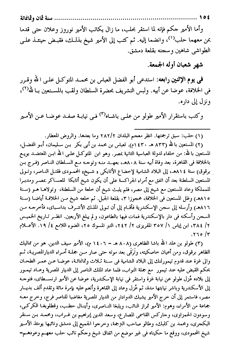 وَأما الْأَمِير جكم فَإِنَّهُ لما اسْتَقر بحلب مَا زَالَ يُكَاتب الْأَمِير نوروز وعلان حَتَّى قدما بِمن مَعَهُمَا حلب وانضما إِلَيْهِ. ثمَّ كتب إِلَى الْأَمِير شيخ بذلك فَقبض حِينَئِذٍ على الطواشي شاهين وسجنه بقلعة دمشق. شهر شعْبَان أَوله الْجُمُعَة. فِي يَوْم الِاثْنَيْنِ رابعه: استدعى أَبُو الْفضل الْعَبَّاس بن مُحَمَّد المتَوَكل على الله وَقرر فِي الْخلَافَة عوضا عَن أَبِيه. وَلبس التشريف بِحَضْرَة السُّلْطَان ولقب بالمستعين بِاللَّه وَنزل إِلَى دَاره. وَكتب باستقرار الْأَمِير طولو من عَليّ باشاه فِي نِيَابَة صفد عوضا عَن الْأَمِير
