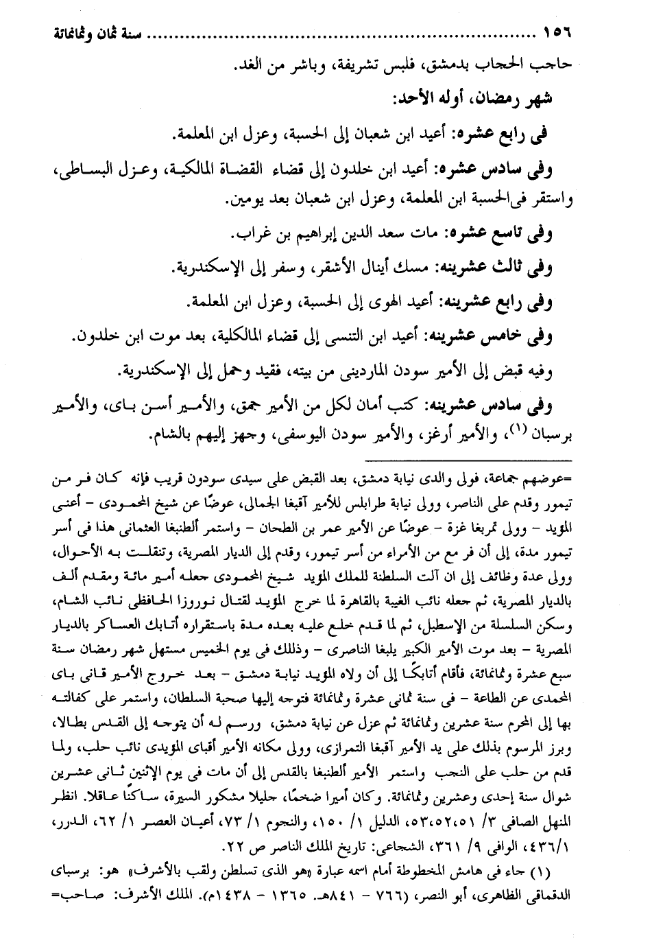 حَاجِب الْحجاب بِدِمَشْق فَلبس تشريفة وباشر من الْغَد. شهر رَمَضَان أَوله الْأَحَد: فِي رَابِع عشره: أُعِيد ابْن شعْبَان إِلَى الْحِسْبَة وعزل ابْن المعلمة. وَفِي سادس عشره: أُعِيد ابْن خلدون إِلَى قَضَاء الْقُضَاة الْمَالِكِيَّة وعزل الْبِسَاطِيّ وَاسْتقر فِي الْحِسْبَة ابْن المعلمة وعزل ابْن شعْبَان بعد يَوْمَيْنِ. وَفِي تَاسِع عشره: مَاتَ سعد الدّين إِبْرَاهِيم بن غراب. وَفِي ثَالِث عشرينه: مسك أينال الْأَشْقَر وسفر إِلَى الْإسْكَنْدَريَّة. وَفِي خَامِس عشرينه: أُعِيد ابْن التنسي إِلَى قَضَاء المالكلية بعد موت ابْن خلدون. وَفِيه قبض إِلَى الْأَمِير سودن المارديني من بَيته مُقَيّد وَحمل إِلَى الْإسْكَنْدَريَّة. وَفِي سادس عشرينه: كتب أَمَان لكل من الْأَمِير جمق والأمير أسن باي والأمير برسبان والأمير أرغز والأمير سودن اليوسفي وجهز إِلَيْهِم بِالشَّام.