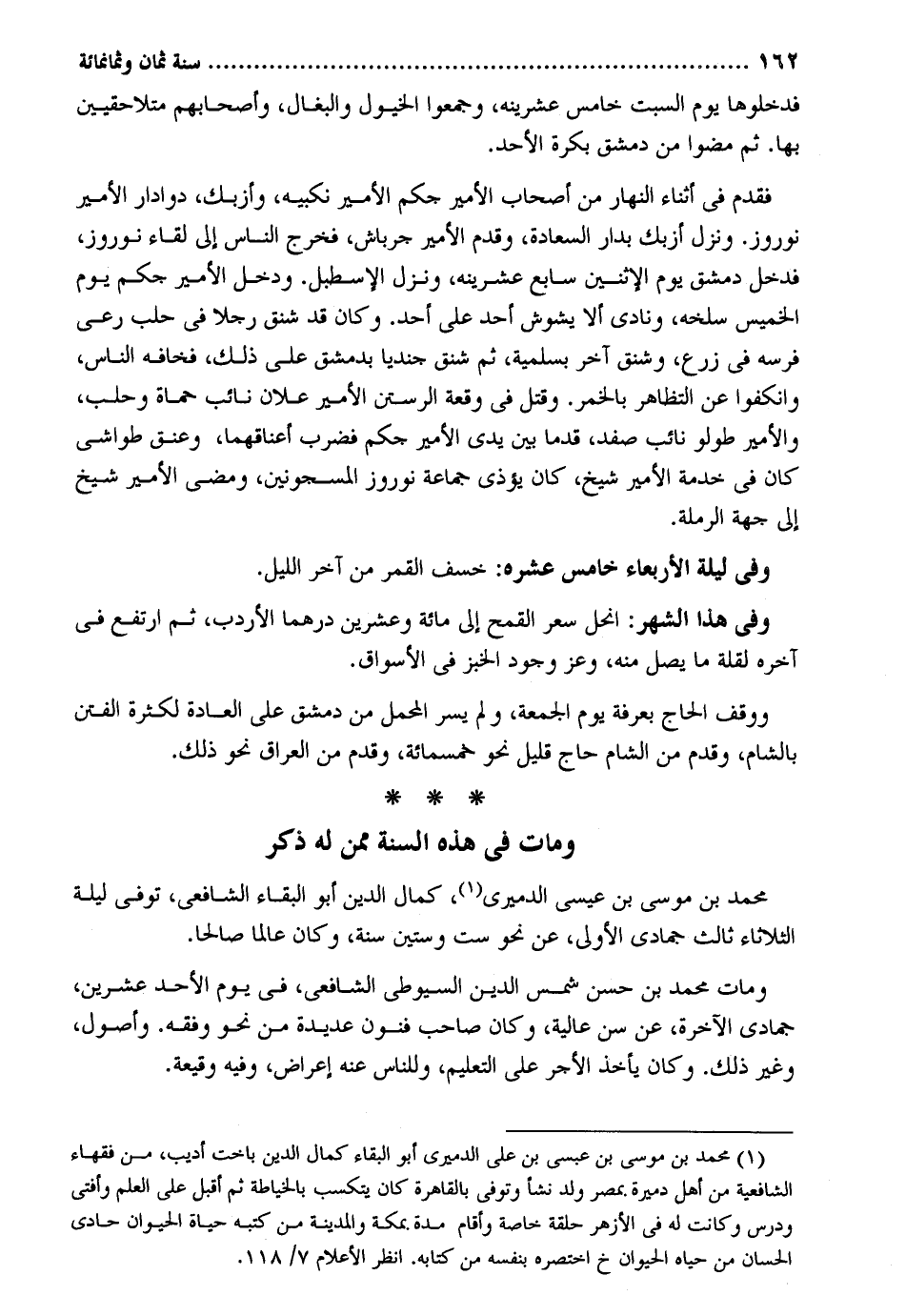 فَدَخَلُوهَا يَوْم السبت خَامِس عشرينه وجمعوا الْخُيُول وَالْبِغَال وأصحابهم متلاحقيين بهَا. ثمَّ مضوا من دمشق بكرَة الْأَحَد. فَقدم فِي أثْنَاء النَّهَار من أَصْحَاب الْأَمِير جكم الْأَمِير نكبيه وأزبك دوادار الْأَمِير نوروز. وَنزل أزبك بدار السَّعَادَة وَقدم الْأَمِير جرباش فَخرج النَّاس إِلَى لِقَاء نوروز فَدخل دمشق يَوْم الِاثْنَيْنِ سَابِع عشرينه وَنزل الإسطبل. وَدخل الْأَمِير جكم يَوْم الْخَمِيس سلخه ونادى أَلا يشوش أحد على أحد. وَكَانَ قد شنق رجلا فِي حلب رعى فرسه فِي زرع وشنق آخر بسلمية ثمَّ شنق جندياً بِدِمَشْق على ذَلِك فخافه النَّاس وانكفوا عَن التظاهر بِالْخمرِ. وَقتل فِي وقْعَة الرستن الْأَمِير عَلان نَائِب حماة وحلب والأمير طولو نَائِب صفد قدما بَين يَدي الْأَمِير جكم فَضرب أعناقهما وعنق طواشي كَانَ فِي خدمَة الْأَمِير شيخ كَانَ يُؤْذِي جمَاعَة نوروز وَفِي لَيْلَة الْأَرْبَعَاء خَامِس عشره: خسف الْقَمَر من آخر اللَّيْل. وَفِي هَذَا الشَّهْر: انحل سعر الْقَمْح إِلَى مائَة وَعشْرين درهما الأردب ثمَّ ارْتَفع فِي آخِره لقلَّة مَا يصل مِنْهُ وَعز وجود الْخبز فِي الْأَسْوَاق. ووقف الْحَاج بِعَرَفَة يَوْم الْجُمُعَة وَلم يسر الْمحمل من دمشق على الْعَادة لِكَثْرَة الْفِتَن بِالشَّام وَقدم من الشَّام حَاج قَلِيل نَحْو خَمْسمِائَة وَقدم من الْعرَاق نَحْو ذَلِك. وَمَات فِي هَذِه السّنة مِمَّن لَهُ ذكر مُحَمَّد بن مُوسَى بن عِيسَى الدَّمِيرِيّ كَمَال الدّين أَبُو الْبَقَاء الشَّافِعِي توفّي لَيْلَة الثُّلَاثَاء ثَالِث جُمَادَى الأولى عَن نَحْو سِتّ وَسِتِّينَ سنة وَكَانَ عَالما صَالحا. وَمَات مُحَمَّد بن حسن شمس الدّين السُّيُوطِيّ الشَّافِعِي فِي يَوْم الْأَحَد عشْرين جُمَادَى الْآخِرَة عَن سنّ عالية وَكَانَ صَاحب فنون عديدة من نَحْو وَفقه. وأصول وغيرذلك. وَكَانَ يَأْخُذ الْأجر على التَّعْلِيم وَلِلنَّاسِ عَنهُ إِعْرَاض وَفِيه وقيعة.