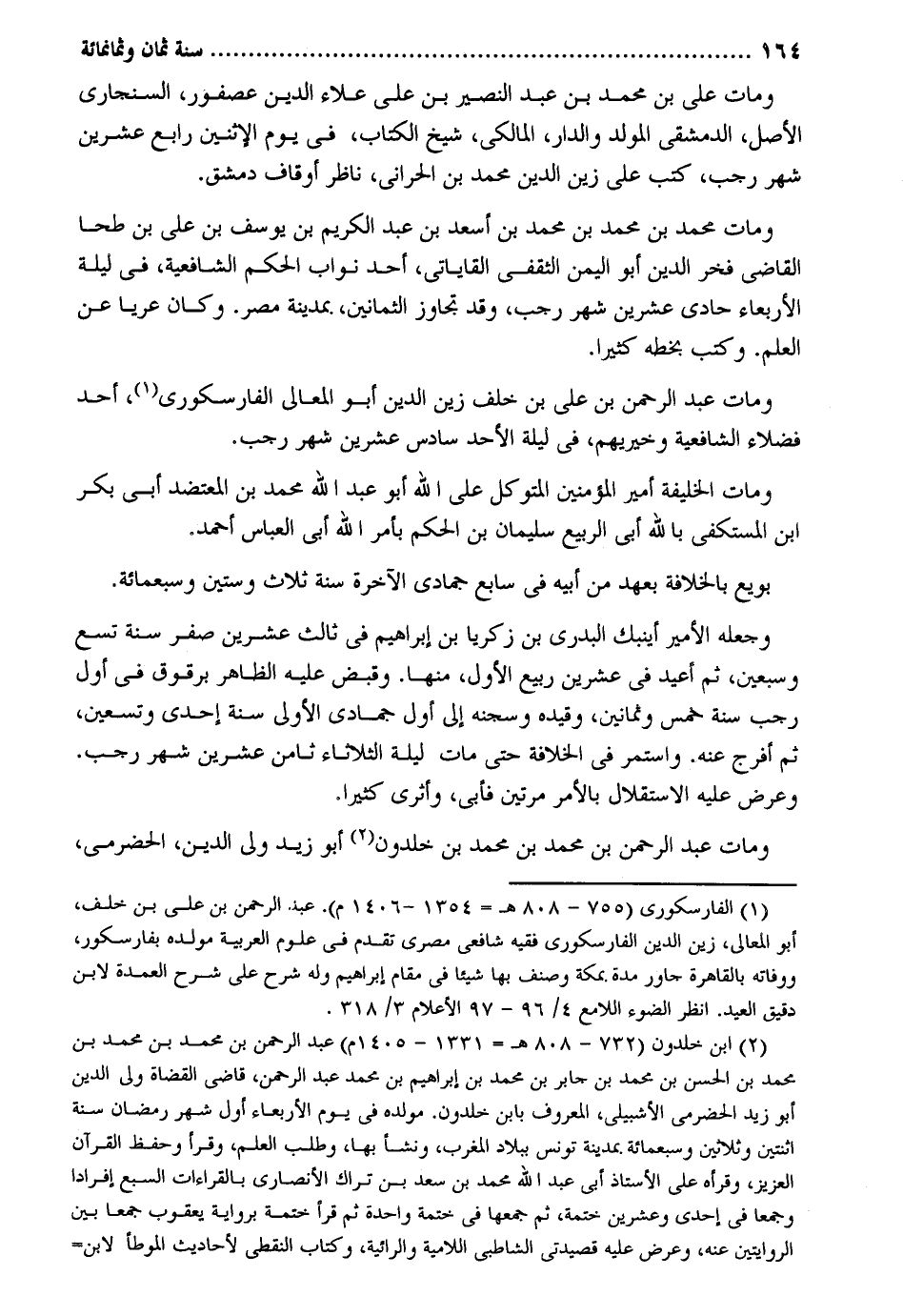 وَمَات عَليّ بن مُحَمَّد بن عبد النصير بن عَليّ عَلَاء الدّين عُصْفُور السنجاري الأَصْل الدِّمَشْقِي المولد وَالدَّار الْمَالِكِي شيخ الْكتاب فِي يَوْم الِاثْنَيْنِ رَابِع عشْرين شهر رَجَب كتب على زين الدّين مُحَمَّد بن الْحَرَّانِي نَاظر أوقاف دمشق. وَمَات مُحَمَّد بن مُحَمَّد بن مُحَمَّد بن أسعد بن عبد الْكَرِيم بن يُوسُف بن عَليّ بن طحا القَاضِي فَخر الدّين أَبُو الْيمن الثَّقَفِيّ القاياتي أحد نواب الحكم الشَّافِعِيَّة فِي لَيْلَة الْأَرْبَعَاء حادي عشْرين شهر رَجَب وَقد تجَاوز الثَّمَانِينَ بِمَدِينَة مصر. وَكَانَ عريا عَن الْعلم. وَكتب بِخَطِّهِ كثيرا. وَمَات عبد الرَّحْمَن بن عَليّ بن خلف زين الدّين أَبُو الْمَعَالِي الفارسكوري أحد فضلاء الشَّافِعِيَّة وخيريهم فِي لَيْلَة الْأَحَد سادس عشْرين شهر رَجَب. وَمَات الْخَلِيفَة أَمِير الْمُؤمنِينَ المتَوَكل على الله أَبُو عبد الله مُحَمَّد بن المعتضد أبي بكر ابْن المستكفي بِاللَّه أبي الرّبيع سُلَيْمَان بن الحكم بِأَمْر الله أبي الْعَبَّاس أَحْمد. بُويِعَ بالخلافة بِعَهْد من أَبِيه فِي سَابِع جُمَادَى الْآخِرَة سنة ثَلَاث وَسِتِّينَ وَسَبْعمائة. وَجعله الْأَمِير أينبك البدري بن زَكَرِيَّا بن إِبْرَاهِيم فِي ثَالِث عشْرين صفر سنة تسع وَسبعين ثمَّ أُعِيد فِي عشْرين ربيع الأول مِنْهَا. وَقبض عَلَيْهِ الظَّاهِر برقوق فِي أول رَجَب سنة خمس وَثَمَانِينَ وَقَيده وسجنه إِلَى أول جُمَادَى الأولى سنة إِحْدَى وَتِسْعين ثمَّ أفرج عَنهُ. وَاسْتمرّ فِي الْخلَافَة حَتَّى مَاتَ لَيْلَة الثُّلَاثَاء ثامن عشْرين شهر رَجَب. وَعرض عَلَيْهِ الِاسْتِقْلَال بِالْأَمر مرَّتَيْنِ فَأبى وأثرى كثيرا. وَمَات عبد الرَّحْمَن بن مُحَمَّد بن مُحَمَّد بن خلدون أَبُو زيد ولي الدّين الْحَضْرَمِيّ