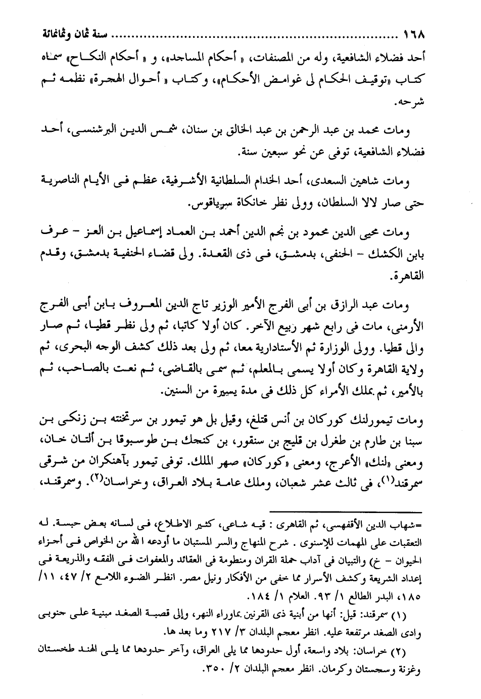 أحد فضلاء الشَّافِعِيَّة وَله من المصنفات أَحْكَام الْمَسَاجِد وَأَحْكَام النِّكَاح سَمَّاهُ كتاب تَوْقِيف الْحُكَّام فِي غوامض الْأَحْكَام وَكتاب أَحْوَال الْهِجْرَة نظمه ثمَّ شَرحه. وَمَات مُحَمَّد بن عبد الرَّحْمَن بن عبد الْخَالِق بن سِنَان شمس الدّين البرشنسي أحد فضلاء الشَّافِعِيَّة توفّي عَن نَحْو سبعين سنة. وَمَات شاهين السَّعْدِيّ أحد الخدام السُّلْطَانِيَّة الأشرفية عظم فِي الْأَيَّام الناصرية حَتَّى صَار لالا السُّلْطَان وَولي نظر خانكاة سرياقوس. وَمَات محيي الدّين مَحْمُود بن نجم الدّين أَحْمد بن الْعِمَاد إِسْمَاعِيل بن الْعِزّ - عرف بِابْن الكشك - الْحَنَفِيّ بِدِمَشْق فِي ذِي الْقعدَة. ولي قَضَاء الْحَنَفِيَّة بِدِمَشْق وَقدم الْقَاهِرَة. وَمَات عبد الرازق بن أبي الْفرج الْأَمِير الْوَزير تَاج الدّين الْمَعْرُوف بِابْن أبي الْفرج الأرمني مَاتَ فِي رَابِع شهر ربيع الْآخِرَة كَانَ أَولا كَاتبا ثمَّ ولي نظر قطيا ثمَّ صَار وَالِي قطيا. وَولي الوزارة ثمَّ الأستادارية مَعًا ثمَّ ولي بعد ذَلِك كشف الْوَجْه البحري ثمَّ ولَايَة الْقَاهِرَة وَكَانَ أَولا يُسمى بالمعلم ثمَّ سمي بِالْقَاضِي ثمَّ نعت بالصاحب ثمَّ بالأمير ثمَّ بِملك الْأُمَرَاء كل ذَلِك فِي مُدَّة يسيرَة وَمَات تيمورلنك كوركان بن أنس قتلغ وَقيل بل هُوَ تيمور بن سرتخنته بن زنكي بن سبنا بن طارم بن طغرل بن قليج بن سنقرر بن كنجك بن طوسبوقا بن ألتان خَان ومعني لنك الْأَعْرَج ومعني كوركان صهر الْملك. توفّي تيمور بآهنكران من شَرْقي سَمَرْقَنْد فِي ثَالِث عشر شعْبَان وَملك عَامَّة بِلَاد الْعرَاق وخراسان. وسمرقند