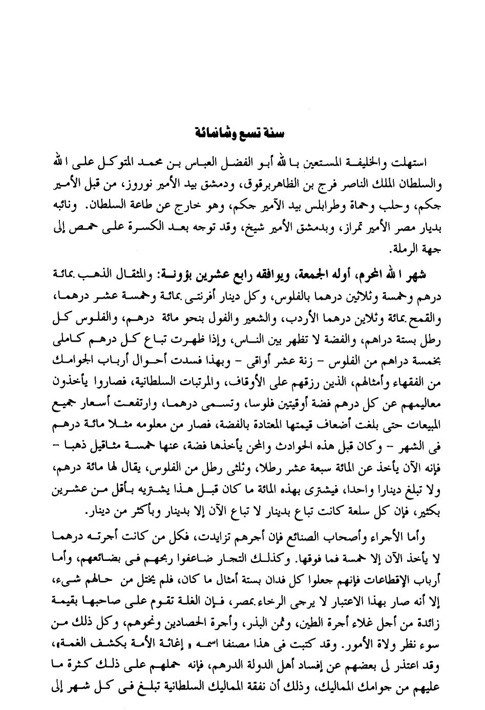 استهلت والخليفة المستعين بِاللَّه أَبُو الْفضل الْعَبَّاس بن مُحَمَّد المتَوَكل على الله وَالسُّلْطَان الْملك النَّاصِر فرج بن الظَّاهِر برقوق ودمشق بيد الْأَمِير نوروز من قبل الْأَمِير جكم وحلب وحماة وطرابلس بيد الْأَمِير جكم وَهُوَ خَارج عَن طَاعَة السُّلْطَان. ونائبه بديار مصر الْأَمِير تمراز وبدمشق الْأَمِير شيخ وَقد توجه بعد الكسرة على حمص إِلَى جِهَة الرملة. شهر الله الْمحرم أَوله الْجُمُعَة وَيُوَافِقهُ رَابِع عشْرين بؤونة: والمثقال الذَّهَب بِمِائَة دِرْهَم وَخَمْسَة وَثَلَاثِينَ درهما بالفلوس وكل دِينَار أفرنتي بِمِائَة وَخَمْسَة عشر درهما والقمح بِمِائَة وَثَلَاثِينَ درهما الأردب وَالشعِير والفول بِنَحْوِ مائَة دِرْهَم والفلوس كل رَطْل بِسِتَّة دَرَاهِم وَالْفِضَّة لَا تظهر بَين النَّاس وَإِذا ظَهرت تبَاع كل دِرْهَم كاملي بِخَمْسَة دَرَاهِم من الْفُلُوس - زنة عشر أواقي - وَبِهَذَا فَسدتْ أَحْوَال أَرْبَاب الجوامك من الْفُقَهَاء وأمثالهم الَّذين رزقهم على الْأَوْقَاف والمرتبات السُّلْطَانِيَّة فصاروا يَأْخُذُونَ معاليمهم عَن كل دِرْهَم فضَّة أوقيتين فُلُوسًا وتسمي درهما وَارْتَفَعت أسعار جَمِيع المبيعات حَتَّى بلغت أَضْعَاف قيمتهَا الْمُعْتَادَة بِالْفِضَّةِ فَصَارَ من معلومه مثلا مائَة دِرْهَم فِي الشَّهْر - وَكَانَ قبل هَذِه الْحَوَادِث والمحن يَأْخُذهَا فضَّة عَنْهَا خَمْسَة مَثَاقِيل ذَهَبا - فَإِنَّهُ الْآن يَأْخُذ عَن الْمِائَة سَبْعَة عشر رطلا وثلثي رَطْل من الْفُلُوس يُقَال لَهَا مائَة دِرْهَم وَلَا تبلغ دِينَارا وَاحِدًا فيشتري بِهَذِهِ الْمِائَة مَا كَانَ قبل هَذَا يَشْتَرِيهِ بِأَقَلّ من عشْرين بِكَثِير فَإِن كل سلْعَة كَانَت تبَاع بِدِينَار لَا تبَاع الْآن إِلَّا بِدِينَار وبأكثر من دِينَار. وَأما الأجراء وَأَصْحَاب الصَّنَائِع فَإِن أجرهم تزايدت فَكل من كَانَت أجرته درهما لَا يَأْخُذ الْآن إِلَّا خَمْسَة فَمَا فَوْقهَا. وَكَذَلِكَ التُّجَّار ضاعفوا ربحهم فِي بضائعهم وَأما أَرْبَاب الإقطاعات فَإِنَّهُم جعلُوا كل فدان بِسِتَّة أَمْثَال مَا كَانَ فَلم يخْتل من حَالهم شَيْء إِلَّا أَنه صَار بِهَذَا الِاعْتِبَار لَا يُرْجَى الرخَاء بِمصْر فَإِن الْغلَّة تقوم على صَاحبهَا بِقِيمَة زَائِدَة من أجل غلاء أُجْرَة الطين وَثمن الْبذر وَأُجْرَة الحصادين وَنَحْوهم وكل ذَلِك من سوء نظر وُلَاة الْأُمُور. وَقد كتبت فِي هَذَا مصنفاً اسْمه إغاثة الْأمة بكشف الْغُمَّة وَقد اعتذر لي بَعضهم عَن إِفْسَاد أهل الدولة الدِّرْهَم فَإِنَّهُ حملهمْ على ذَلِك كَثْرَة مَا عَلَيْهِم من جوامك المماليك وَذَلِكَ أَن نَفَقَة المماليك السُّلْطَانِيَّة تبلغ فِي كل شهر إِلَى