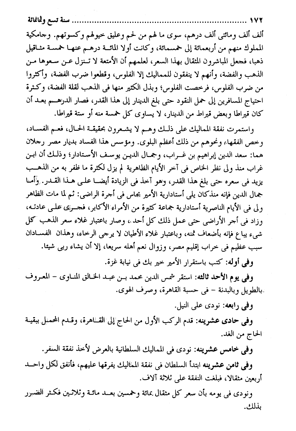 ألف ألف ومائتي ألف دِرْهَم سوى مَا لَهُم من لحم وعليق خيولهم وكسوتهم. وحامكية الْمَمْلُوك مِنْهُم من أَرْبَعمِائَة إِلَى خَمْسمِائَة وَكَانَت أَولا الْمِائَة دِرْهَم عَنْهَا خَمْسَة مَثَاقِيل ذَهَبا فَجعل المباشرون المثقال بِهَذَا السّعر لعلمهم أَن الْأَمْتِعَة لَا تنزل عَن سعرها من الذَّهَب وَالْفِضَّة وَأَنَّهُمْ لَا يُنْفقُونَ للمماليك إِلَّا الْفُلُوس وَقَطعُوا ضرب الْفضة وَأَكْثرُوا من ضرب الْفُلُوس فرخصت الْفُلُوس وبذل الْكثير مِنْهَا فِي الذَّهَب لقلَّة الْفضة وَكَثْرَة احْتِيَاج الْمُسَافِرين إِلَى حمل النُّقُود حَتَّى بلغ الدِّينَار إِلَى هَذَا الْقدر فَصَارَ الدِّرْهَم بعد أَن كَانَ قيراطاً وَبَعض قِيرَاط من الدِّينَار لَا يُسَاوِي كل خَمْسَة مِنْهُ أَو سِتَّة قيراطا. واستمرت نَفَقَة المماليك على ذَلِك وهم لَا يَشْعُرُونَ بِحَقِيقَة الْحَال فَعم الْفساد وَخص الْفُقَهَاء وَنَحْوهم من ذَلِك أعظم الْبلوى. ومؤسس هَذَا الْفساد بديار مصر رجلَانِ هما: سعد الدّين إِبْرَاهِيم بن غراب وجمال الدّين يُوسُف الأستادار وَذَلِكَ أَن ابْن غراب مُنْذُ ولي نظر الْخَاص فِي آخر الْأَيَّام الظَّاهِرِيَّة لم يزل لِكَثْرَة مَا ظفر بِهِ من الذَّهَب يزِيد فِي سعره حَتَّى بلغ هَذَا الْقدر وَهُوَ آخذ فِي الزِّيَادَة أَيْضا على هَذَا الْقدر. وَأما جمال الدّين فَإِنَّهُ مُنْذُ كَانَ يَلِي أستادارية الْأَمِير بجاس فِي أُجْرَة الراضي: ثمَّ لما مَاتَ الظَّاهِر ولي فِي الْأَيَّام الناصرية أستادارية جمَاعَة كَثِيرَة من الْأُمَرَاء الأكابر فَجرى على عَادَته وَزَاد فِي أجر الْأَرَاضِي حَتَّى عمل ذَلِك كل أحد وَصَارَ بِاعْتِبَار غلاء سعر الذَّهَب كل شَيْء يُبَاع فَإِنَّهُ بأضعاف ثمنه وَبِاعْتِبَار غلاء الأطيان لَا يُرْجَى الرخَاء وَهَذَانِ الفسادان سَبَب عَظِيم فِي خراب إقليم مصر وَزَوَال نعم أَهله سَرِيعا إِلَّا أَن يَشَاء رَبِّي شَيْئا. وَفِي أَوله: كتب باستقرار الْأَمِير خير بك فِي نِيَابَة غَزَّة. وَفِي يَوْم الْأَحَد ثالثه: اسْتَقر شمس الدّين مُحَمَّد بن عبد الْخَالِق الْمَنَاوِيّ - الْمَعْرُوف بالطويل وبالبدنة - فِي حسبَة الْقَاهِرَة وَصرف الْهوى. وَفِي رابعه: نُودي على النّيل. وَفِي حادي عشرينه: قدم الركب الأول من الْحَاج إِلَى الْقَاهِرَة وَقدم الْمحمل بِبَقِيَّة الْحَاج من الْغَد. وَفِي خَامِس عشرينه: نُودي فِي المماليك السُّلْطَانِيَّة بِالْعرضِ لأخذ نَفَقَة السّفر. وَفِي ثامن عشرينه ابْتَدَأَ السُّلْطَان فِي نَفَقَة المماليك يفرقها عَلَيْهِم فأنفق لكل وَاحِد أَرْبَعِينَ مِثْقَالا فبلغت النَّفَقَة على ثَلَاثَة آلَاف. وَنُودِيَ فِي يَوْمه بِأَن سعر كل مِثْقَال بِمِائَة وَخمسين بعد مائَة وَثَلَاثِينَ فَكثر الضَّرَر بذلك.