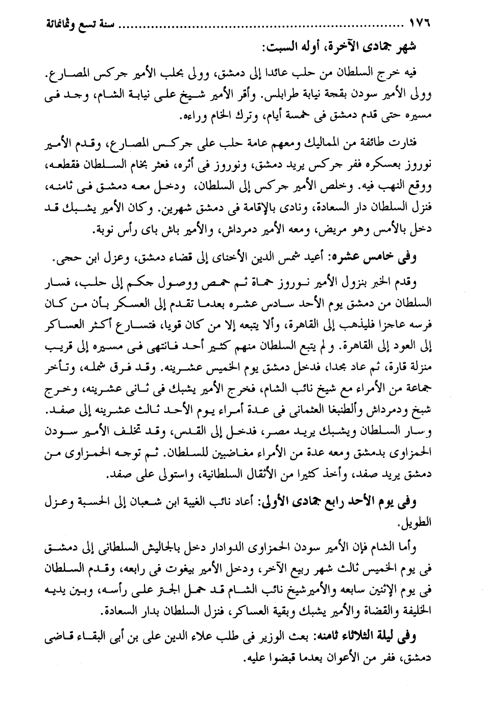 شهر جُمَادَى الْآخِرَة أَوله السبت: فِيهِ خرج السُّلْطَان من حلب عَائِدًا إِلَى دمشق وَولي بحلب الْأَمِير جركس المصارع. وَولي الْأَمِير سودن بقجة نِيَابَة طرابلس. وَأقر الْأَمِير شيخ على نِيَابَة الشَّام وجد فِي مسيره حَتَّى قدم دمشق فِي خَمْسَة أَيَّام وَترك الخام وَرَاءه. فثارت طَائِفَة من المماليك وَمَعَهُمْ عَامَّة حلب على جركس المصارع وَقدم الْأَمِير نوروز بعسكره ففر جركس يُرِيد دمشق ونوروز فِي أَثَره فعثر بخام السُّلْطَان فَقَطعه وَوَقع النهب فِيهِ. وخلص الْأَمِير جركس إِلَى السُّلْطَان وَدخل مَعَه دمشق فِي ثامنه فَنزل السُّلْطَان دَار السَّعَادَة ونادى بِالْإِقَامَةِ فِي دمشق شَهْرَيْن. وَكَانَ الْأَمِير يشبك قد دخل بالْأَمْس وَهُوَ مَرِيض وَمَعَهُ الْأَمِير دمرداش والأمير باش باي رَأس نوبَة. وَهِي خَامِس عشره: أُعِيد شمس الدّين الأخناي إِلَى قَضَاء دمشق وعزل ابْن حجي. وَقدم الْخَبَر بنزول الْأَمِير نوروز حماة ثمَّ حمص ووصول جكم إِلَى حلب فَسَار السُّلْطَان من دمشق يَوْم الْأَحَد سادس عشره بَعْدَمَا تقدم إِلَى الْعَسْكَر بِأَن من كَانَ فرسه عَاجِزا فليذهب إِلَى الْقَاهِرَة وَألا يتبعهُ إِلَّا من كَانَ قَوِيا فَتسَارع أَكثر العساكر إِلَى الْعود إِلَى الْقَاهِرَة. وَلم يتبع السُّلْطَان مِنْهُم كثير أحد فَانْتهى فِي مسيره إِلَى قريب منزلَة قارة ثمَّ عَاد مجداً فَدخل دمشق يَوْم الْخَمِيس عشرينه. وَقد فرق شَمله وَتَأَخر جمَاعَة من الْأُمَرَاء مَعَ شيخ نَائِب الشَّام فَخرج الْأَمِير يشبك فِي ثَانِي عشرينه وَخرج شبح ودمرداش وألطنبغا العثماني فِي عدَّة أُمَرَاء يَوْم الْأَحَد ثَالِث عشرينه إِلَى صفد. وَسَار السُّلْطَان ويشبك يُرِيد مصر فَدخل إِلَى الْقُدس وَقد تخلف الْأَمِير سودن الحمزاوي بِدِمَشْق وَمَعَهُ عدَّة من الْأُمَرَاء مغاضبين للسُّلْطَان. ثمَّ توجه الحمزاوي من دمشق يُرِيد صفد وَأخذ كثيرا من الأثقال السُّلْطَانِيَّة وَاسْتولى على صفد. وَفِي يَوْم الْأَحَد رَابِع جُمَادَى الأولى: أعَاد نَائِب الْغَيْبَة ابْن شعْبَان إِلَى الْحِسْبَة وعزل الطَّوِيل. وَأما الشَّام فَإِن الْأَمِير سودن الحمزاوي الدوادار دخل بالجاليش السلطاني إِلَى دمشق فِي يَوْم الْخَمِيس ثَالِث شهر ربيع الآخر وَدخل الْأَمِير بيغوت فِي رابعه وَقدم السُّلْطَان فِي يَوْم الِاثْنَيْنِ سابعه والأمير شيخ نَائِب الشَّام قد حمل الجتر على رَأسه وَبَين يَدَيْهِ الْخَلِيفَة والقضاة والأمير يشبك وَبَقِيَّة العساكر فَنزل السُّلْطَان بدار السَّعَادَة. وَفِي لَيْلَة الثُّلَاثَاء ثامنه: بعث الْوَزير فِي طلب عَلَاء الدّين عَليّ بن أبي الْبَقَاء قَاضِي دمشق ففر من الأعوان بَعْدَمَا قبضوا عَلَيْهِ.
