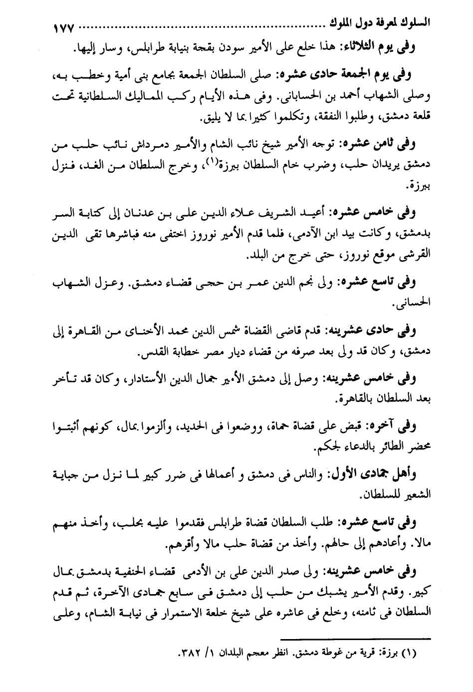 وَفِي يَوْم الثُّلَاثَاء: هَذَا خلع على الْأَمِير سودن بقجة بنيابة طرابلس وَسَار إِلَيْهَا. وَفِي يَوْم الْجُمُعَة حادي عشره: صلى السُّلْطَان الْجُمُعَة بِجَامِع بني أُميَّة وحطب بِهِ وَصلى الشهَاب أَحْمد بن الحساباني. وَفِي هَذِه الْأَيَّام ركب المماليك السُّلْطَانِيَّة تَحت قلعة دمشق وطلبوا النَّفَقَة وَتَكَلَّمُوا كثيرا بِمَا لَا يَلِيق وَفِي ثامن عشره: توجه الْأَمِير شيخ نَائِب الشَّام والأمير دمرداش نَائِب حلب من دمشق يُريدَان حلب وَضرب خام السُّلْطَان ببرزة وَخرج السُّلْطَان من الْغَد فَنزل ببرزة. وَفِي خَامِس عشره: أُعِيد الشريف عَلَاء الدّين عَليّ بن عدنان إِلَى كِتَابَة السِّرّ بِدِمَشْق وَكَانَت بيد ابْن الْآدَمِيّ فَلَمَّا قدم الْأَمِير نوروز اختفى مِنْهُ مباشرها تَقِيّ الدّين الْقرشِي موقع نوروز حَتَّى حوج من الْبَلَد. وَفِي تَاسِع عشره: ولي نجم الدّين عمر بن حجي قَضَاء دمشق. وعزل الشهَاب الحساني. وَفِي حادي عشرينه: قدم قَاضِي الْقُضَاة شمس الدّين مُحَمَّد الأخناي من الْقَاهِرَة إِلَى دمشق وَكَاد قد ولي بعد صرفه من قَضَاء ديار مصر خطابة الْقُدس. وَفِي خَامِس عشرينه: وصل إِلَى دمشق الْأَمِير جمال الدّين الأستادار وَكَانَ قد تَأَخّر بعد السُّلْطَان بِالْقَاهِرَةِ. وَفِي آخِره: قبض على قُضَاة حماة وَوَضَعُوا فِي الْحَدِيد وألزموا بِمَال كَونهم أثبتوا محْضر الطَّائِر بِالدُّعَاءِ لجكم. وَأهل جُمَادَى الأول: وَالنَّاس فِي دمشق وأعمالها فِي ضَرَر كَبِير لما نزل من جباية الشّعير للسُّلْطَان. وَفِي تَاسِع عشره: طلب السُّلْطَان قُضَاة طرابلس فقدموا عَلَيْهِ بحلب وَأخذ مِنْهُم مَالا. وأعادهم إِلَى حَالهم. وَأخذ من قُضَاة حلب مَالا وأقرهم. وَفِي خَامِس عشرينه: ولي صدر الدّين عَليّ بن الأدمِيّ قَضَاء الْحَنَفِيَّة بِدِمَشْق بِمَال كَبِير. وَقدم الْأَمِير يشبك من حلب إِلَى دمشق فِي سَابِع جُمَادَى الْآخِرَة ثمَّ قدم السُّلْطَان فِي ثامنه وخلع فِي عاشره على شيخ خلعة الِاسْتِمْرَار فِي نِيَابَة الشَّام وعَلى