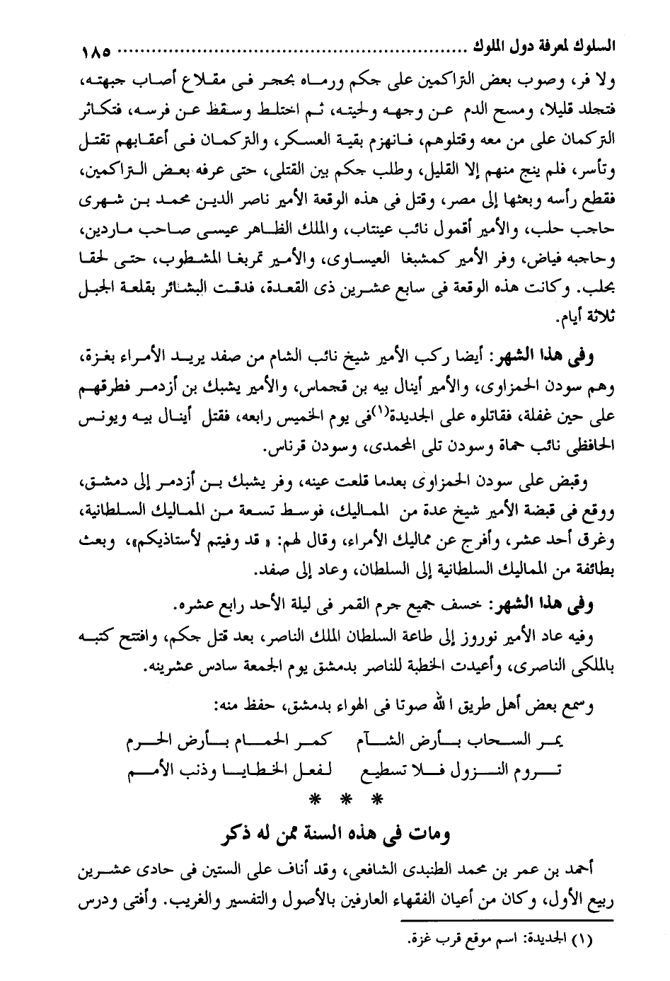 وَلَا فر وَصوب بعض التراكمين على جكم ورماه بِحجر فِي مقلاع أصَاب جَبهته فتجلد قَلِيلا وَمسح الدَّم عَن وَجهه ولحيته ثمَّ اخْتَلَط وَسقط عَن فرسه فتكاثر التركمان على من مَعَه وقتلوهم فَانْهَزَمَ بَقِيَّة الْعَسْكَر والتركمان فِي أَعْقَابهم تقتل وتأسر فَلم ينج مِنْهُم إِلَّا الْقَلِيل وَطلب جكم بَين الْقَتْلَى حَتَّى عرفه بعض التراكمين فَقطع رَأسه وبعثها إِلَى مصر وَقتل فِي هَذِه الْوَقْعَة الْأَمِير نَاصِر الدّين مُحَمَّد بن شَهْري حَاجِب حلب والأمير أقمول نَائِب عينتاب وَالْملك الظَّاهِر عِيسَى صَاحب ماردين وحاجبه فياض وفر الْأَمِير كمشبغا العيساوي والأمير تمربعا المشطوب حَتَّى لَحقا بحلب. وَكَانَت هَذِه الْوَقْعَة فِي سَابِع عشْرين ذِي الْقعدَة فدقت البشائر بقلعة الْجَبَل ثَلَاثَة أَيَّام. وَفِي هَذَا الشَّهْر: أَيْضا ركب الْأَمِير شيخ نَائِب الشَّام من صفد يُرِيد الْأُمَرَاء بغزة وهم سودن الحمزاوي والأمير أينال بيه بن قجماس والأمير يشبك بن أزدمر فطرقهم على حِين غَفلَة فقاتلوه على الجديدة فِي يَوْم الْخَمِيس رابعه فَقتل أينال بيه وَيُونُس الحافظي نَائِب حماة وسودن تلِي المحمدي وسودن قرناس. وَقبض على سودن الحمزاوي بَعْدَمَا قلعت عينه وفر يشبك بن أزدمر إِلَى دمشق وَوَقع فِي قَبْضَة الْأَمِير شيخ عدَّة من المماليك فوسط تِسْعَة من المماليك السُّلْطَانِيَّة وغرق أحد عشر وَأَفْرج عَن مماليك الْأُمَرَاء وَقَالَ لَهُم: قد وفيتم لأستاذيكم وَبعث بطَائفَة من المماليك السُّلْطَانِيَّة إِلَى السُّلْطَان وَعَاد إِلَى صفد. وَفِي هَذَا الشَّهْر: خسف جَمِيع جرم الْقَمَر فِي لَيْلَة الْأَحَد رَابِع عشره. وَفِيه عَاد الْأَمِير نوروز إِلَى طَاعَة السُّلْطَان الْملك النَّاصِر بعد قتل جكم وافتتح كتبه بالملكي الناصري وأعيدت الْخطْبَة للناصر بِدِمَشْق يَوْم الْجُمُعَة سادس عشرينه. وَسمع بعض أهل طَرِيق الله صَوتا فِي الْهَوَاء بِدِمَشْق حفظ مِنْهُ: يمر السَّحَاب بِأَرْض الشَّام كمر الْحمام بِأَرْض الْحرم تروم النُّزُول فَلَا تسطيع لفعل الْخَطَايَا وذنب الْأُمَم وَمَات فِي هَذِه السّنة مِمَّن لَهُ ذكر أَحْمد بن عمر بن مُحَمَّد الطنبدي الشَّافِعِي وَقد أناف على السِّتين فِي حادي عشْرين ربيع الأول وَكَانَ من أَعْيَان الْفُقَهَاء العارفين بالأصول وَالتَّفْسِير والغريب. وَأفْتى ودرس