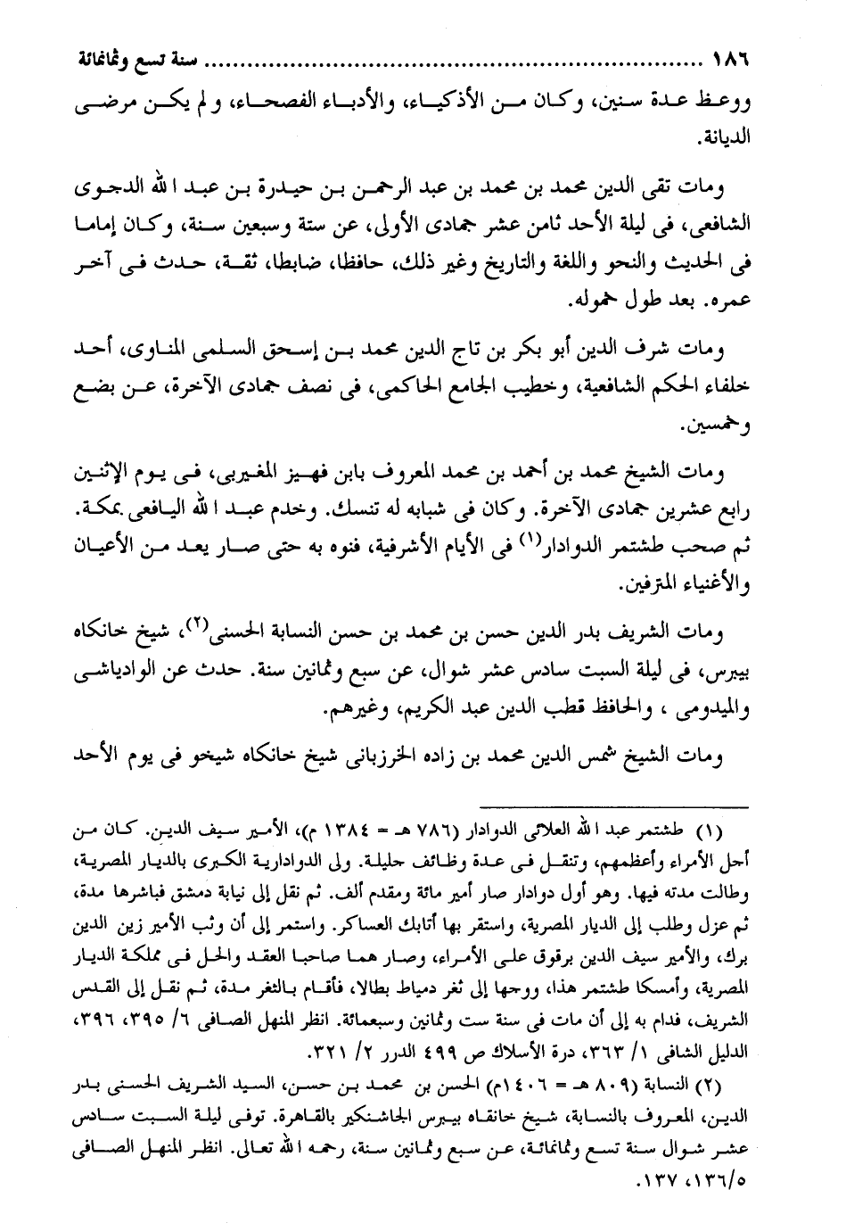 وَوعظ عدَّة سِنِين وَكَانَ من الأذكياء والأدباء الفصحاء وَلم يكن مرضى الدّيانَة. وَمَات تَقِيّ الدّين مُحَمَّد بن مُحَمَّد بن عبد الرَّحْمَن بن حيدرة بن عبد الله الدجوي الشَّافِعِي فِي لَيْلَة الْأَحَد ثامن عشر جُمَادَى الأولى عَن سِتَّة وَسبعين سنة وَكَانَ إِمَامًا فِي الحَدِيث والنحو واللغة والتاريخ وَغير ذَلِك حَافِظًا ضابطاً ثِقَة حدث فِي آخر عمره. بعد طول خموله. وَمَات شرف الدّين أَبُو بكر بن تَاج الدّين مُحَمَّد بن اسحق السّلمِيّ الْمَنَاوِيّ أحد خلفاء الحكم الشَّافِعِيَّة وخطب الْجَامِع الحاكمي فِي نصف جُمَادَى الْآخِرَة عَن بضع وَخمسين. وَمَات الشَّيْخ مُحَمَّد بن أَحْمد بن مُحَمَّد الْمَعْرُوف بِابْن فهيز المغيربي فِي يَوْم الِاثْنَيْنِ رَابِع عشْرين جُمَادَى الْآخِرَة. وَكَانَ فِي شبابه لَهُ تنسك. وخدم عبد الله اليافعي بِمَكَّة. ثمَّ صحب طشتمر الدوادار فِي الْأَيَّام الأشرفية فَنَوَّهَ بِهِ حَتَّى صَار يعد من الْأَعْيَان والأغنياء المترفين. وَمَات الشريف بدر الدّين حسن بن مُحَمَّد بن حسن النسابة الْحسنى شيخ خانكاه بيبرس فِي لَيْلَة السبت سادس عشر شَوَّال عَن سبع وَثَمَانِينَ سنة. حدث عَن الوادياشي والميدومي والحافظ قطب الدّين عبد الْكَرِيم وَغَيرهم. وَمَات الشَّيْخ شمس الدّين مُحَمَّد بن زَاده الخرزباني شيخ خانكاه شيخو فِي يَوْم الْأَحَد