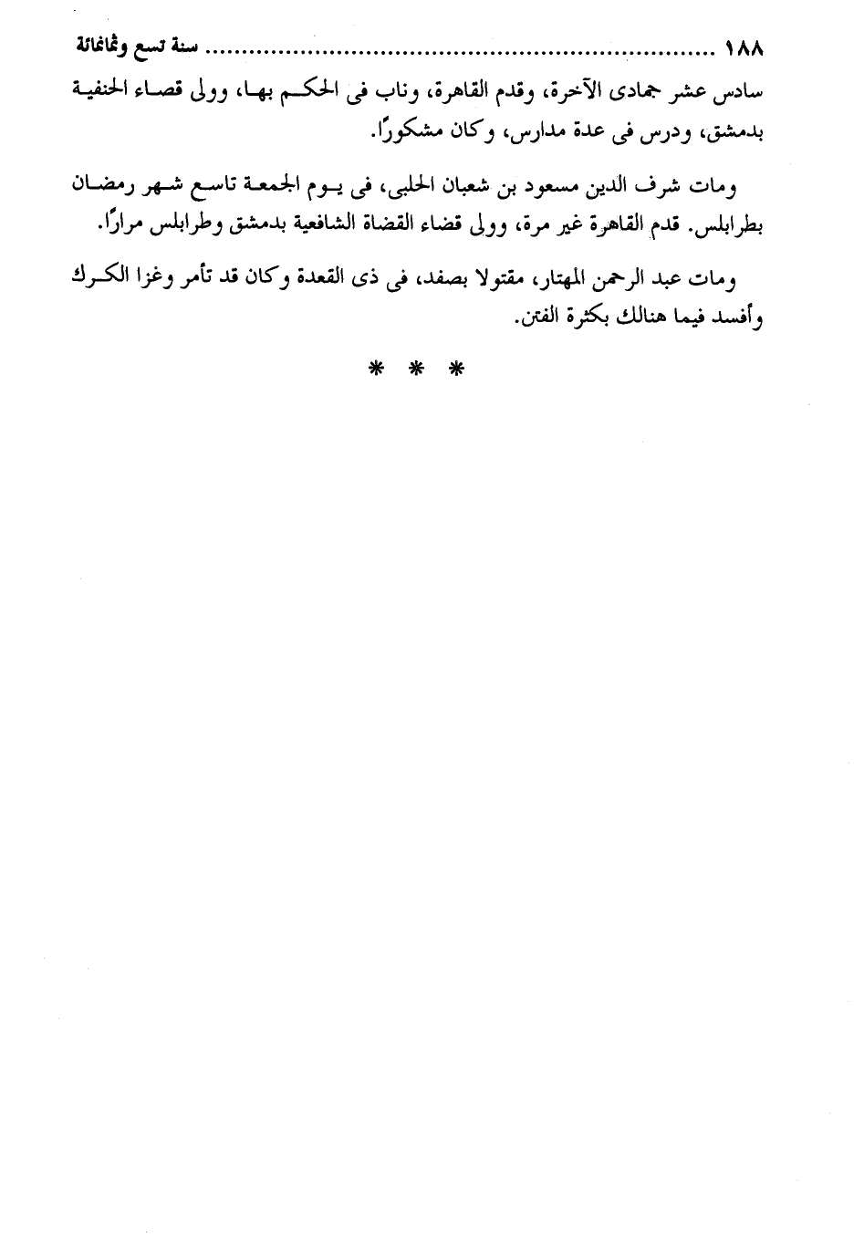 سادس عشر جُمَادَى الْآخِرَة وَقدم الْقَاهِرَة وناب فِي الحكم بهَا وَولي قَضَاء الْحَنَفِيَّة بِدِمَشْق ودرس فِي عدَّة مدارس وَكَانَ مشكوراً. وَمَات شرف الدّين مَسْعُود بن شعْبَان الْحلَبِي فِي يَوْم الْجُمُعَة تَاسِع شهر رَمَضَان بطرابلس. قدم الْقَاهِرَة غير مرّة وَولي قَضَاء الْقُضَاة الشَّافِعِيَّة بِدِمَشْق وطرابلس مرَارًا. وَمَات عبد الرَّحْمَن المهتار مقتولاً بصفد فِي ذِي الْقعدَة وَكَانَ قد تَأمر وغزا الكرك وأفسد فِيمَا هُنَالك بِكَثْرَة الْفِتَن.