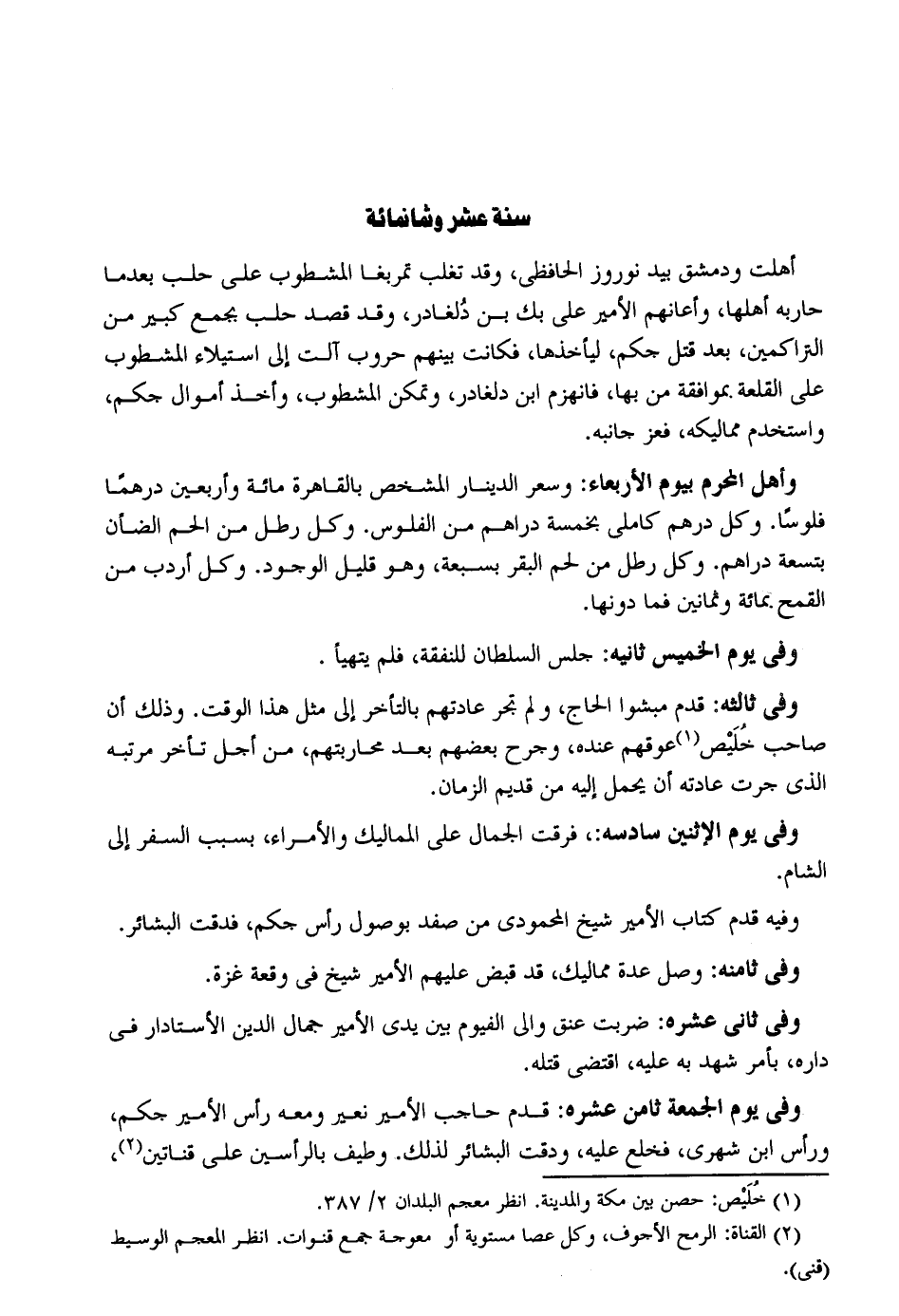 أهلت ودمشق بيد نوروز الحافظي وَقد تغلب تمربغا المشطوب على حلب بَعْدَمَا حاربه أَهلهَا وَأَعَانَهُمْ الْأَمِير عَليّ بك بن دلغادر وَقد قصد حلب بِجمع كَبِير من التراكمين بعد قتل جكم ليأخذها فَكَانَت بَينهم حروب آلت إِلَى اسْتِيلَاء المشطوب على القلعة بموافقة من بهَا فَانْهَزَمَ ابْن دلغادر وَتمكن المشطوب وَأخذ أَمْوَال حكم واستخدم مماليكه فعز جَانِبه. وَأهل الْمحرم بِيَوْم الْأَرْبَعَاء: وسعر الدِّينَار المشخص بِالْقَاهِرَةِ مائَة وَأَرْبَعين درهما فُلُوسًا. وكل دِرْهَم كاملي بِخَمْسَة دَرَاهِم من الْفُلُوس. وكل رَطْل من الحم الضَّأْن بِتِسْعَة دَرَاهِم. وكل رَطْل من لحم الْبَقر بسبعة وَهُوَ قَلِيل الْوُجُود. وكل أردب من الْقَمْح بِمِائَة وَثَمَانِينَ فَمَا دونهَا. وَفِي يَوْم الْخَمِيس ثَانِيه: جلس السُّلْطَان للنَّفَقَة فَلم يتهيأ. وَفِي ثالثه: قدم مبشوا الْحَاج وَلم تجر عَادَتهم بالتأخر إِلَى مثل هَذَا الْوَقْت. وَذَلِكَ أَن صَاحب خليص عوقهم عِنْده وجرح بَعضهم بعد محاربتهم من أجل تَأَخّر مرتبه الَّذِي جرت عَادَته أَن يحمل إِلَيْهِ من قديم الزَّمَان. وَفِي يَوْم الِاثْنَيْنِ سادسه: فرقت الْجمال على الممالك والأمراء بِسَبَب السّفر إِلَى الشَّام. وَفِيه قدم وَفِي ثامنه: وصل عدَّة مماليك قد قبض عَلَيْهِم الْأَمِير شيخ فِي وقْعَة غَزَّة. وَفِي ثَانِي عشره: ضربت عنق وَالِي الفيوم بَين يَدي الْأَمِير جمال الدّين الأستادار فِي دَاره بِأَمْر شهد بِهِ عَلَيْهِ اقْتضى قَتله. وَفِي يَوْم الْجُمُعَة ثامن عشره: تدم حَاجِب الْأَمِير نعير وَمَعَهُ رَأس الْأَمِير جكم وَرَأس ابْن شَهْري فَخلع عَلَيْهِ ودقت البشائر لذَلِك. وطيف بالرأسين على قناتين