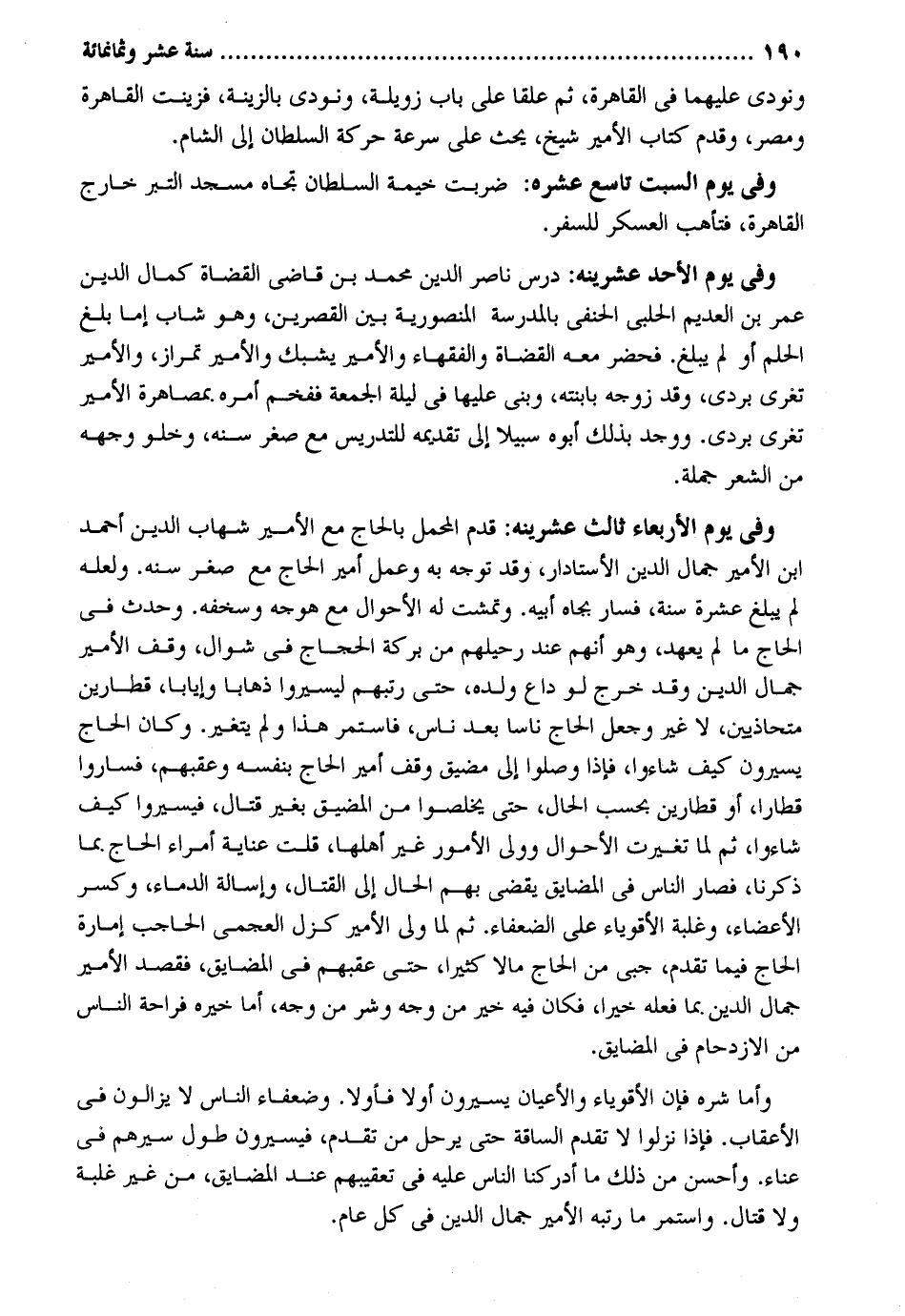 وَنُودِيَ عَلَيْهِمَا فِي الْقَاهِرَة ثمَّ علقا على بَاب زويلة وَنُودِيَ بالزينة فزينت الْقَاهِرَة ومصر وَقدم كتاب الْأَمِير شيخ يحث على سرعَة حَرَكَة السُّلْطَان إِلَى الشَّام. وَفِي يَوْم السبت تَاسِع عشره: ضربت خيمة السُّلْطَان تجاه مَسْجِد التبر خَارج الْقَاهِرَة فتأهب الْعَسْكَر للسَّفر. وَفِي يَوْم الْأَحَد عشرينه: درس نَاصِر الدّين مُحَمَّد بن قَاضِي الْقُضَاة كَمَال الدّين عمر بن العديم الْحلَبِي الْحَنَفِيّ بِالْمَدْرَسَةِ المنصورية بَين القصرين وَهُوَ شَاب إِمَّا بلغ الْحلم أَو لم يبلغ. فَحَضَرَ مَعَه الْقُضَاة وَالْفُقَهَاء والأمير يشبك والأمير تمراز والأمير تغري بردى وَقد زوجه بابنته وَبني عَلَيْهَا فِي لَيْلَة الْجُمُعَة ففخم أمره بمصاهرة الْأَمِير تغري بردى. وَوجد بذلك أَبوهُ سَبِيلا إِلَى تَقْدِيمه للتدريس مَعَ صغر سنه وخلو وَجهه من الشّعْر جملَة. وَفِي يَوْم الْأَرْبَعَاء ثَالِث عشرينه: قدم الْمحمل بالحاج مَعَ الْأَمِير شهَاب الدّين أَحْمد ابْن الْأَمِير جمال الدّين الأستادار وَقد توجه بِهِ وَعمل أَمِير الْحَاج مَعَ صغر سنه. وَلَعَلَّه لم يبلغ عشرَة سنة فَسَار بجاه أَبِيه. وتمشت لَهُ الْأَحْوَال مَعَ هوجه وسخفه. وَحدث فِي الْحَاج مَا لم يعْهَد وَهُوَ أَنهم عِنْد رحيلهم من بركَة الْحجَّاج فِي شَوَّال وقف الْأَمِير جمال الدّين وَقد خرج لوداع وَلَده حَتَّى رتبهم ليسيروا ذَهَابًا وإياباً قطارين متحاذيين لَا غير وَجعل الْحَاج نَاسا بعد نَاس فاستمر هَذَا وَلم يتَغَيَّر. وَكَانَ الْحَاج يَسِيرُونَ كَيفَ شَاءُوا فَإِذا وصلوا إِلَى مضيق وقف أَمِير الْحَاج بِنَفسِهِ وعقبهم فَسَارُوا قطاراً أَو قطارين بِحَسب الْحَال حَتَّى يخلصوا من الْمضيق بِغَيْر قتال فيسيروا كَيفَ شَاءُوا ثمَّ لما تَغَيَّرت الْأَحْوَال وَولي الْأُمُور غير أَهلهَا قلت عناية أُمَرَاء الْحَاج بِمَا ذكرنَا فَصَارَ النَّاس فِي المضايق يقْضِي بهم الْحَال إِلَى الْقِتَال وإسالة الدِّمَاء وَكسر الْأَعْضَاء وَغَلَبَة الأقوياء على الضُّعَفَاء. ثمَّ لما ولي الْأَمِير كزل العجمي الْحَاجِب إِمَارَة الْحَاج فِيمَا تقدم جبى من الْحَاج مَالا كثيرا حَتَّى عقبهم فِي المضايق فقصد الْأَمِير جمال الدّين بِمَا فعله خيرا فَكَانَ فِيهِ خير من وَجه وَشر من وَجه أما خَيره فراحة النَّاس من الازدحام فِي المضايق. وَأما شَره فَإِن الأقوياء والأعيان يَسِيرُونَ أَولا فأولاً. وضعفاء النَّاس لَا يزالون فِي الأعقاب. فَإِذا نزلُوا لَا تقدم السَّاقَة حَتَّى يرحل من تقدم فيسيرون طول سيرهم فِي عناء. وَأحسن من ذَلِك مَا أدركنا النَّاس عَلَيْهِ فِي تعقيبهم عِنْد المضايق من غير غَلَبَة وَلَا قتال. وَاسْتمرّ مَا رتبه الْأَمِير جمال الدّين فِي كل عَام.