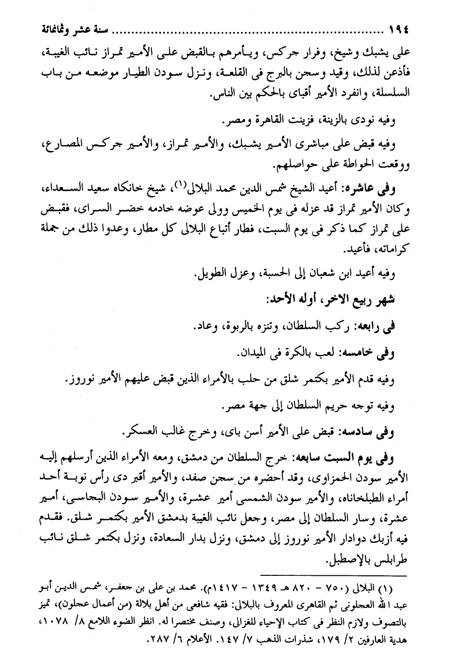 على يشبك وَشَيخ وفرار جركس وَيَأْمُرهُمْ بِالْقَبْضِ على الْأَمِير تمراز نَائِب الْغَيْبَة فأذعن لذَلِك وَقيد وسجن بالبرج فِي القلعة وَنزل سودن الطيار مَوْضِعه من بَاب السلسلة وَانْفَرَدَ الْأَمِير أقباي بالحكم بَين النَّاس. وَفِيه نُودي بالزينة فزينت الْقَاهِرَة ومصر. وَفِيه قبض على مباشري الْأَمِير وَفِي عاشره: أُعِيد الشَّيْخ شمس الدّين مُحَمَّد البلالي شيخ خانكاه سعيد السُّعَدَاء وَكَانَ الْأَمِير تمراز قد عَزله فِي يَوْم الْخَمِيس وَولي عوضه خادمه خضر السراي فَقبض على تمراز كَمَا ذكر فِي يَوْم السبت فطار أَتبَاع البلالي كل مطار وعدوا ذَلِك من جملَة كراماته فأعيد. وَفِيه أُعِيد ابْن شعْبَان إِلَى الْحِسْبَة وعزل الطَّوِيل. شهر ربيع الآخر أَوله الْأَحَد: فِي رابعه: ركب السُّلْطَان وتنزه بالربوة وَعَاد. وَفِي خامسه: لعب بالكرة فِي الميدان. وَفِيه قدم الْأَمِير بكتمر شلق من حلب بالأمراء الَّذين قبض عَلَيْهِم الْأَمِير نوروز. وَفِيه توجه حَرِيم السُّلْطَان إِلَى جِهَة مصر. وَفِي سادسه: قبض على الْأَمِير أسن باي وَخرج غَالب الْعَسْكَر. وَفِي يَوْم السبت سابعه: خرج السُّلْطَان من دمشق وَمَعَهُ الْأُمَرَاء الَّذين أرسلهم إِلَيْهِ الْأَمِير سودن الحمزاوي وَقد أحضرهُ من سجن صفد والأمير أقبر دي رَأس نوبَة أحد أُمَرَاء الطبلخاناه والأمير سودن الشمسي أَمِير عشرَة والأمير سودن البجاسي أَمِير عشرَة وَسَار السُّلْطَان إِلَى مصر وَجعل نَائِب الْغَيْبَة بِدِمَشْق الْأَمِير بكتمر شلق. فَقدم فِيهِ أزبك دوادار الْأَمِير نوروز إِلَى دمشق وَنزل بدار السَّعَادَة وَنزل بكتمر شلق نَائِب طرابلس بالإصطبل.
