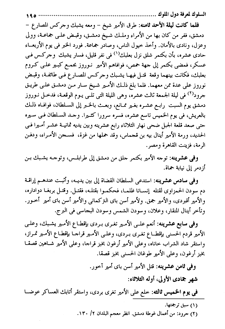 فَلَمَّا كَانَت لَيْلَة الْأَحَد ثامنه: طرق الْأَمِير شيخ - وَمَعَهُ يشبك وجركس المصارع - دمشق ففر من كَانَ بهَا من الْأُمَرَاء وَملك شيخ دمشق وَقبض على جمَاعَة وَولي وعزل ونادى بالأمان. وَأخذ خُيُول النَّاس وصادر جمَاعَة. فورد الْخَبَر فِي يَوْم الْأَرْبَعَاء حادي عشره بِأَن بكتمر شلق نزل بعلبك فِي نفر قَلِيل فَسَار يشبك وجركس فِي عَسْكَر فَمضى بكتمر إِلَى جِهَة حمص فوافاهم الْأَمِير نوروز بِجمع كَبِير على كروم بعلبك فَكَانَت بَينهمَا وقْعَة قتل فِيهَا يشبك وجركس المصارع فِي طَائِفَة وَقبض نوروز على عدَّة مِمَّن مَعَهُمَا. فَلَمَّا بلغ ذَلِك الْأَمِير شيخ سَار من دمشق على طَرِيق جرود فِي لَيْلَة الْجُمُعَة ثَالِث عشره وَهِي اللَّيْلَة الَّتِي تلِي يَوْم الْوَقْعَة مدْخل نوروز دمشق يَوْم السبت رَابِع عشره بِغَيْر ممانع وَبعث بالْخبر إِلَى السُّلْطَان فوافاه ذَلِك بالعريش فِي يَوْم الْخَمِيس تَاسِع عشره فسره سُرُورًا كثيرا. وجد السُّلْطَان فِي سيره حَتَّى صعد قلعة الْجَبَل ضحى نَهَار الثُّلَاثَاء رَابِع عشرينه وَبَين يَدَيْهِ ثَمَانِيَة عشر أَمِيرا فِي الْحَدِيد ورمة الْأَمِير أينال بيه بن قجماس وَقد حملهَا من غَزَّة فسجن الْأُمَرَاء وَدفن الرمة فزينت الْقَاهِرَة ومصر. وَفِي عشرينه: توجه الْأَمِير بكتمر جلق من دمشق إِلَى طرابلس وَتوجه يشبك بن أزدمر إِلَى نِيَابَة حماة. وَفِي سادس عشرينه: استدعى السُّلْطَان الْقُضَاة إِلَى بَين يَدَيْهِ وَأثبت عِنْدهم إِرَاقَة دم سودن الحمزاوي لقَتله إنْسَانا ظلما فحكموا بقتْله فَقتل. وَقتل بربغا دواداره والأمير أقبردي والأمير جمق. ولأمير أسن باي التركماني والأمير أسن باي أَمِير أخور. وَتَأَخر أينال المنقار وعلان وسودن الشَّمْس وسودن البجاسي فِي البرج. وَفِي سَابِع عشرينه: أنعم على الْأَمِير تغري بردى بإقطاع الْأَمِير يشبك وعَلى الْأَمِير قردم الحسني بإقطاع تغري بردى وعَلى الْأَمِير قراجا بإقطاع الْأَمِير تمراز وَاسْتقر شاد الشَّرَاب خاناه وعَلى الْأَمِير أرغون بِخبْز قراجا وعَلى الْأَمِير شاهين قصقا بِخبْز أرغون وعَلى الْأَمِير طوغان الحسني بِخبْز قصقا. وَفِي ثامن عشرينه: قتل الْأَمِير أسن باي أَمِير أخور. شهر جُمَادَى الأولى أَوله الثُّلَاثَاء: فِي يَوْم الْخَمِيس ثالثه: خلع على الْأَمِير تغري بردى وَاسْتقر أتابك العساكر عوضا