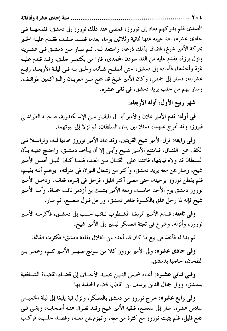 لمحمدي فَلم يدركهم فَعَاد إِلَى نوروز فَمضى عِنْد ذَلِك نوروز إِلَى دمشق فَقَدمهَا فِي حادي عشره بعد غيبته عَنْهَا ثَمَانِيَة وَثَلَاثِينَ يَوْمًا بَعْدَمَا قصد صفد فَقدم عَلَيْهِ الْخَبَر بحركة الْأَمِير شيخ فَضَاقَ بذلك ذرعه واستعد لَهُ. ثمَّ سَار من دمشق فِي عشرينه وَنزل بَرزَة فَقدم عَلَيْهِ من الْغَد سودن المحمدي فَارًّا من بكنمر حلق وَقد قدم عَلَيْهِ غَزَّة وَأَخذهَا فَأَعَادَهُ إِلَى دمشق حَتَّى أصلح شَأْنه وَلحق بِهِ فِي لَيْلَة الْأَرْبَعَاء رَابِع عشرينه فَسَار إِلَى حمص وَكَانَ الْأَمِير شيخ قد جمع من العربان والتراكمين طوائف. وَسَار بهم من حلب يُرِيد دمشق فِي ثَانِي عشره. شهر ربيع الأول أَوله الْأَرْبَعَاء: فِي أَوله: قدم الْأَمِير عَلان والأمير أينال المنقار من الْإسْكَنْدَريَّة صُحْبَة الطواشي فَيْرُوز وَقد أفرج عَنْهُمَا فمثلا بَين يَدي السُّلْطَان ثمَّ نزلا إِلَى بيوتهما. وَفِي رابعه: نزل الْأَمِير شيخ القريتين وَقد عَاد الْأَمِير نوروز محادياً لَهُ وتراسلا فِي الْكَفّ عَن الْقِتَال فَامْتنعَ الْأَمِير شيخ وَأبي إِلَّا أَن يَأْخُذ دمشق وَاحْتج عَلَيْهِ بِأَن السُّلْطَان قد ولاه نيابتها فاعتدا على الْقِتَال من الْغَد فَلَمَّا كَانَ اللَّيْل تحمل الْأَمِير شيخ وَسَار بِمن مَعَه يُرِيد دمشق وَأكْثر من إشعال النيرَان فِي مَنْزِلَته يُوهم أَنه يُقيم فَلم يفْطن نوروز برحيله حَتَّى مضى أَكثر اللَّيْل فَرَحل فِي إثره ففاته. وَدخل الْأَمِير نوروز دمشق يَوْم الْأَحَد خامسه وَمَعَهُ الْأَمِير يشبك بن أزدمر نَائِب حماة. وَأما الْأَمِير شيخ فَإِنَّهُ لما رَحل علق بالكسوة ظَاهر دمشق ورحل فَنزل سعسع ثمَّ سَار. وَفِي ثامنه: قدم الْأَمِير تمربغا المشطوب نَائِب حلب إِلَى دمشق فَأكْرمه الْأَمِير نوروز وأنزله. ثمَّ بدا لَهُ فَأخذ فِي بيع مَا كَانَ قد أعده من الغلال بقلعة دمشق فكثرت القالة. وَفِي حادي عشره: ولي الْأَمِير نوروز كلا من سونج صهر الْأَمِير تنم وَعمر بن الطَّحَّان حاجبا بِدِمَشْق. وَفِي ثَانِي عشره: أعَاد شمس الدّين مُحَمَّد الأخناي إِلَى قَضَاء الْقُضَاة الشَّافِعِيَّة بِدِمَشْق وَولي جمال الدّين يُوسُف بن القطب قَضَاء الْحَنَفِيَّة بهَا. وَفِي رَابِع عشره: خرج نوروز من دمشق بالعسكر وَنزل قبَّة يلبغا إِلَى لَيْلَة الْخَمِيس سادس عشره سَار إِلَى سعسع فَلَقِيَهُ الْأَمِير شيخ وَقد تفرق عَنهُ أَصْحَابه وَبَقِي فِي جمع قَلِيل فَلم يثبت نوروز مَعَ كَثْرَة من مَعَه وَانْهَزَمَ بِمن مَعَه وَقصد حلب فَركب