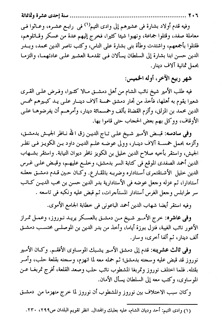 وَفِيه قدم أَوْلَاد بِشَارَة فِي عشيرهم إِلَى وَادي التيم فِي رَابِع عشره وعاثوا فِي مُعَاملَة صفد وَقتلُوا جمَاعَة ولهبوا شَيْئا كثيرا فَخرج إِلَيْهِم عدَّة من عَسْكَر وقاتلوهم فَقتلُوا بأجمعهم واشتدت وَطْأَة بني بِشَارَة على النَّاس وَكتب نَاصِر الدّين مُحَمَّد وَبدر الدّين حسن ابْنا بِشَارَة إِلَى السُّلْطَان يسألان فِي تقدمة العشير على عَادَتهمَا والتزما بِحمْل ثَمَانِيَة آلَاف دِينَار. شهر ربيع الآخر أَوله الْخَمِيس: فِيهِ طلب الْأَمِير شيخ نَائِب الشَّام من أهل دمشق مَالا كثيرا وَفرض على الْقرى شَعِيرًا يقوم بِهِ أَهلهَا فَأخذ من تجار دمشق خَمْسَة آلَاف دِينَار على يَد كَبِيرهمْ شمس الدّين مُحَمَّد بن المزلق وألزم الْقُضَاة بِأَلف وَخَمْسمِائة دِينَار وَأمرهمْ أَن يفرضوها على الْأَوْقَاف ووكل بهم بعض الْحجاب حَتَّى قَامُوا بهَا. وَفِي سادسه: قبض الْأَمِير شيخ على تَاج الدّين زق الله نَاظر الْجَيْش بِدِمَشْق وألزمه بِحمْل خَمْسَة آلَاف دِينَار وَولي عوضه علم الدّين دَاوُد بن الكويز فِي نظر الْجَيْش وَاسْتقر بأَخيه صَلَاح الدّين خَلِيل بن الكويز نَاظر ديوَان النِّيَابَة. وَاسْتقر بشهاب الدّين أَحْمد الصَّفَدِي الْموقع فِي كِتَابَة السِّرّ بِدِمَشْق وخلع عَلَيْهِم وَقبض على غرس الدّين خَلِيل الأشتقتمري أستاداره وضربه بالمقارع. وَكَانَ حِين قدم دمشق جعله أستاداراً ثمَّ عَزله وَجعل عوضه فِي الأستادارية بدر الدّين حسن بن محب الدّين كَاتب سر طرابلس وَجعل الْغَرْس أستادار المستأجرات ثمَّ قبض عَلَيْهِ ونكبه فِي تاسعه. وَفِيه اسْتَقر أَيْضا شهَاب الدّين أَحْمد الباعوني فِي خطابة الْجَامِع الْأمَوِي. وَفِي عاشره: خرج الْأَمِير شيخ من دمشق بالعسكر يُرِيد نوروز وَعمل تمراز الْأَعْوَر نَائِب الْغَيْبَة فَنزل ببرزة أَيَّامًا وَأخذ من بدر الدّين بن الْموصِلِي محتسب دمشق ألف دِينَار ثمَّ ألفا أُخْرَى وَسَار. وَفِي ثَالِث عشرينه: قدم إِلَى دمشق الْأَمِير يشبك الموساوي الأفقم. وَكَانَ الْأَمِير نوروز قد قبض عَلَيْهِ وسجنه بِدِمَشْق ثمَّ حمله مَعَه لما انهزم وسجنه بقلعة حلب وَأمر بقتْله. فَلَمَّا اخْتلف نوروز وتمربغا المشطوب نَائِب حلب وَصعد القلعة أفرج تمربغا عَن الموساوي وَكتب مَعَه إِلَى السُّلْطَان يسْأَل الْأمان. وَكَانَ سَبَب الِاخْتِلَاف بَين نوروز والمشطوب أَن نوروز لما خرج مُنْهَزِمًا من دمشق