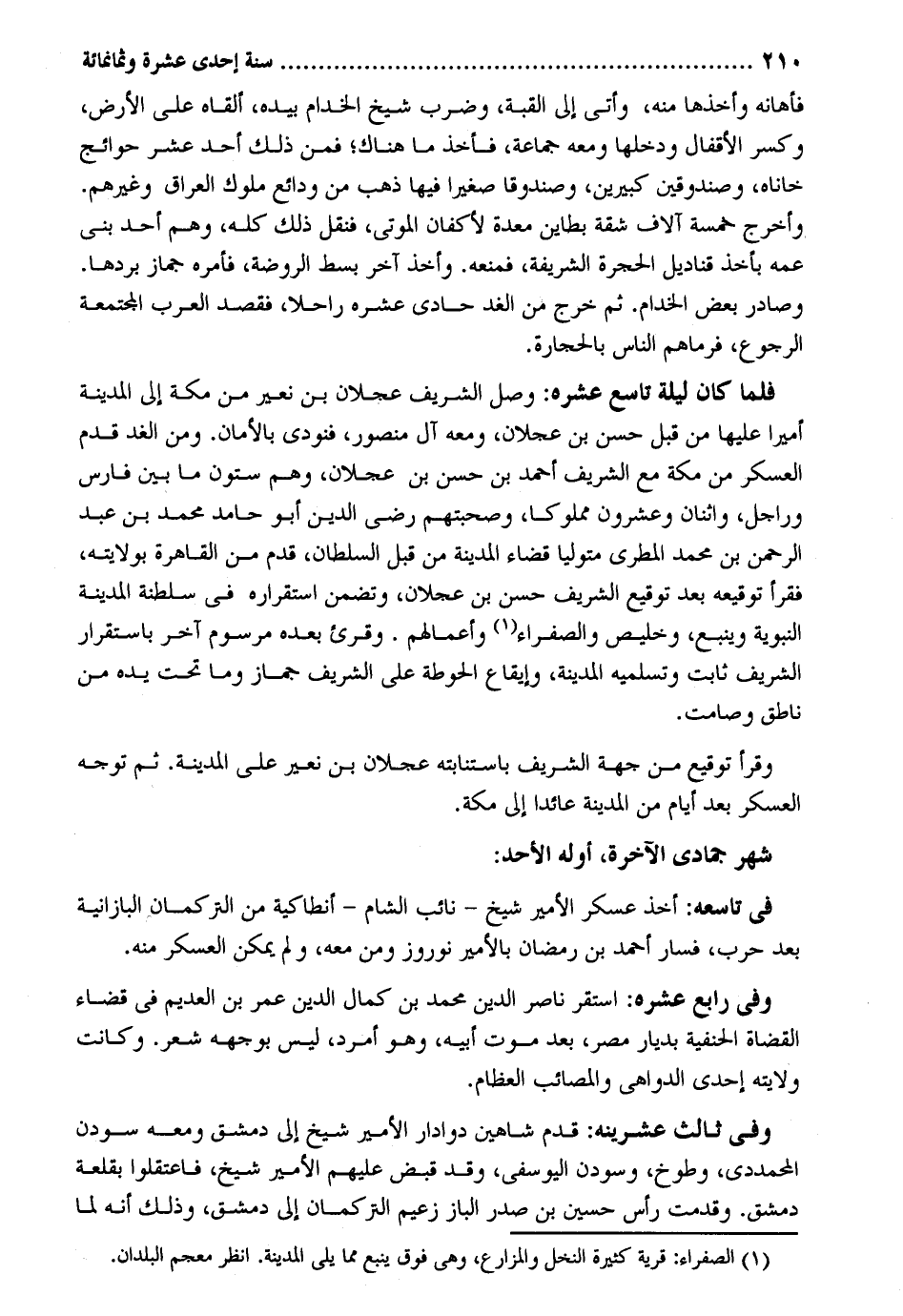 فأهانه وَأَخذهَا مِنْهُ وأتى إِلَى الْقبَّة وَضرب شيخ الخدام بِيَدِهِ أَلْقَاهُ على الأَرْض وَكسر الأقفال ودخلها وَمَعَهُ جمَاعَة فَأخذ مَا هُنَاكَ فَمن ذَلِك أحد عشر حوائج خاناه وصندوقين كبيرين وصندوقاً صَغِيرا فِيهَا ذهب من ودائع مُلُوك الْعرَاق وَغَيرهم. وَأخرج خَمْسَة آلَاف شقة بطاين معدة لأكفان الْمَوْتَى فَنقل ذَلِك كُله وهم أحد بني عَمه بِأخذ قناديل الْحُجْرَة الشَّرِيفَة فَمَنعه. وَأخذ آخر بسط الرَّوْضَة فَأمره جماز بردهَا. وصادر بعض الخدام. ثمَّ خرج من الْغَد حادي عشره راحلاً فقصد الْعَرَب المجتمعة الرُّجُوع فَرَمَاهُمْ النَّاس بِالْحِجَارَةِ. فَلَمَّا كَانَ لَيْلَة تَاسِع عشره: وصل الشريف عجلَان بن نعير من مَكَّة إِلَى الْمَدِينَة أَمِيرا عَلَيْهَا من قبل حسن بن عجلَان وَمَعَهُ آل مَنْصُور فَنُوديَ بالأمان. وَمن الْغَد قدم الْعَسْكَر من مَكَّة مَعَ الشريف أَحْمد بن حسن بن عجلَان وهم سِتُّونَ مَا بَين فَارس وراجل وَاثْنَانِ وَعِشْرُونَ مَمْلُوكا وصحبتهم رَضِي الدّين أَبُو حَامِد مُحَمَّد بن عبد الرَّحْمَن بن مُحَمَّد المطري مُتَوَلِّيًا قَضَاء الْمَدِينَة من قبل السُّلْطَان قدم من الْقَاهِرَة بولايته فَقَرَأَ توقيعه بعد توقيع الشريف حسن بن عجلَان وتضمن استقراره فِي سلطنة الْمَدِينَة النَّبَوِيَّة وينبع وخليص والصفراء وأعمالهم. وَقُرِئَ بعده مرسوم آخر باستقرار الشريف ثَابت وتسلميه الْمَدِينَة وإيقاع الحوطة على الشريف جَازَ وَمَا تَحت يَده من نَاطِق وصامت. وَقَرَأَ توقيع من جِهَة الشريف باستنابته عجلَان بن نعير على الْمَدِينَة. ثمَّ توجه الْعَسْكَر بعد أَيَّام من الْمَدِينَة عَائِدًا إِلَى مَكَّة. شهر جُمَادَى الْآخِرَة أَوله الْأَحَد: فِي تاسعه: أَخذ عَسْكَر الْأَمِير شيخ - نَائِب الشَّام - أنطاكية من التركمان البازانية بعد حَرْب فَسَار أَحْمد بن رَمَضَان بالأمير نوروز وَمن مَعَه وَلم يُمكن الْعَسْكَر مِنْهُ. وَفِي رَابِع عشره: اسْتَقر نَاصِر الدّين مُحَمَّد بن كَمَال الدّين عمر بن العديم فِي قَضَاء الْقُضَاة الْحَنَفِيَّة بديار مصر بعد موت أَبِيه وَهُوَ أَمْرَد لَيْسَ بِوَجْهِهِ شعر. وَكَانَت ولَايَته إِحْدَى الدَّوَاهِي والمصائب الْعِظَام. وَفِي ثَالِث عشرينه: قدم شاهين دوادار الْأَمِير شيخ إِلَى دمشق وَمَعَهُ سودن المحمدي وطوخ وسودن اليوسفي وَقد قبض عَلَيْهِم الْأَمِير شيخ فاعتقلوا بقلعة دمشق. وقدمت رَأس حُسَيْن بن صدر الباز زعيم التركمان إِلَى دمشق وَذَلِكَ أَنه لما