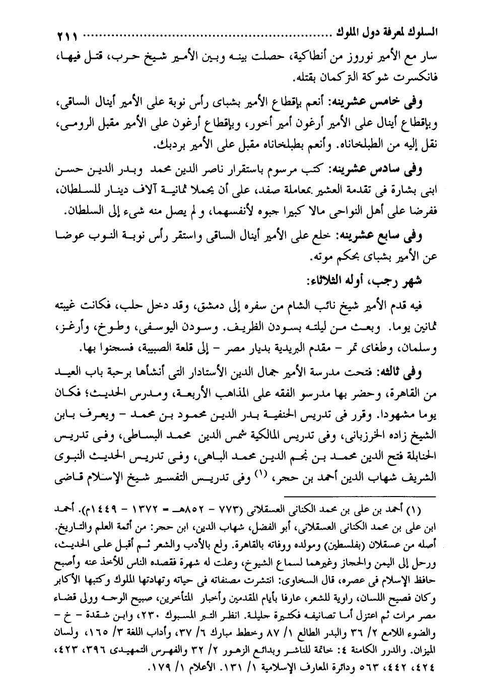 سَار مَعَ الْأَمِير نوروز من إنطاكية حصلت بَينه وَبَين الْأَمِير شيخ حَرْب قتل فِيهَا فَانْكَسَرت شَوْكَة التركمان بقتْله. وَفِي خَامِس عشرينه: أنعم بإقطاع الْأَمِير بشباي رَأس نوبَة على الْأَمِير أينال الساقي وبإقطاع أينال على الْأَمِير أرغون أَمِير أخور وبإقطاع أرغون على الْأَمِير مقبل الرُّومِي نقل إِلَيْهِ من الطبلخاناه. وأنعم بطبلخاناه مقبل على الْأَمِير بردبك. وَفِي سادس عشرينه: كتب مرسوم باستقرار نَاصِر الدّين مُحَمَّد وَبدر الدّين حسن ابْني بِشَارَة فِي تقدمة العشير بمعاملة صفد على أَن يحملا ثَمَانِيَة آلَاف دِينَار للسُّلْطَان ففرضا على أهل النواحي مَالا كَبِيرا جبوه لأنفسهما وَلم يصل مِنْهُ شَيْء إِلَى السُّلْطَان. وَفِي سَابِع عشرينه: خلع على الْأَمِير أينال الساقي وَاسْتقر رَأس نوبَة النوب عوضا عَن الْأَمِير بشباي بِحكم مَوته. شهر رَجَب أَوله الثُّلَاثَاء: فِيهِ قدم الْأَمِير شيخ نَائِب الشَّام من سَفَره إِلَى دمشق وَقد دخل حلب فَكَانَت غيبته ثَمَانِينَ يَوْمًا. وَبعث من ليلته بسودن الظريف. وسودن اليوسفي وطوخ وأرغز وسلمان وطغاي تمر وَفِي ثالثه: فتحت مدرسة الْأَمِير جمال الدّين الأستادار الَّتِي أَنْشَأَهَا برحبة بَاب الْعِيد من الْقَاهِرَة وَحضر بهَا مدرسو الْفِقْه على الْمذَاهب الْأَرْبَعَة ومدرس الحَدِيث فَكَانَ يَوْمًا مشهوداً. وَقرر فِي تدريس الْحَنَفِيَّة بدر الدّين مَحْمُود بن مُحَمَّد - وَيعرف بِابْن الشَّيْخ زَاده الخرزباني وَفِي تدريس الْمَالِكِيَّة شمس الدّين مُحَمَّد الْبِسَاطِيّ وَفِي تدريس الْحَنَابِلَة فتح الدّين مُحَمَّد بن نجم الدّين مُحَمَّد الباهي وَفِي تدريس الحَدِيث النَّبَوِيّ الشريف شهَاب الدّين أَحْمد بن حجر وَفِي تدريس التَّفْسِير شيخ الْإِسْلَام قَاضِي