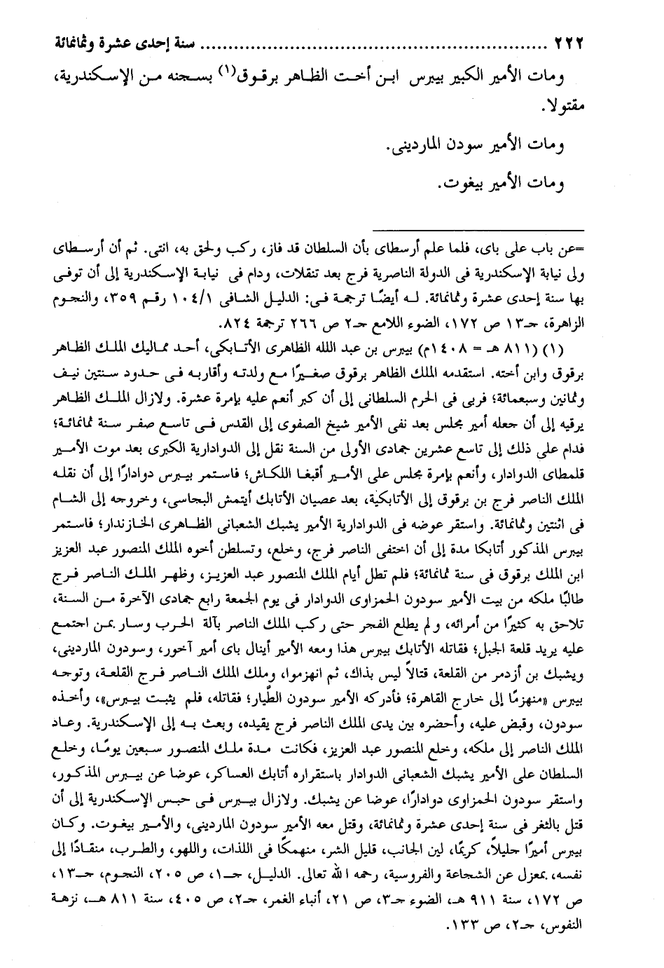 وَمَات الْأَمِير الْكَبِير بيبرس ابْن أُخْت الظَّاهِر برقوق بسجنه من الْإسْكَنْدَريَّة مقتولاً. وَمَات الْأَمِير سودن المارديني. وَمَات الْأَمِير بيغوت.