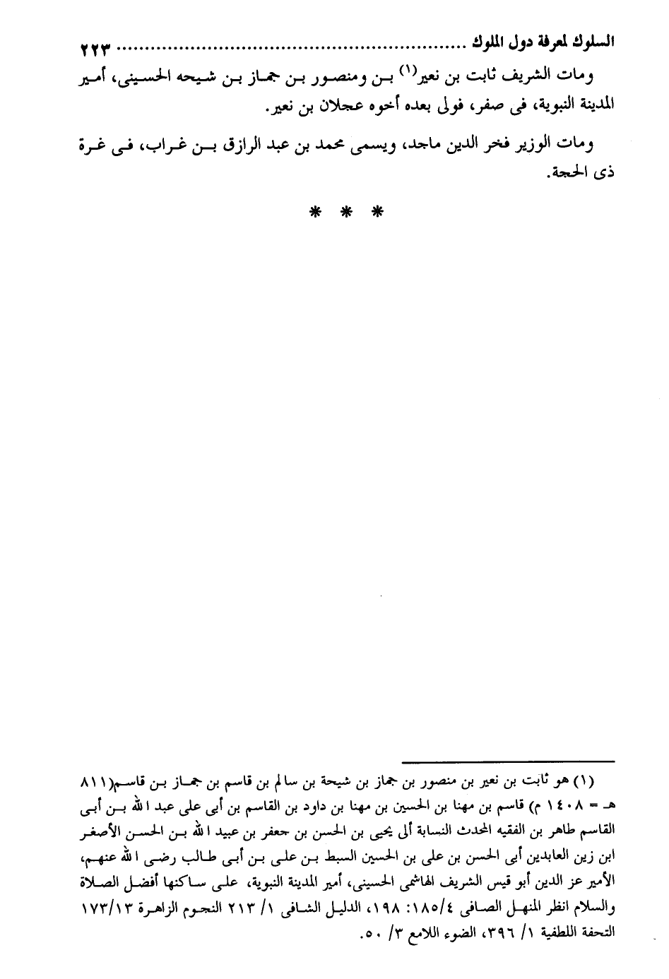 وَمَات الشريف ثَابت بن نعير بن وَمَنْصُور بن جماز بن شيحه الْحُسَيْنِي أَمِير الْمَدِينَة النَّبَوِيَّة فِي صفر فولي بعده أَخُوهُ عجلَان بن نعير. وَمَات الْوَزير فَخر الدّين ماجد وَيُسمى مُحَمَّد بن عبد الرازق بن غراب فِي غرَّة ذِي الْحجَّة.