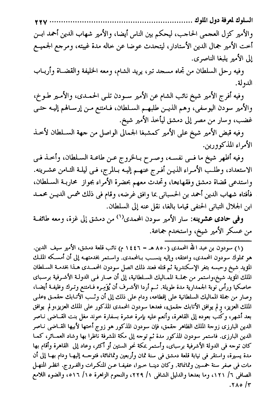 والأمير كزل العجمي الْحَاجِب ليحكم بَين النَّاس أَيْضا والأمير شهَاب الدّين أَحْمد ابْن أُخْت الْأَمِير جمال الدّين الأستادار ليتحدث عوضا عَن خَاله مُدَّة غيبته ومرجع الْجَمِيع إِلَى الْأَمِير يلبغا الناصري. وَفِيه رَحل السُّلْطَان من تجاه مَسْجِد تبر يُرِيد الشَّام وَمَعَهُ الْخَلِيفَة والقضاة وأرباب الدولة. وَفِيه أفرج الْأَمِير شيخ نَائِب الشَّام عَن الْأَمِير سودن تلِي الحمدي والأمير طوخ والأمير سودن اليوسفي وهم الَّذين طَلَبهمْ السُّلْطَان فَامْتنعَ من إرسالهم إِلَيْهِ حَتَّى غضب وَسَار من مصر إِلَى دمشق ليَأْخُذ الْأَمِير شيخ. وَفِيه قبض الْأَمِير شيخ على الْأَمِير كمشبغا الجمالي الْوَاصِل من جِهَة السُّلْطَان لأخذ الْأُمَرَاء الْمَذْكُورين. وَفِيه أظهر شيخ مَا فِي نَفسه وَصرح بِالْخرُوجِ عَن طَاعَة السُّلْطَان وَأخذ فِي الاستعداد وَطلب الْأُمَرَاء الَّذين أفرج عَنْهُم إِلَيْهِ بالمرج فِي لَيْلَة الثَّامِن عشرينه. واستدعى قُضَاة دمشق وفقهاءها وتحدث مَعَهم بِحَضْرَة الْأُمَرَاء بِجَوَاز محاربة السُّلْطَان فأفتاه شهَاب الدّين أَحْمد بن الحسباني بِمَا وَافق غَرَضه وَقَامَ فِي ذَلِك شمس الدّين مُحَمَّد ابْن الْجلَال التباني الْحَنَفِيّ قيَاما بَالغا نقل عَنهُ إِلَى السُّلْطَان. وَفِي حادي عشرينه: سَار الْأَمِير سودن المحمدي من دمشق إِلَى غَزَّة وَمَعَهُ طَائِفَة من عَسْكَر الْأَمِير شيخ واستخدم جمَاعَة.