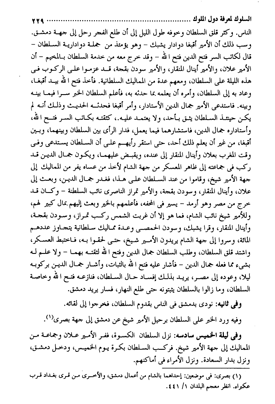 النَّاس. وَكثر قلق السُّلْطَان وخوفه طول اللَّيْل إِلَى أَن طلع الْفجْر رَحل إِلَى جِهَة دمشق. وَسبب ذَلِك أَن الْأَمِير أقبغا دوادار يشبك - وَهُوَ يَوْمئِذٍ من جملَة دوادارية السُّلْطَان - قَالَ لكاتب السِّرّ فتح الدّين فتح الله - وَقد خرج مَعَه من خدمَة السُّلْطَان بالمخيم - أَن الْأَمِير عَلان والأمير أينال المنقار والأمير سودن بقجة قد عزموا على الرّكُوب فِي هَذِه اللَّيْلَة على السُّلْطَان وَمَعَهُمْ عدَّة من المماليك السُّلْطَانِيَّة. فَأخذ فتح الله بيد أقبغا وَعَاد بِهِ إِلَى السُّلْطَان وَأمره أَن يُعلمهُ بِمَا حَدثهُ بِهِ فَاعْلَم السُّلْطَان الْخَبَر سرا فِيمَا بَينه وَبَينه. فاستدعي الْأَمِير جمال الدّين الأستادار وَأمر أقبغا فحدثه الحَدِيث وَذَلِكَ أَنه لم يكن حِينَئِذٍ السُّلْطَان يَثِق بِأحد وَلَا يعْتَمد عَلَيْهِ. كثقته بكاتب السِّرّ فتح الله وأستاداره جمال الدّين فاستشارهما فِيمَا يعْمل فدار الرَّأْي بَين السُّلْطَان وَبَينهمَا وَبَين أقبغا من غير أَن يعلم ذَلِك أحد حَتَّى اسْتَقر رَأْيهمْ على أَن السُّلْطَان يَسْتَدْعِي وَفِي وَقت الْمغرب بعلان وأينال المنقار إِلَى عِنْده وَيقبض عَلَيْهِمَا وَيكون جمال الدّين قد ركب فِي جماعته إِلَى ظَاهر الْعَسْكَر من جِهَة الشَّام لأخذ من عساه يفر من المماليك إِلَى جِهَة الْأَمِير شيخ وَقَامُوا من عِنْد السُّلْطَان على هَذَا فغدر جمال الدّين وَبعث إِلَى عَلان وأينال المنقار وسودن بمجة والأمير تمراز الناصري نَائِب السلطة - وَكَانَ قد خرج من مصر وَهُوَ أرمد - يسير فِي المحفه فأعلمهم بِالْخَيرِ وَبعث إِلَيْهِم بِمَال كَبِير لَهُم وللأمير شيخ نَائِب الشَّام فَمَا هُوَ إِلَّا أَن غربت الشَّمْس ركب تمراز وسودن بقجة وأينال المنقار وقرا يشبك وسودن الْحِمصِي وعدة مماليك سلطانية يتَجَاوَز عَددهمْ الْمِائَة وسروا إِلَى جِهَة الشَّام يُرِيدُونَ الْأَمِير شيخ حَتَّى لَحِقُوا بِهِ فاختبط الْعَسْكَر وَاشْتَدَّ قلق السُّلْطَان وَطلب السُّلْطَان جمال الدّين وَفتح الله لِثِقَتِهِ بهما - وَلَا علم لَهُ بِشَيْء مِمَّا فعله جمال الدّين - فَأَشَارَ عَلَيْهِ فتح الله بالثبات وَأَشَارَ جمال الدّين بركوبه لَيْلًا وَعوده إِلَى مصر يُرِيد بذلك إِفْسَاد حَال السُّلْطَان فنازعه فتح الله وخاصة السُّلْطَان وَمَا زَالُوا بالسلطان يثبتونه حَتَّى طلع النَّهَار فَسَار يُرِيد دمشق. وَفِي ثَانِيه: نُودي بِدِمَشْق فِي النَّاس بقدوم السُّلْطَان فَخَرجُوا إِلَى لِقَائِه. وَفِيه ورد الْخَبَر على السُّلْطَان برحيل الْأَمِير شيخ عَن دمشق إِلَى جِهَة بصرى. وَفِي لَيْلَة الْخَمِيس سادسه: نزل السُّلْطَان الْكسْوَة ففر الْأَمِير عَلان وَجَمَاعَة من المماليك إِلَى جِهَة الْأَمِير شيخ. فَركب السُّلْطَان بكرَة يَوْم الْخَمِيس وَدخل دمشق وَنزل بدار السَّعَادَة. وَنزل الْأُمَرَاء فِي أماكنهم.