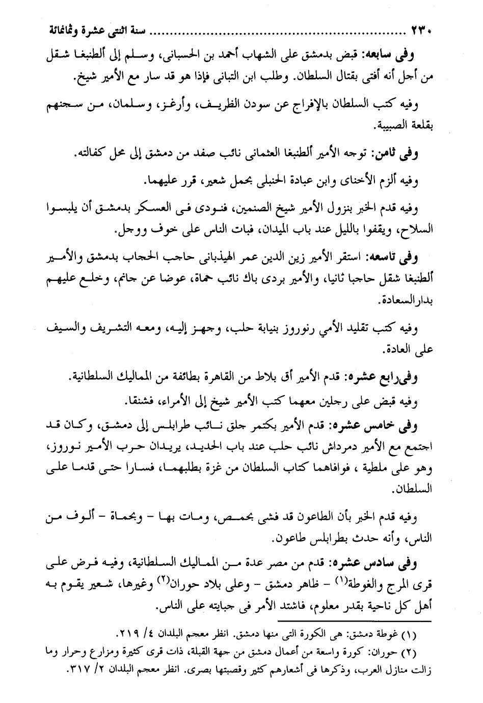 وَفِي سابعه: قبض بِدِمَشْق على الشهَاب أَحْمد بن الحسباني وَسلم إِلَى ألطنبغا شقل من أجل أَنه أُفْتِي بِقِتَال السُّلْطَان. وَطلب ابْن التباني فَإِذا هُوَ قد سَار مَعَ الْأَمِير شيخ. وَفِيه كتب السُّلْطَان بالإفراج عَن سودن الظريف وأرغز وسلمان من سجنهم بقلعة الصبيبة. وَفِي ثامن: توجه الْأَمِير ألطنبغا العثماني نَائِب صفد من دمشق إِلَى مَحل كفَالَته. وَفِيه ألزم الأخناي وَابْن عبَادَة الْحَنْبَلِيّ بِحمْل شعير قرر عَلَيْهِمَا. وَفِيه قدم الْخَبَر بنزول الْأَمِير شيخ الصنمين فَنُوديَ فِي الْعَسْكَر بِدِمَشْق أَن يلبسوا السِّلَاح ويقفوا بِاللَّيْلِ عِنْد بَاب الميدان فَبَاتَ النَّاس على خوف ووجل. وَفِي تاسعه: اسْتَقر الْأَمِير زين الدّين عمر الهيذباني حَاجِب الْحجاب بِدِمَشْق والأمير ألطنبغا شقل حاجباً ثَانِيًا والأمير بردي باك نَائِب حماة عوضا عَن جانم وخلع عَلَيْهِم بدار السَّعَادَة. وَفِيه كتب تَقْلِيد الْأُمِّي رنوروز بنيابة حلب وجهز إِلَيْهِ وَمَعَهُ التشريف وَالسيف على الْعَادة. وَفِي رَابِع عشره: قدم الْأَمِير أق بلاط من الْقَاهِرَة بطَائفَة من المماليك السُّلْطَانِيَّة. وَفِيه قبض على رجلَيْنِ مَعَهُمَا كتب الْأَمِير شيخ إِلَى الْأُمَرَاء فشنقا. وَفِي خَامِس عشرَة: قدم الْأَمِير بكتمر جلق نَائِب طرابلس إِلَى دمشق وَكَانَ قد اجْتمع مَعَ الْأَمِير دمرداش نَائِب حلب عِنْد بَاب الْحَدِيد يُريدَان حَرْب الْأَمِير نوروز وَهُوَ على ملطية فوافاهما كتاب السُّلْطَان من غَزَّة بطلبهما فسارا حَتَّى قدما على السُّلْطَان. وَفِيه قدم الْخَبَر بِأَن الطَّاعُون قد فَشَا بحمص وَمَات بهَا - وبحماة - أُلُوف من النَّاس وَأَنه حدث بطرابلس طاعون. وَفِي سادس عشره: قدم من مصر عدَّة من المماليك السُّلْطَانِيَّة وَفِيه فرض على قرى المرج والغوطة - ظَاهر دمشق - وعَلى بِلَاد حوران وَغَيرهَا شعير يقوم بِهِ أهل كل نَاحيَة بِقدر مَعْلُوم فَاشْتَدَّ الْأَمر فِي جبايته على النَّاس.