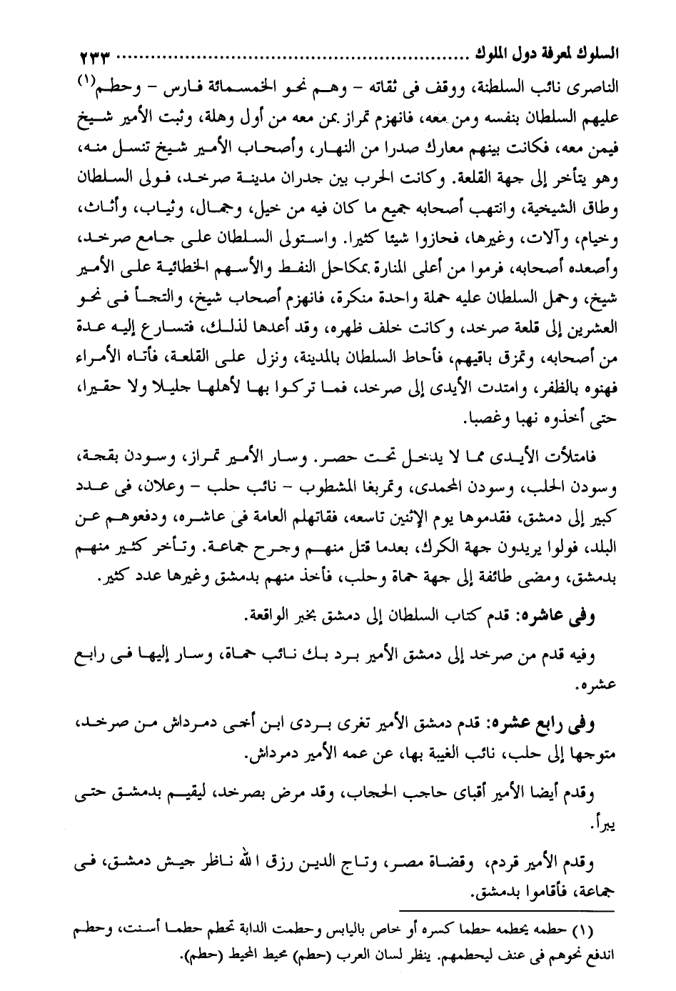 الناصري نَائِب السلطة ووقف فِي ثقاته - وهم نَحْو الْخَمْسمِائَةِ فَارس - وحطم عَلَيْهِم السُّلْطَان بِنَفسِهِ وَمن مَعَه فَانْهَزَمَ تمراز بِمن مَعَه من أول وهلة وَثَبت الْأَمِير شيخ فِيمَن مَعَه فَكَانَت بَينهم معارك صَدرا من النَّهَار وَأَصْحَاب الْأَمِير شيخ تنسل مِنْهُ وَهُوَ يتَأَخَّر إِلَى جِهَة القلعة. وَكَانَت الْحَرْب بَين جدران مَدِينَة صرخد فولى السُّلْطَان وطاق الشيخية وانتهب أَصْحَابه جَمِيع مَا كَانَ فِيهِ من خيل وجمال وَثيَاب وأثاث وخيام وآلات وَغَيرهَا فحازوا شَيْئا كثيرا. وَاسْتولى السُّلْطَان على جَامع صرخد وأصعده أَصْحَابه فرموا من أَعلَى المنارة بمكاحل النفط والأسهم الخطالية على الْأَمِير شيخ وَحمل السُّلْطَان عَلَيْهِ حَملَة وَاحِدَة مُنكرَة فَانْهَزَمَ أَصْحَاب شيخ والتجأ فِي نَحْو الْعشْرين إِلَى قلعة صرخد وَكَانَت خلف ظَهره وَقد أعدهَا لذَلِك فَتسَارع إِلَيْهِ عدَّة من أَصْحَابه وتمزق باقيهم فأحاط السُّلْطَان بِالْمَدِينَةِ وَنزل على القلعة فَأَتَاهُ الْأُمَرَاء فهنوه بالظفر وامتدت الْأَيْدِي إِلَى صرخد فَمَا تركُوا بهَا لأَهْلهَا جَلِيلًا وَلَا حَقِيرًا حَتَّى أَخَذُوهُ نهباً وغصباً. فامتلأت الْأَيْدِي مِمَّا لَا يدْخل تَحت حصر. وَسَار الْأَمِير تمراز وسودن بقجة وسودن الْحَلب وسودن المحمدي وتمربغا المشطوب - نَائِب حلب - وعلان فِي عدد كَبِير إِلَى دمشق فقدموها يَوْم الِاثْنَيْنِ تاسعه فَقَاتلهُمْ الْعَامَّة فِي عاشره ودفعوهم عَن الْبَلَد فَوَلوا يُرِيدُونَ جِهَة الكرك بَعْدَمَا قتل مِنْهُم وجرح جمَاعَة. وَتَأَخر كثير مِنْهُم بِدِمَشْق وَمضى طَائِفَة إِلَى جِهَة حماة وحلب فَأخذ مِنْهُم بِدِمَشْق وَغَيرهَا عدد كثير. وَفِي عاشره: قدم كتاب السُّلْطَان إِلَى دمشق بِخَبَر الْوَاقِعَة. وَفِيه قدم من صرخد إِلَى دمشق الْأَمِير برد بك نَائِب حماة وَسَار إِلَيْهَا فِي رَابِع عشره. وَفِي رَابِع عشره: قدم دمشق الْأَمِير تغري بردى ابْن أخي دمرداش من صرخد مُتَوَجها إِلَى حلب نَائِب الْغَيْبَة بهَا عَن عَمه الْأَمِير دمرداش. وَقدم أَيْضا الْأَمِير أقباي حَاجِب الْحجاب وَقد مرض بصرخد ليقيم بِدِمَشْق حَتَّى يبرأ. وَقدم الْأَمِير قردم وقضاة مصر وتاج الدّين رزق الله نَاظر جَيش دمشق فِي جمَاعَة فأقاموا بِدِمَشْق.