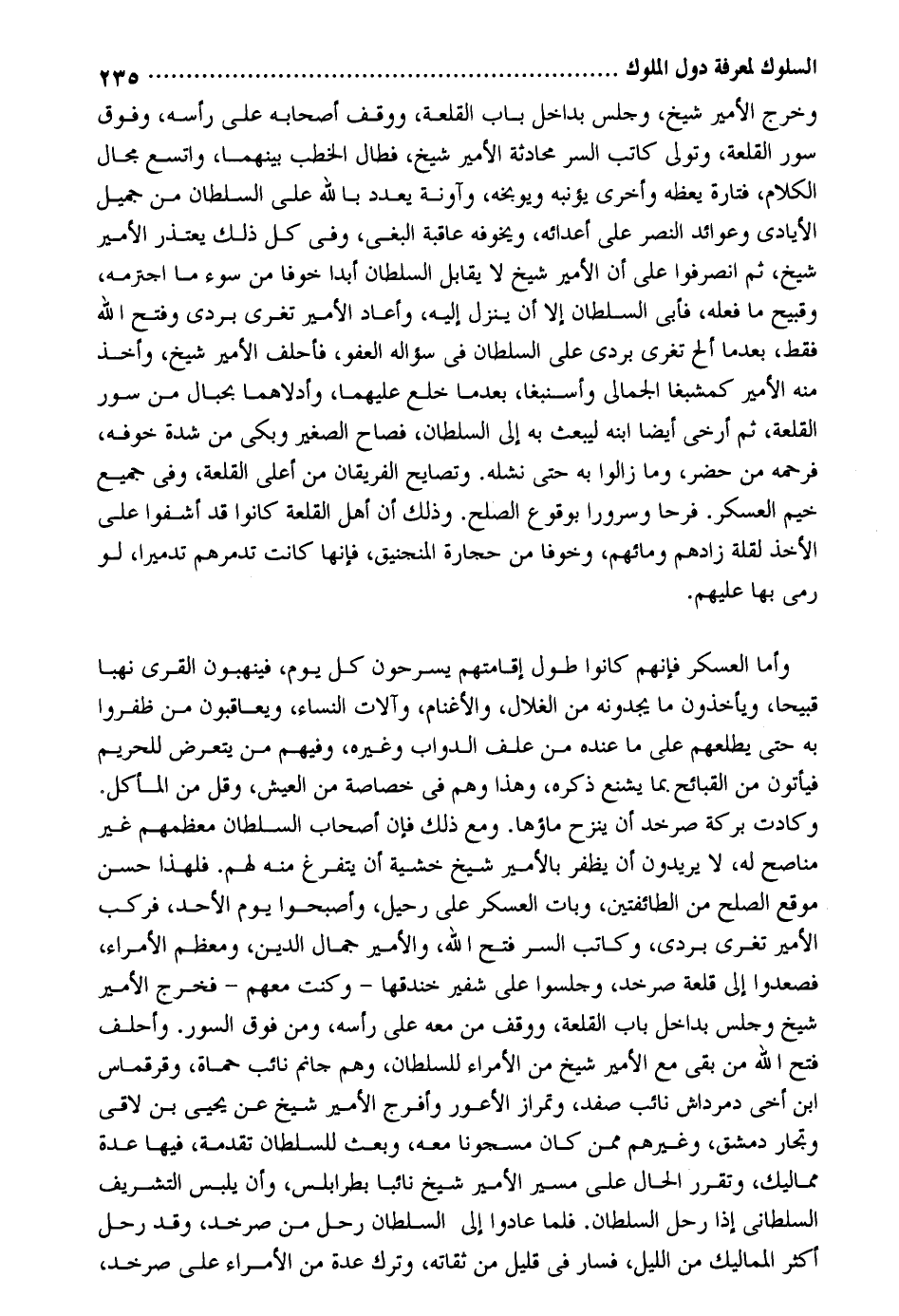 وَخرج الْأَمِير شيخ وَجلسَ بداخل بَاب القلعة ووقف أَصْحَابه على رَأسه وَفَوق سور القلعة وَتَوَلَّى كَاتب السِّرّ محادثة الْأَمِير شيخ فطال الْخطب بَينهمَا واتسع مجَال الْكَلَام فَتَارَة يعظه وَأُخْرَى يؤنبه ويوبخه وآونة يعدد بِاللَّه على السُّلْطَان من جميل الأيادي وعوائد النَّصْر على أعدائه ويخوفه عَاقِبَة الْبَغي وَفِي كل ذَلِك يعْتَذر الْأَمِير شيخ ثمَّ انصرفوا على أَن الْأَمِير شيح لَا يُقَابل السُّلْطَان أبدا خوفًا من سوء مَا اجترمه وقبيح مَا فعله فَأبى السُّلْطَان إِلَّا أَن ينزل إِلَيْهِ وَأعَاد الْأَمِير تغري بردى وَفتح الله فَقَط بَعْدَمَا ألح تغري بردى على السُّلْطَان فِي سُؤَاله الْعَفو فأحلف الْأَمِير شيخ وَأخذ مِنْهُ الْأَمِير كمشبغا الجمالي وأسنبغا بَعْدَمَا خلع عَلَيْهِمَا وأدلاهما بحبال من سور القلعة ثمَّ أرْخى أَيْضا ابْنه ليَبْعَث بِهِ إِلَى السُّلْطَان فصاح الصَّغِير وبكي من شدَّة خَوفه فرحمه من حضر وَمَا زَالُوا بِهِ حَتَّى نشله. وتصايح الْفَرِيقَانِ من أَعلَى القلعة وَفِي جَمِيع خيم الْعَسْكَر. فَرحا وسروراً بِوُقُوع الصُّلْح. وَذَلِكَ أَن أهل القلعة كَانُوا قد أشفوا على الْأَخْذ لقلَّة زادهم ومائهم وخوفاً من حِجَارَة المنجنيق فَإِنَّهَا كَانَت تدمرهم تدميراً لَو رمى بهَا عَلَيْهِم. وَأما الْعَسْكَر فَإِنَّهُم كَانُوا طول إقامتهم يسرحون كل يَوْم فينهبون الْقرى نهباً قبيحاً وَيَأْخُذُونَ مَا يجدونه من الغلال والأغنام وآلات النِّسَاء ويعاقبون من ظفروا بِهِ حَتَّى يطلعهم على مَا عِنْده من علف الدَّوَابّ وَغَيره وَفِيهِمْ من يتَعَرَّض للحريم فَيَأْتُونَ من القبائح بِمَا يشنع ذكره وَهَذَا وهم فِي خصَاصَة من الْعَيْش وَقل من المأكل. وكادت بركَة صرخد أَن ينْزح مَاؤُهَا. وَمَعَ ذَلِك فَإِن أَصْحَاب السُّلْطَان معظمهم غير مناصح لَهُ لَا يُرِيدُونَ أَن يظفر بالأمير شيخ خشيَة أَن يتفرغ مِنْهُ لَهُم. فَلهَذَا حسن موقع الصُّلْح من الطَّائِفَتَيْنِ وَبَات الْعَسْكَر على رحيل وَأَصْبحُوا يَوْم الْأَحَد فَركب الْأَمِير تغري بردى وَكَاتب السِّرّ فتح الله والأمير جمال الدّين ومعظم الْأُمَرَاء فَصَعِدُوا إِلَى قلعة صرخد وجلسوا على شَفير خندقها - وَكنت مَعَهم - فَخرج الْأَمِير شيخ وَجلسَ بداخل بَاب القلعة ووقف من مَعَه على رَأسه وَمن فَوق السُّور. وأحلف فتح الله من بَقِي مَعَ الْأَمِير شيخ من الْأُمَرَاء للسُّلْطَان وهم جانم نَائِب حماة وقرقماس ابْن أخي دمرداش نَائِب صفد وتمراز الْأَعْوَر وَأَفْرج الْأَمِير شيخ عَن يحيي بن لاقي وتجار دمشق وَغَيرهم مِمَّن كَانَ مسجوناً مَعَه وَبعث للسُّلْطَان تقدمة فِيهَا عدَّة مماليك وتقرر الْحَال على مسير الْأَمِير شيخ نَائِبا بطرابلس وَأَن يلبس التشريف السلطاني إِذا رَحل السُّلْطَان. فَلَمَّا عَادوا إِلَى السُّلْطَان رَحل من صرخد وَقد رَحل أَكثر المماليك من اللَّيْل فَسَار فِي قَلِيل من ثقاته وَترك عدَّة من الْأُمَرَاء على صرخد