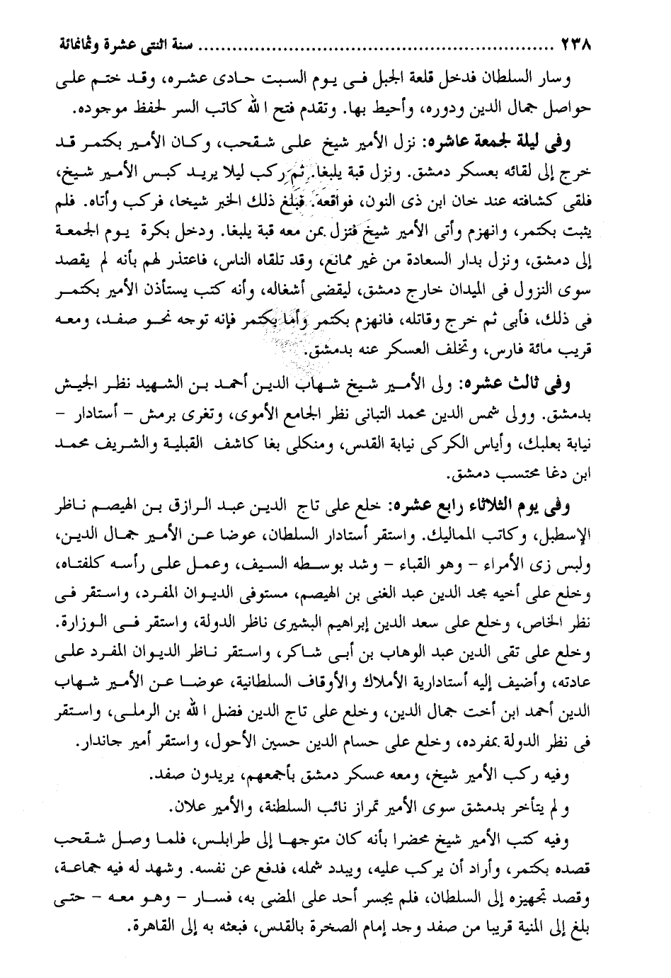 وَسَار السُّلْطَان فَدخل قلعة الْجَبَل فِي يَوْم السبت حادي عشره وَقد ختم على حواصل جمال الدّين ودوره وأحيط بهَا. وَتقدم فتح الله كَاتب السِّرّ لحفظ موجوده. وَفِي لَيْلَة الْجُمُعَة عاشره: نزل الْأَمِير شيخ على شقحب وَكَانَ الْأَمِير بكتمر قد خرج إِلَى لِقَائِه بعسكر دمشق. وَنزل قبَّة يلبغا. وَثمّ ركب لَيْلًا يُرِيد كبس الْأَمِير شيخ فلقي كشافته عِنْد خَان ابْن ذِي النُّون فواقعه فَبلغ ذَلِك الْخَبَر شَيخا فَركب وَأَتَاهُ. فَلم يثبت بكتمر وَانْهَزَمَ وأتى الْأَمِير شيخ فَنزل بِمن مَعَه قبَّة يلبغا. وَدخل بكرَة يَوْم الْجُمُعَة إِلَى دمشق وَنزل بدار السَّعَادَة من غير ممانع وَقد تَلقاهُ النَّاس فَاعْتَذر لَهُم بِأَنَّهُ لم يقْصد سوي النُّزُول فِي الميدان خَارج دمشق ليقضي أشغاله وَأَنه كتب يسْتَأْذن الْأَمِير بكتمر فِي ذَلِك فَأبى ثمَّ خرج وقاتله فَانْهَزَمَ بكتمر وَأما بكتمر فَإِنَّهُ توجه نَحْو صفد وَمَعَهُ قريب مائَة فَارس وتخلف الْعَسْكَر عَنهُ بِدِمَشْق. وَفِي ثَالِث عشره: ولى الْأَمِير شيخ شهَاب الدّين أَحْمد بن الشَّهِيد نظر الْجَيْش بِدِمَشْق. وَولى شمس الدّين مُحَمَّد التباني نظر الْجَامِع الْأمَوِي وتغري برمش - استادار - نِيَابَة بعلبك وأياس الكركي نِيَابَة الْقُدس ومنكلي بغا كاشف الْقبلية والشريف مُحَمَّد ابْن دغا محتسب دمشق. وَإِلَى يَوْم الثُّلَاثَاء رَابِع عشره: خلع عَليّ تَاج الدّين عبد الرازق بن الهيصم نَاظر الإسطبل وَكَاتب المماليك. وَاسْتقر استادار السُّلْطَان عوضا عَن الْأَمِير جمال الدّين وَلبس زِيّ الْأُمَرَاء - وَهُوَ القباء - وَشد بوسطه السَّيْف وَعمل على رَأسه كلفتاه وخلع على أَخِيه مجد الدّين عبد الْغَنِيّ بن الهيصم مُسْتَوْفِي الدِّيوَان الْمُفْرد وَاسْتقر فِي نظر الْخَاص وخلع على سعد الدّين إِبْرَاهِيم البشيري نَاظر الدولة وَاسْتقر فِي الوزارة. وخلع عَليّ تَقِيّ الدّين عبد الْوَهَّاب بن أبي شَاكر وَاسْتقر نَاظر الدِّيوَان الْمُفْرد على عَادَته وأضيف إِلَيْهِ أستادارية الْأَمْلَاك والأوقاف السُّلْطَانِيَّة عوضا عَن الْأَمِير شهَاب الدّين أَحْمد ابْن أُخْت جمال الدّين وخلع على تَاج الدّين فضل الله بن الرَّمْلِيّ وَاسْتقر فِي نظر الدولة بمفرده وخلع على حسام الدّين حُسَيْن الْأَحول وَاسْتقر أَمِير جاندار. وَفِيه ركب الْأَمِير شيخ وَمَعَهُ عَسْكَر دمشق بأجمعهم يُرِيدُونَ صفد. وَلم يتَأَخَّر بِدِمَشْق سوى الْأَمِير تمراز نَائِب السلطنة والأمير عَلان. وَفِيه كتب الْأَمِير شيخ محضراً بِأَنَّهُ كَانَ مُتَوَجها إِلَى طرابلس فَلَمَّا وصل شقحب قَصده بكتمر وَأَرَادَ أَن يركب عَلَيْهِ ويبدد شَمله فَدفع عَن نَفسه. وَشهد لَهُ فِيهِ جمَاعَة وَقصد تَجْهِيزه إِلَى السُّلْطَان فَلم يَجْسُر أحد على الْمُضِيّ بِهِ فَسَار - وَهُوَ مَعَه - حَتَّى بلغ إِلَى الْمنية قَرِيبا من صفد وجد إِمَام الصَّخْرَة بالقدس فَبَعثه بِهِ إِلَى الْقَاهِرَة.