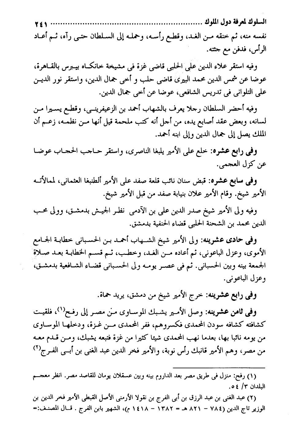 نَفسه مِنْهُ ثمَّ خنقه من الْغَد وَقطع رَأسه وَحمله إِلَى السُّلْطَان حَتَّى رَآهُ ثمَّ أعَاد الرَّأْس فَدفن مَعَ جثته. وَفِيه اسْتَقر عَلَاء الدّين عَليّ الْحلَبِي قَاضِي غَزَّة فِي مشيخة خانكاه بيبرس بِالْقَاهِرَةِ عوضا عَن شمس الدّين مُحَمَّد البيري قَاضِي حلب وَأخي جمال الدّين وَاسْتقر نور الدّين على التلواني فِي تدريس الشَّافِعِي عوضا عَن أخي جمال الدّين. وَفِيه أحضر السُّلْطَان رجلا يعرف بالشهاب أَحْمد بن الزعيفريني وَقطع يَسِيرا من لِسَانه وَبَعض عقد أَصَابِع يَده من أجل أَنه كتب ملحمة قيل أَنَّهَا من نظمه زعم أَن الْملك يصل إِلَى جمال وَفِي رَابِع عشره: خلع على الْأَمِير يلبغا الناصري وَاسْتقر حَاجِب الْحجاب عوضا عَن كزل العجمي. وَفِي سَابِع عشره: قبض سِنَان نَائِب قلعة صفد على الْأَمِير ألطنبغا العثماني لممالأته الْأَمِير شيخ. وَقَامَ الْأَمِير عَلان بنيابة صفد من قبل الْأَمِير شيخ. وَفِيه ولى الْأَمِير شيخ صدر الدّين عَليّ بن الْآدَمِيّ نظر الْجَيْش بِدِمَشْق وَولي محب الدّين مُحَمَّد بن الشّحْنَة الْحلَبِي قَضَاء الْحَنَفِيَّة بِدِمَشْق. وَفِي حادي عشرينه: ولي الْأَمِير شيخ الشهَاب أَحْمد بن الحسباني خطابة الْجَامِع الْأمَوِي وعزل الباعوني ثمَّ أَعَادَهُ من الْغَد وخطب ثمَّ قسم الخطابة بعد صَلَاة الْجُمُعَة بَينه وَبَين الحسباني. ثمَّ فِي عصر يَوْمه ولي الحسباني قَضَاء الشَّافِعِيَّة بِدِمَشْق وعزل الباعوني. وَفِي رَابِع عشرينه: خرج الْأَمِير شيخ من دمشق يُرِيد حماة. وَفِي ثامن عشرينه: وصل الْأَمِير يشبك الموساوي من مصر إِلَى رفح فَلَقِيت كشافته كشافه سودن المحمدي فكسروهم ففر المحمدي من غَزَّة ودخلها الموساوي من يَوْمه نَائِبا بهَا بَعْدَمَا نهب المحمدي شَيْئا كثيرا من غَزَّة فَتَبِعَهُ يشبك وَمن قدم مَعَه من مصر وهم الْأَمِير قانبك رَأس نوبَة والأمير فَخر الدّين عبد الْغَنِيّ بن أبي الْفرج