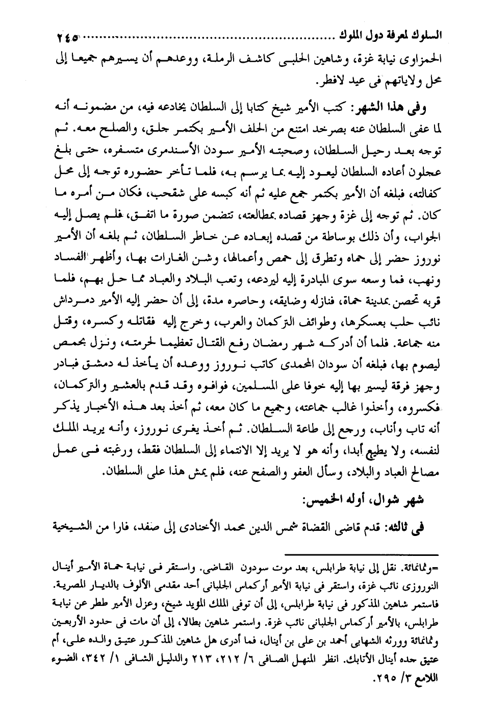 الحمزاوي نِيَابَة غَزَّة وشاهين الْحلَبِي كاشف الرملة، وَوَعدهمْ أَن يَسِيرُوا جَمِيعًا إِلَى مَحل ولاياتهم فِي عيد الْفطر. وَفِي هَذَا الشَّهْر: كتب الْأَمِير شيخ كتابا إِلَى السُّلْطَان يخادعه فِيهِ من مضمونه أَنه لما عُفيَ السُّلْطَان عَنهُ بصرخد امْتنع من الْحلف الْأَمِير بكتمر جلق وَالصُّلْح مَعَه. ثمَّ توجه بعد رحيل السُّلْطَان وصحبته الْأَمِير سودن الأسندمري متسفره حَتَّى بلغ عجلون أَعَادَهُ السُّلْطَان ليعود إِلَيْهِ بِمَا يرسم بِهِ فَلَمَّا تَأَخّر حُضُوره توجه إِلَى مَحل كفَالَته فَبَلغهُ أَن الْأَمِير بكتمر جمع عَلَيْهِ ثمَّ أَنه كبسه على شقحب فَكَانَ من أمره مَا كَانَ. ثمَّ توجه إِلَى عزة وجهز قصاده بمطالعته تَتَضَمَّن صُورَة مَا اتّفق فَلم يصل إِلَيْهِ الْجَواب وَأَن ذَلِك بوساطة من قَصده إبعاده عَن خاطر السُّلْطَان ثمَّ بلغه أَن الْأَمِير نوروز حضر إِلَى حماه وتطرق إِلَى حمص وأعمالها وَشن الغارات بهَا وَأظْهر الْفساد وَنهب فَمَا وَسعه سوى الْمُبَادرَة إِلَيْهِ ليردعه وتعب الْبِلَاد والعباد مِمَّا حل بهم فَلَمَّا قربه تحصن بِمَدِينَة حماة فنازله وضايقه وحاصره مُدَّة إِلَى أَن حضر إِلَيْهِ الْأَمِير دمرداش نَائِب حلب بعسكرها وَطَوَائِف التركمان وَالْعرب وَخرج إِلَيْهِ فقاتله وكسره وَقتل مِنْهُ جمَاعَة. فَلَمَّا أَن أدْركهُ شهر رَمَضَان رفع الْقِتَال تَعْظِيمًا لِحُرْمَتِهِ وَنزل بحمص ليصوم بهَا فَبَلغهُ أَن سودان المحمدي كَاتب نوروز ووعده أَن يَأْخُذ لَهُ دمشق فبادر وجهز فرقة ليسير بهَا إِلَيْهِ خوفًا على الْمُسلمين فوافوه وَقد قدم بالعشير والتركمان فكسروه وَأخذُوا غَالب جماعته وَجَمِيع مَا كَانَ مَعَه ثمَّ أَخذ بعد هَذِه الْأَخْبَار يذكر أَنه تَابَ وأناب وَرجع إِلَى طَاعَة السُّلْطَان. ثمَّ أَخذ يغري نوروز وَأَنه يُرِيد الْملك لنَفسِهِ وَلَا يُطِيع أبدا وَأَنه هُوَ لَا يُرِيد إِلَّا الانتماء إِلَى السُّلْطَان فَقَط ورغبته فِي عمل مصَالح الْعباد والبلاد وَسَأَلَ الْعَفو والصفح عَنهُ فَلم يمش هَذَا على السُّلْطَان. شهر شَوَّال أَوله الْخَمِيس: فِي ثالثه: قدم قَاضِي الْقُضَاة شمس الدّين مُحَمَّد الأخنادي إِلَى صفد فَارًّا من الشيخية