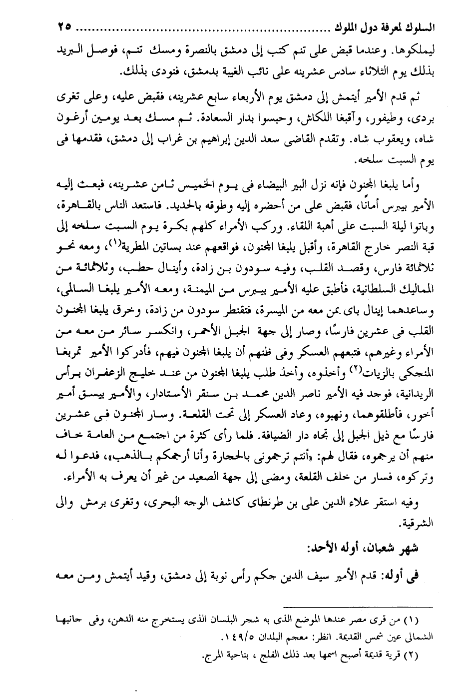 ليملكوها. وعندما قبض على تنم كتب إِلَى دمشق بالنصرة ومسك تنم فوصل الْبَرِيد بذلك يَوْم الثُّلَاثَاء سادس عشرينه على نَائِب الْغَيْبَة بِدِمَشْق فَنُوديَ بذلك. ثمَّ قدم الْأَمِير أيتمش إِلَى دمشق يَوْم الْأَرْبَعَاء سَابِع عشرينه فَقبض عَلَيْهِ وعَلى تعري بردى وطيفور وأقبعا اللكاش وحبسوا بدار السَّعَادَة. ثمَّ مسك بعد يَوْمَيْنِ أرغون شاه وَيَعْقُوب شاه. وَتقدم القَاضِي سعد الدّين إِبْرَاهِيم بن غراب إِلَى دمشق فَقَدمهَا فِي يَوْم السبت سلخه. وَأما يلبغا الْمَجْنُون فَإِنَّهُ نزل البير الْبَيْضَاء فِي يَوْم الْخَمِيس ثامن عشرينه فَبعث إِلَيْهِ الْأَمِير بيبرس أَمَانًا فَقبض على من أحضرهُ إِلَيْهِ وطوقه بالحديد. فاستعد النَّاس بِالْقَاهِرَةِ وَبَاتُوا لَيْلَة السبت على أهبة اللِّقَاء. وَركب الْأُمَرَاء كلهم بكرَة يَوْم السبت سلخه إِلَى قبَّة النَّصْر خَارج الْقَاهِرَة وَأَقْبل يلبغا الْمَجْنُون فواقعهم عِنْد بساتين المطرية وَمَعَهُ نَحْو ثَلَاثمِائَة فَارس وَقصد الْقلب وَفِيه سودون بن زادة وأينال حطب وثلاثمائة من المماليك السُّلْطَانِيَّة فأطبق عَلَيْهِ الْأَمِير بيبرس من الميمنة وَمَعَهُ الْأَمِير يلبغا السالمي وساعدهما إينال باي. مِمَّن مَعَه من الميسرة فتقنطر سودون من زادة وخرق يلبعا المحنون الْقلب فِي عشْرين فَارِسًا وَصَارَ إِلَى جِهَة الْجَبَل الْأَحْمَر وانكسر سَائِر من مَعَه من الْأُمَرَاء وَغَيرهم فَتَبِعهُمْ الْعَسْكَر وَفِي ظنهم أَن يلبغا الْمَجْنُون فيهم فأدركوا الْأَمِير تمربغا المنجكي بالزيات وأخذوه وَأخذ طلب يلبغا الْمَجْنُون من عِنْد خليج الزَّعْفَرَان بِرَأْس الريدانية فَوجدَ فِيهِ الْأَمِير نَاصِر الدّين مُحَمَّد بن سنقر الأستادار والأمير بيسق أَمِير أخور فأطلقوهما ونهبوه وَعَاد الْعَسْكَر إِلَى تَحت القلعة. وَسَار الْمَجْنُون فِي عشْرين فَارِسًا مَعَ ذيل الْجَبَل إِلَى تجاه دَار الضِّيَافَة. فَلَمَّا رأى كَثْرَة من اجْتمع من الْعَامَّة خَافَ مِنْهُم أَن يرجموه فَقَالَ لَهُم: أَنْتُم ترجوني بِالْحِجَارَةِ وَأَنا أرجمكم بِالذَّهَب فدعوا لَهُ وتركوه فَسَار من خلف القلعة وَمضى إِلَى جِهَة الصَّعِيد من غير أَن يعرف بِهِ الْأُمَرَاء. وَفِيه اسْتَقر عَلَاء الدّين عَليّ بن طرنطاي كاشف الْوَجْه البحري وتغري برمش وَالِي الشرقية. شهر شعْبَان أَوله الْأَحَد: فِي أَوله: قدم الْأَمِير سيف الدّين جكم رَأس نوبَة إِلَى دمشق وَقيد أيتمش وَمن مَعَه