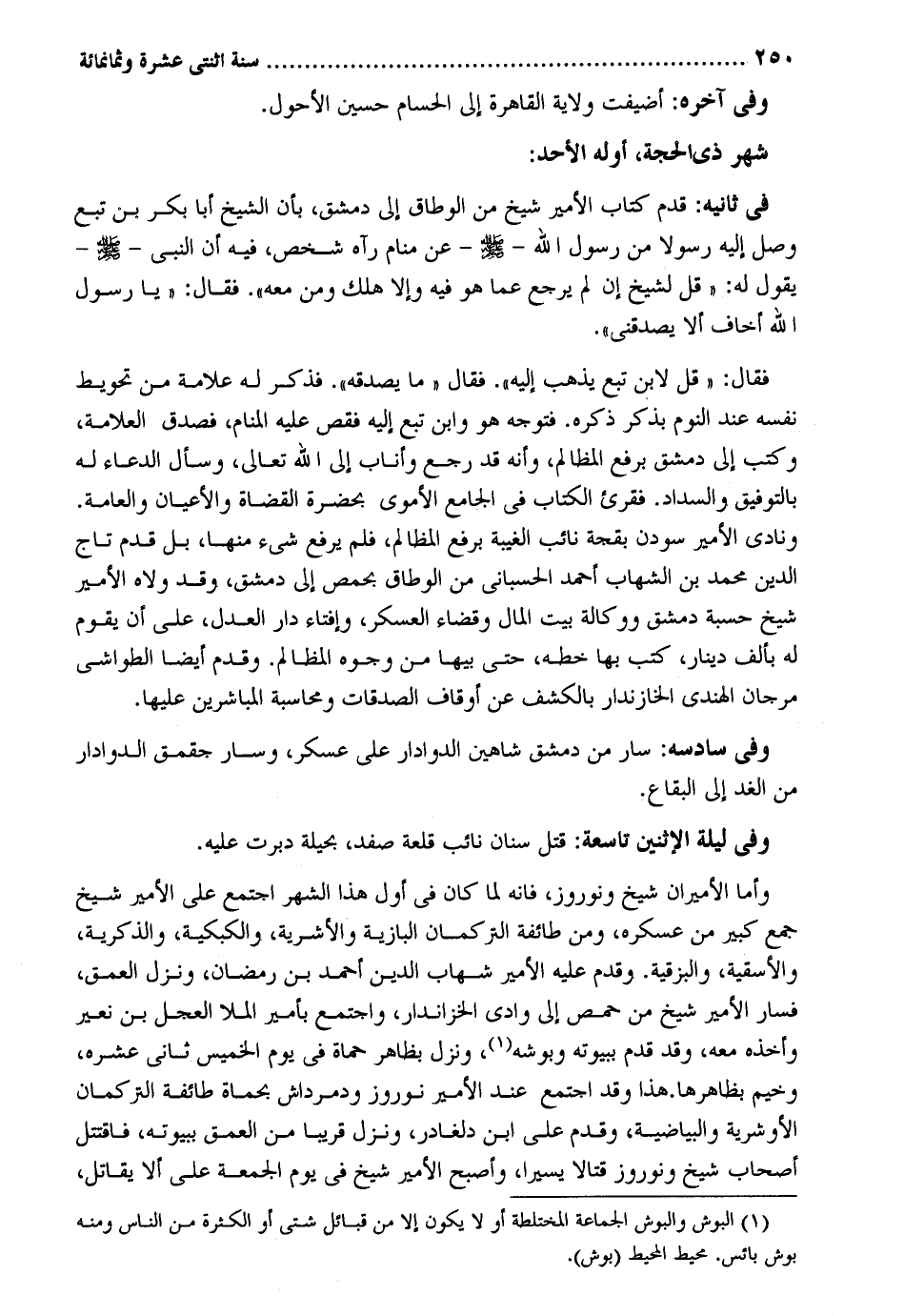 وَفِي آخِره: أضيفت ولَايَة الْقَاهِرَة إِلَى الحسام حُسَيْن الْأَحول. شهر ذِي الْحجَّة أَوله الْأَحَد: فِي ثَانِيه: قدم كتاب الْأَمِير شيخ من الوطاق إِلَى دمشق بِأَن الشَّيْخ أَبَا بكر بن تبع وصل إِلَيْهِ رَسُولا من رَسُول الله - صلى الله عَلَيْهِ وَسلم - عَن مَنَام رَآهُ شخص فِيهِ أَن النَّبِي - صلى الله عَلَيْهِ وَسلم - يَقُول لَهُ: قل لشيخ أَن لم يرجع عَمَّا هُوَ فِيهِ وَإِلَّا هلك وَمن مَعَه. فَقَالَ: يَا رَسُول الله أَخَاف أَلا يصدقني. فَقَالَ: قل لِابْنِ تبع يذهب إِلَيْهِ. فَقَالَ: مَا يصدقهُ. فَذكر لَهُ عَلامَة من تحويط نَفسه عِنْد النّوم بِذكر ذكره. مُتَوَجّه هُوَ وَابْن تبع إِلَيْهِ فَقص عَلَيْهِ الْمَنَام مُصدق الْعَلامَة وَكتب إِلَى دمشق بِرَفْع الْمَظَالِم وَأَنه قد رَجَعَ وأناب إِلَى الله تَعَالَى وَسَأَلَ الدُّعَاء لَهُ بالتوفيق والسداد. فقرئ الْكتاب فِي الْجَامِع الْأمَوِي بِحَضْرَة الْقُضَاة والأعيان والعامة. ونادى الْأَمِير سودن بقجة نَائِب الْغَيْبَة بِرَفْع الْمَظَالِم فَلم يرفع شَيْء مِنْهَا بل قدم تَاج الدّين مُحَمَّد بن الشهَاب أَحْمد الحسباني من الوطاق بحمص إِلَى دمشق وَقد ولاه الْأَمِير شيح حسبَة دمشق ووكالة بَيت المَال وَقَضَاء الْعَسْكَر وإفتاء دَار الْعدْل على أَن يقوم لَهُ بِأَلف دِينَار كتب بهَا خطه حَتَّى بيها من وُجُوه الْمَظَالِم. وَقدم أَيْضا الطواشي مرجان الْهِنْدِيّ الخازندار بالكشف عَن أَوْقَات الصَّدقَات ومحاسبة المباشرين عَلَيْهَا. وَفِي سادسه: سَار من دمشق شاهين الدوادار على عَسْكَر وَسَار جقمق الدوادار من الْغَد إِلَى الْبِقَاع. وَفِي ليله الِاثْنَيْنِ تاسعه: قتل سِنَان نَائِب قلعة صفد بحيلة دبرت عَلَيْهِ. وَأما الأميران شيخ ونوروز فَإِنَّهُ لما كَانَ فِي أول هَذَا الشَّهْر اجْتمع على الْأَمِير شيخ جمع كَبِير من عسكره وَمن طَائِفَة التركمان البازية والأشرية والكبكية والذكرية والأسقية والبزقية. وَقدم عَلَيْهِ الْأَمِير شهَاب الدّين أَحْمد بن رَمَضَان وَنزل العمق فَسَار الْأَمِير شيخ من حمص إِلَى وَادي الخزاندار وَاجْتمعَ بأمير الملا الْعجل بن نعير وَأَخذه مَعَه وَقد قدم ببيوته وبوشه وَنزل بِظَاهِر حماة فِي يَوْم الْخَمِيس ثَانِي عشره وخيم بظاهرها. هَذَا وَقد اجْتمع عِنْد الْأَمِير نوروز ودمرداش بحماة طَائِفَة التركمان الأوشرية والبياضية وَقدم على ابْن دلغادر وَنزل قَرِيبا من العمق ببيوته فاقتتل أَصْحَاب شيخ ونوروز قتالاً يَسِيرا وَأصْبح الْأَمِير شيخ فِي يَوْم الْجُمُعَة على أَلا يُقَاتل