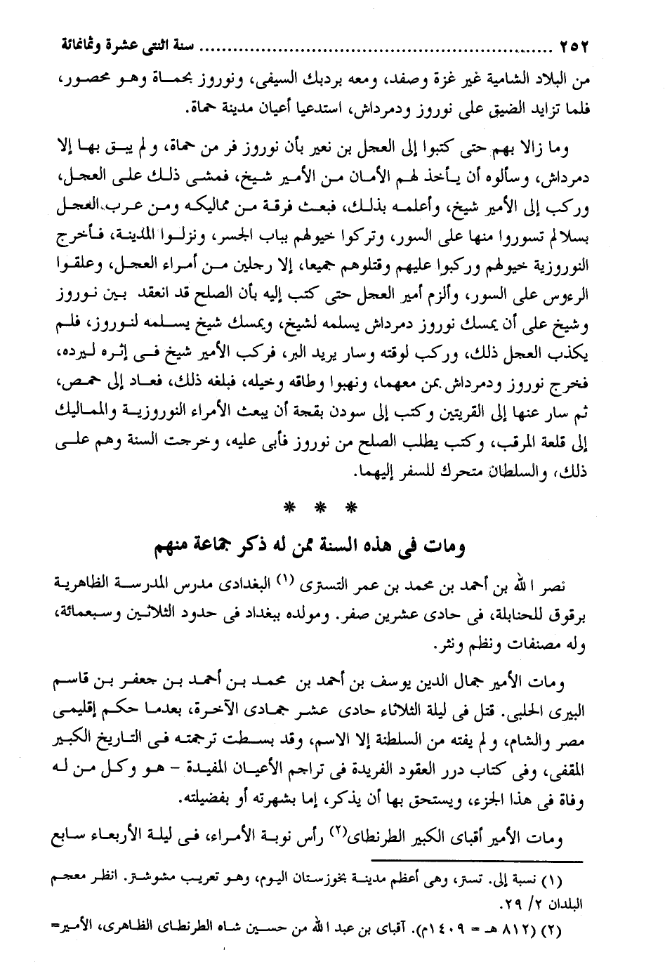 من الْبِلَاد الشامية غير غَزَّة وصفد وَمَعَهُ بردبك السيفي ونوروز بحماة وَهُوَ مَحْصُور فَلَمَّا تزايد الضّيق على نوروز ودمرداش استدعيا أَعْيَان مَدِينَة حماة. وَمَا زَالا بهم حَتَّى كتبُوا إِلَى الْعجل بن نعير بِأَن نوروز فر من حماة وَلم يبْق بهَا إِلَّا دمرداش وسألوه أَن يَأْخُذ لَهُم الْأمان من الْأَمِير شيخ فَمشى ذَلِك على الْعجل وَركب إِلَى الْأَمِير شيخ وأعلمه بذلك فَبعث فرقة من مماليكه وَمن عرب الْعجل بسلالم تسوروا مِنْهَا على السُّور وَتركُوا خيولهم بِبَاب الجسر ونزلوا الْمَدِينَة فَأخْرج النوروزية خيولهم وركبوا عَلَيْهِم وقتلوهم جَمِيعًا إِلَّا رجلَيْنِ من أُمَرَاء الْعجل وعلقوا الرُّءُوس على السُّور وألزم أَمِير الْعجل حَتَّى كتب إِلَيْهِ بِأَن الصُّلْح قد انْعَقَد بَين نوروز وَشَيخ على أَن يمسك نوروز دمرداش يُسلمهُ لشيخ ويمسك شيخ يُسلمهُ لنوروز فَلم يكذب الْعجل ذَلِك وَركب لوقته وَسَار يُرِيد الْبر فَركب الْأَمِير شيخ فِي إثره ليَرُدهُ فَخرج نوروز ودمرداش بِمن مَعَهُمَا ونهبوا وطاقه وخيله فَبَلغهُ ذَلِك فَعَاد إِلَى حمص ثمَّ سَار عَنْهَا إِلَى القريتين وَكتب إِلَى سودن بقجة أَن يبْعَث الْأُمَرَاء النوروزية والمماليك إِلَى قلعة المرقب وَكتب يطْلب الصُّلْح من نوروز فَأبى عَلَيْهِ وَخرجت السّنة وهم على ذَلِك وَالسُّلْطَان متحرك للسَّفر إِلَيْهِمَا. وَمَات فِي هَذِه السّنة مِمَّن لَهُ ذكر جمَاعَة مِنْهُم نصر الله بن أَحْمد بن مُحَمَّد بن عمر التسترِي الْبَغْدَادِيّ مدرس الْمدرسَة الظَّاهِرِيَّة برقوق للحنابلة فِي حادي عشْرين صفر. ومولده بِبَغْدَاد فِي حُدُود الثَّلَاثِينَ وَسَبْعمائة وَله مصنفات ونظم ونثر. وَمَات الْأَمِير جمال الدّين يُوسُف بن أَحْمد بن مُحَمَّد بن أَحْمد بن جَعْفَر بن قَاسم البيري الْحلَبِي. قتل فِي لَيْلَة الثُّلَاثَاء حادي عشر جُمَادَى الْآخِرَة بَعْدَمَا حكم إقليمي مصر وَالشَّام وَلم يفته من السلطة إِلَّا الِاسْم وَقد بسطت تَرْجَمته فِي التَّارِيخ الْكَبِير المقفي وَفِي كتاب دُرَر الْعُقُود الفريدة فِي تراجم الْأَعْيَان المفيدة هُوَ وكل من لَهُ وَفَاة فِي هَذَا الْجُزْء وَيسْتَحق بهَا أَن يذكر إِمَّا بشهرته أَو بفضيلته. وَمَات الْأَمِير أقباي الْكَبِير الطرنطاي رَأس نوبَة الْأُمَرَاء فِي لَيْلَة الْأَرْبَعَاء سَابِع