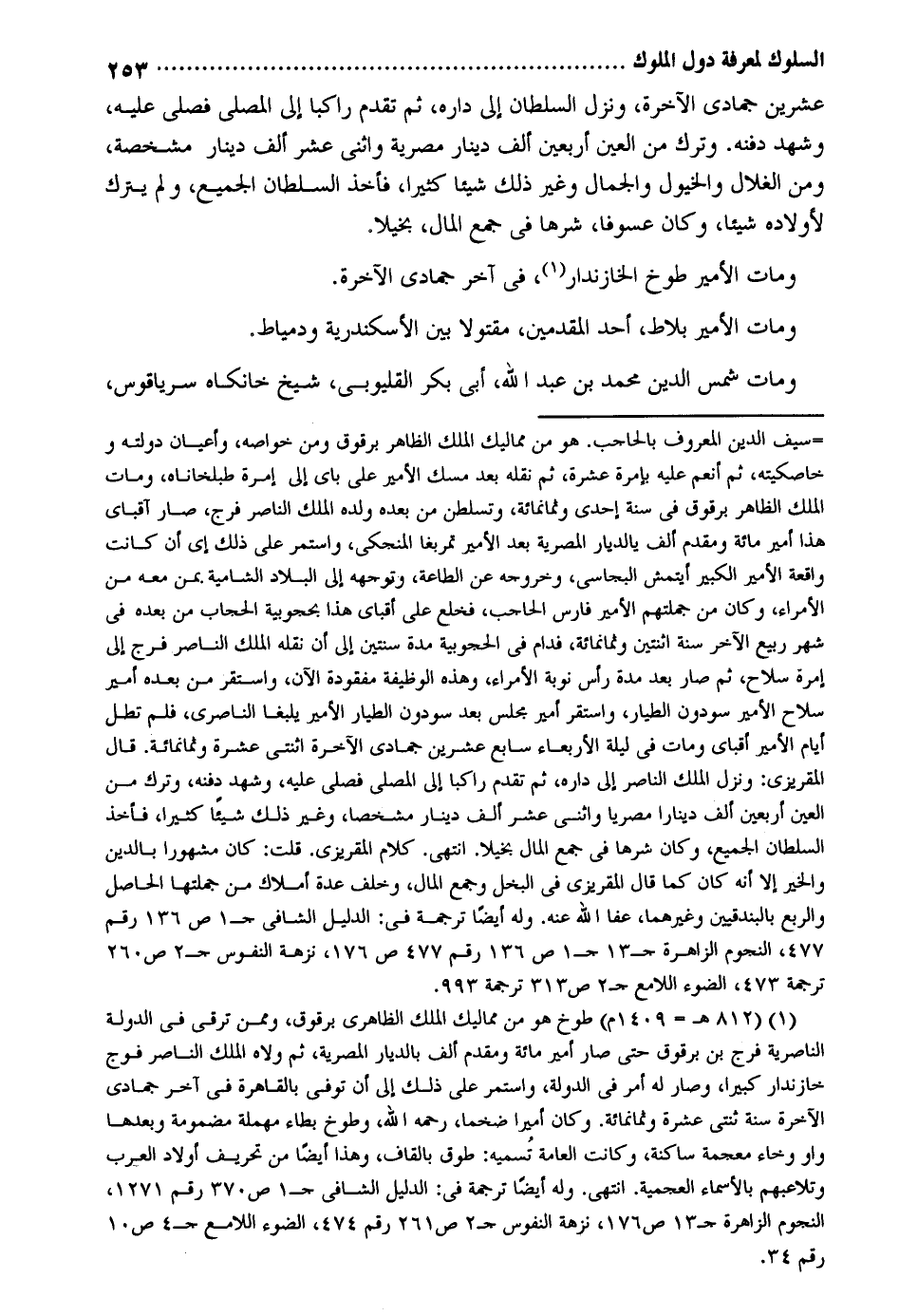 عشْرين جُمَادَى الْآخِرَة وَنزل السُّلْطَان إِلَى دَاره ثمَّ تقدم رَاكِبًا إِلَى الْمصلى فصلى عَلَيْهِ وَشهد دَفنه. وَترك من الْعين أَرْبَعِينَ ألف دِينَار مصرية واثني عشر ألف دِينَار مشخصة وَمن الغلال والخيول وَالْجمال وَغير ذَلِك شَيْئا كثيرا فَأخذ السُّلْطَان الْجَمِيع وَلم يتْرك لأولاده شَيْئا وَكَانَ عسوفاً شَرها فِي جمع المَال بَخِيلًا. وَمَات الْأَمِير طوخ الخازندار فِي آخر جُمَادَى الْآخِرَة. وَمَات الْأَمِير بلاط أحد المقدمين مقتولاً بَين الْإسْكَنْدَريَّة ودمياط. وَمَات شمس الدّين مُحَمَّد بن عبد الله أبي بكر القليوبي شيخ خانكاه سرياقوس