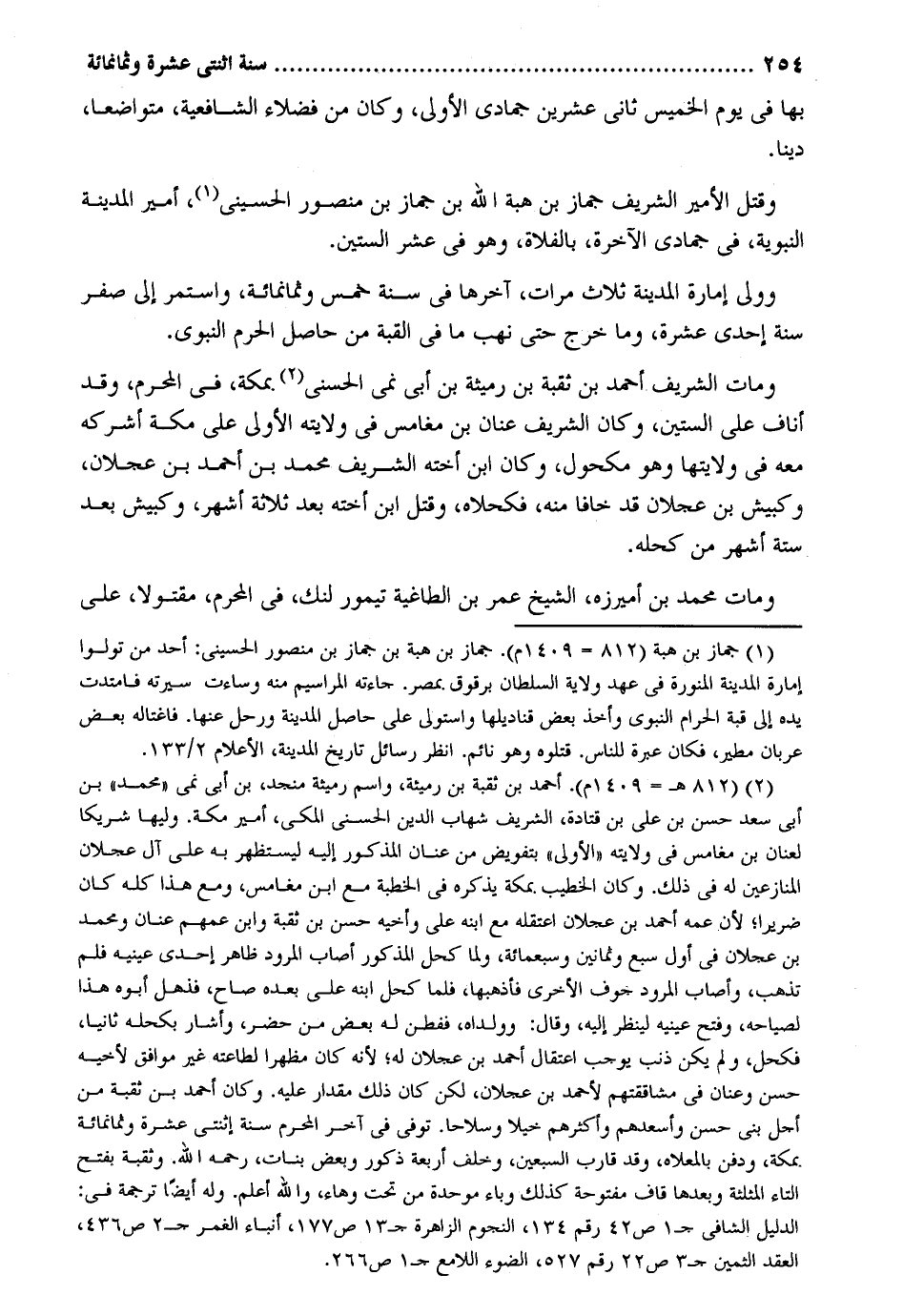 بهَا فِي يَوْم الْخَمِيس ثَانِي عشْرين جُمَادَى الأولى وَكَانَ من فضلاء الشَّافِعِيَّة متواضعاً دينا. وَقتل الْأَمِير الشريف جماز بن هبة الله بن جَازَ بن مَنْصُور الْحُسَيْنِي أَمِير الْمَدِينَة النَّبَوِيَّة فِي جُمَادَى الْآخِرَة بالفلاة وَهُوَ فِي عشر السِّتين. وَولي إِمَارَة الْمَدِينَة ثَلَاث مَرَّات آخرهَا فِي سنة خمس وَثَمَانمِائَة وَاسْتمرّ إِلَى صفر سنة إِحْدَى عشرَة وَمَا خرج حَتَّى نهب مَا فِي الْقبَّة من حَاصِل الْحرم النَّبَوِيّ. وَمَات الشريف أَحْمد بن ثقبة بن رميثة بن أبي نمى الحسني بِمَكَّة فِي الْمحرم وَقد أناف على السِّتين وَكَانَ الشريف عنان بن مغامس فِي ولَايَته الأولى على مَكَّة أشركه مَعَه فِي ولايتها وَهُوَ مَكْحُول وَكَانَ ابْن أُخْته الشريف مُحَمَّد بن أَحْمد بن عجلَان وكبيش بن عجلَان قد خافا مِنْهُ فكحلاه وَقتل ابْن أُخْته بعد ثَلَاثَة أشهر وكبيش بعد سِتَّة أشهر من كحله. وَمَات مُحَمَّد بن أميرزه الشَّيْخ عمر بن الطاغية تيمورلنك فِي الْمحرم مقتولاً على
