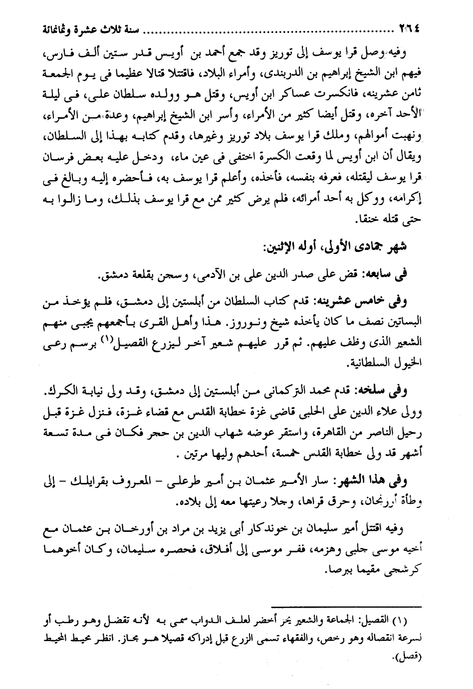 وَفِيه وصل قوا يُوسُف إِلَى توريز وَقد جمع أَحْمد بن أويس قدر سِتِّينَ ألف فَارس فيهم ابْن الشَّيْخ إِبْرَاهِيم بن الدربندي وأمراء الْبِلَاد فاقتتلا قتالاً عَظِيما فِي يَوْم الْجُمُعَة ثامن عشرينه فَانْكَسَرت عَسَاكِر ابْن أويس وَقتل هُوَ وَولده سُلْطَان عَليّ فِي لَيْلَة الْأَحَد آخِره وَقتل أَيْضا كثير من الْأُمَرَاء وَأسر ابْن الشَّيْخ إِبْرَاهِيم وعدة من الْأُمَرَاء ونهبت أَمْوَالهم وَملك قرا يُوسُف بِلَاد توريز وَغَيرهَا وَقدم كِتَابه بِهَذَا إِلَى السُّلْطَان وَيُقَال أَن ابْن أويس لما وَقعت الكسرة اختفى فِي عين مَاء وَدخل عَلَيْهِ بعض فرسَان قرا يُوسُف ليَقْتُلهُ فَعرفهُ بِنَفسِهِ فَأَخذه وَأعلم قرا يُوسُف بِهِ فَأحْضرهُ إِلَيْهِ وَبَالغ فِي إكرامه ووكل بِهِ أحد أمرائه فَلم يرض كثير مِمَّن مَعَ قرا يُوسُف بذلك وَمَا زَالُوا بِهِ حَتَّى قَتله خنقاً. شهر جُمَادَى الأولى أَوله الِاثْنَيْنِ: فِي سابعه: قض على صدر الدّين عَليّ بن الْآدَمِيّ وسجن بقلعة دمشق. وَفِي خَامِس عشرينه: قدم كتاب السُّلْطَان من أبلستين إِلَى دمشق فَلم يُؤْخَذ من الْبَسَاتِين نصف مَا كَانَ يَأْخُذهُ شيخ ونوروز. هَذَا وَأهل الْقرى بأجمعهم يجبى مِنْهُم الشّعير الَّذِي وظف عَلَيْهِم. ثمَّ قرر عَلَيْهِم شعير آخر ليزرع القصيل برسم رعي الْخُيُول السُّلْطَانِيَّة. وَفِي سلخه: قدم مُحَمَّد التركماني من أبلستين إِلَى دمشق وَقد ولي نِيَابَة الكرك. وَولي عَلَاء الدّين عَليّ الْحلَبِي قَاضِي غَزَّة خطابة الْقُدس مَعَ قَضَاء غَزَّة فَنزل غَزَّة قبل رحيل النَّاصِر من الْقَاهِرَة وَاسْتقر عوضه شهَاب الدّين بن حجر فَكَانَ فِي مُدَّة تِسْعَة أشهر قد ولي خطابة الْقُدس خَمْسَة أحدهم وَليهَا مرَّتَيْنِ. وَفِي هَذَا الشَّهْر: سَار الْأَمِير عُثْمَان بن أَمِير طرعلي - الْمَعْرُوف بقرايلك - إِلَى طأة أرزنجان وَفِيه اقتتل أَمِير سُلَيْمَان بن خوندكار أبي يزِيد بن مواد بن أورخان بن عُثْمَان مَعَ أَخِيه مُوسَى جلبي وهزمه ففر مُوسَى إِلَى أفلاق فحصره سُلَيْمَان وَكَانَ أخوهما كرشجي مُقيما ببرصا.