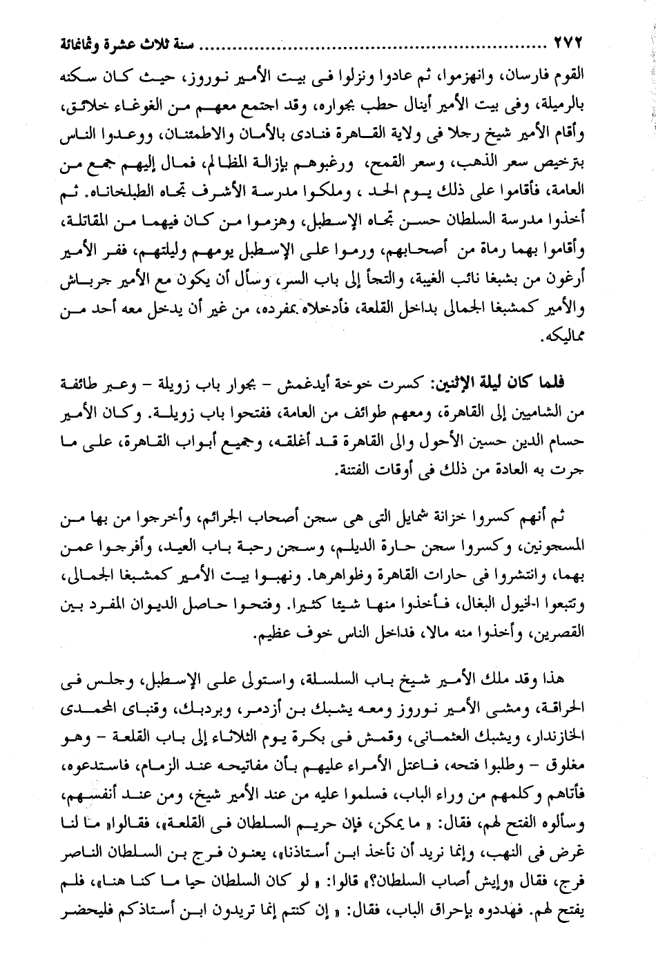 الْقَوْم فارسان وانهزموا ثمَّ عَادوا ونزلوا فِي بَيت الْأَمِير نوروز حَيْثُ كَانَ سكنه بالرميلة وَفِي بَيت الْأَمِير أينال حطب بجواره وَقد اجْتمع مَعَهم من الغوغاء خلائق وَأقَام الْأَمِير شيخ رجلا فِي ولَايَة الْقَاهِرَة فنادي بالأمان والاطمئنان ووعدوا النَّاس بترخيص سعر الذَّهَب وسعر الْقَمْح ورغبوهم بِإِزَالَة الْمَظَالِم فَمَال إِلَيْهِم جمع من الْعَامَّة فأقاموا على ذَلِك يَوْم الْحَد وملكوا مدرسة الْأَشْرَف تجاه الطبلخاناه. ثمَّ أخذُوا مدرسة السُّلْطَان حسن تجاه الإسطبل وهزموا من كَانَ فيهمَا من الْمُقَاتلَة وَأَقَامُوا بهما رُمَاة من أَصْحَابهم ورموا على الإسطبل يومهم وليلتهم ففر الْأَمِير أرغون من بشبغا نَائِب الْغَيْبَة والتجأ إِلَى بَاب السِّرّ وَسَأَلَ أَن يكون مَعَ الْأَمِير جرباش والأمير كمشبغا الجمالي بداخل القلعة فأدخلاه بمفرده من غير أَن يدْخل مَعَه أحد من مماليكه. فَلَمَّا كَانَ لَيْلَة الِاثْنَيْنِ: كسوت خوخة أيدغمش - بجوار بَاب زويلة - وَعبر طَائِفَة من الشاميين إِلَى الْقَاهِرَة وَمَعَهُمْ طوائف من الْعَامَّة ففتحوا بَاب زويلة. وَكَانَ الْأَمِير حسام الدّين حُسَيْن الْأَحول وَالِي الْقَاهِرَة قد أغلقه وَجَمِيع أَبْوَاب الْقَاهِرَة على مَا جرت بِهِ الْعَادة من ذَلِك فِي أَوْقَات الْفِتْنَة. ثمَّ أَنهم كسروا خزانَة شمايل الَّتِي هِيَ سجن أَصْحَاب الجرائم وأخرجوا من بهَا من المسجونين وكسروا سجن حارة الديلم وسجن رحبة بَاب الْعِيد وأفرجوا عَمَّن بهما وانتشروا فِي حارات الْقَاهِرَة وظواهرها. ونهبوا بَيت الْأَمِير كمشبغا الجمالي وتتبعوا الْخُيُول البغال فَأخذُوا مِنْهَا شَيْئا كثيرا. وفتحوا حَاصِل الدِّيوَان الْمُفْرد بَين القصرين وَأخذُوا مِنْهُ مَالا فداخل النَّاس خوف عَظِيم. هَذَا وَقد ملك الْأَمِير شيخ بَاب السلسلة وَاسْتولى على الإسطبل وَجلسَ فِي الحراقة وَمَشى الْأَمِير نوروز وَمَعَهُ يشبك بن أزدمر وبردبك وقنباي المحمدي الخازندار ويشبك العثماني وقمش فِي بكرَة يَوْم الثُّلَاثَاء إِلَى بَاب القلعة - وَهُوَ مغلوق - وطلبوا فَتحه فاعتل الْأُمَرَاء عَلَيْهِم بِأَن مفاتيحه عِنْد الزِّمَام فاستدعوه فَأَتَاهُم وكلمهم من وَرَاء الْبَاب فَسَلمُوا عَلَيْهِ من عِنْد الْأَمِير شيخ وَمن عِنْد أنفسهم وسألوه الْفَتْح لَهُم فَقَالَ: مَا يُمكن فَإِن حَرِيم السُّلْطَان فِي القلعة فَقَالُوا مَا لنا غَرَض فِي النهب وَإِنَّمَا نُرِيد أَن نَأْخُذ ابْن أستاذنا يعنون فرج بن السُّلْطَان النَّاصِر فرج فَقَالَ وإيش أصَاب السُّلْطَان قَالُوا: لَو كَانَ السُّلْطَان حَيا مَا كُنَّا هُنَا فَلم يفتح لَهُم. فهددوه بإحراق الْبَاب فَقَالَ: إِن كُنْتُم إِنَّمَا تُرِيدُونَ ابْن أستاذكم فليحضر
