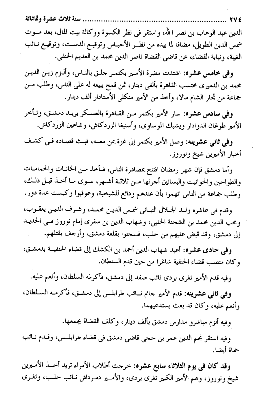 الدّين عبد الْوَهَّاب بن نصر الله وَاسْتقر فِي نظر الْكسْوَة ووكالة بَيت المَال بعد موت شمس الدّين الطَّوِيل مُضَافا لما بِيَدِهِ من نظر الأحباس وتوقيع الدست وتوقيع نَائِب الْغَيْبَة ونيابة الْقَضَاء عَن قَاضِي الْقُضَاة نَاصِر الدّين مُحَمَّد بن العديم الْحَنَفِيّ. وَفِي خَامِس عشره: اشتدت مضرَّة الْأَمِير بكتمر جلق بِالنَّاسِ وألزم زين الدّين مُحَمَّد بن الدَّمِيرِيّ محتسب الْقَاهِرَة بألفي دِينَار ثمن قَمح يَبِيعهُ لَهُ على النَّاس وَطلب من جمَاعَة من تجار الشَّام مَالا وَأخذ من الْأَمِير منكلي الأستادار ألف دِينَار. وَفِي سادس عشره: سَار الْأَمِير بكتمر من الْقَاهِرَة بالعسكر يُرِيد دمشق وَتَأَخر الْأَمِير طوغان الدوادار ويشبك الموساوي وأسنبغا الزردكاش وشاهين الزردكاش. وَفِي ثَانِي عشرينه: وصل الْأَمِير بكتمر إِلَى غَزَّة بِمن مَعَه فَبَثَّ قصاده فِي كشف أَخْبَار الأميرين شيخ ونوروز. وَأما دمشق فَإِن شهر رَمَضَان افْتتح بمصادرة النَّاس فَأخذ من الْخَانَات والحمامات والطواحين والحوانيت والبساتين أجرتهَا من ثَلَاثَة أشهر سوى مَا أَخذ قبل ذَلِك وَطلب جمَاعَة من النَّاس اتهموا بِأَن عِنْدهم ودائع للشيخية وعوقبوا وكبست عدَّة دور. وَقدم فِي عاشره ولد الْجلَال التباني شمس الدّين مُحَمَّد وَشرف الدّين يَعْقُوب ومحب الدّين مُحَمَّد بن الشّحْنَة الْحلَبِي وشهاب الدّين بن سَفَرِي إِمَام نوروز فِي الْحَدِيد إِلَى دمشق وَقد قبض عَلَيْهِم من حلب فسجنوا بقلعة دمشق وأرجف بِقَتْلِهِم. وَفِي حادي عشره: أُعِيد شهَاب الدّين أَحْمد بن الكشك إِلَى قَضَاء الْحَنَفِيَّة بِدِمَشْق وَكَانَ منصب قَضَاء الْحَنَفِيَّة شاغراً من حِين قدم السُّلْطَان. وَفِيه قدم الْأَمِير تغري بردى نَائِب صفد إِلَى دمشق فَأكْرمه السُّلْطَان وأنعم عَلَيْهِ. وَفِي ثَانِي عشرينه: قدم الْأَمِير جانم نَائِب طرابلس إِلَى دمشق فَأكْرمه السُّلْطَان وأنعم عَلَيْهِ وَكَانَ قد بعث يستدعيهما. وَفِيه ألزم مباشرو مدارس دمشق بِأَلف دِينَار وكلف الْقُضَاة يجمعها. وَفِيه اسْتَقر نجم الدّين عمر بن حجي قَاضِي دمشق فِي قَضَاء طرابلس وَقدم نَائِب حماة أَيْضا. وَقد كَانَ فِي يَوْم الثُّلَاثَاء سَابِع عشره: خرجت أطلاب الْأُمَرَاء تُرِيدُ أَخذ الأميرين شيخ ونوروز وهم الْأَمِير الْكَبِير تغري بردى والأمير دمرداش نَائِب حلب وتغري
